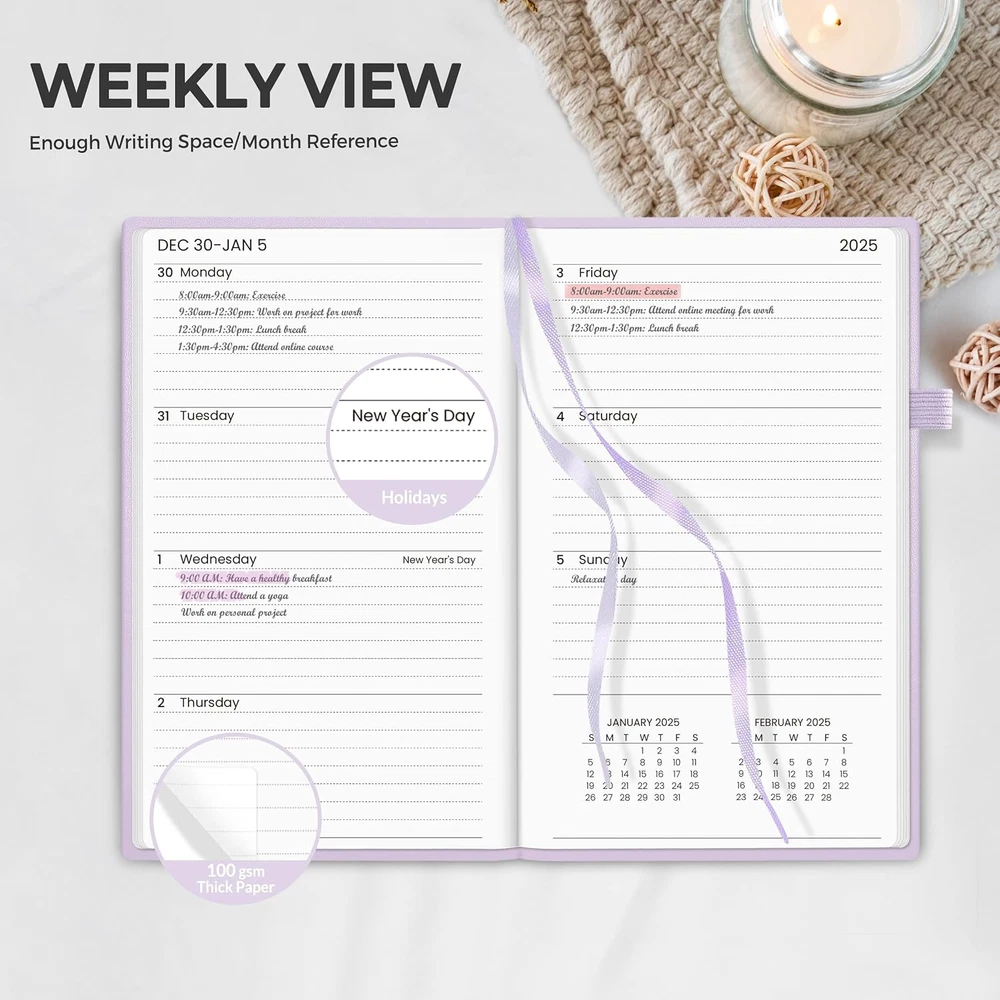 Menu Other Items Feedbacks About Us Contact Us Add To Favorites 2025 Pocket Weekly Planner for Purse 3.5" X 6" - 12 Month (January 2025 - December 2025), Pocket Size Planner, Hardcover, Notes, Pocket, 100 GSM Paper, Purple 2025 Professional Planner - Cover from January 2025 to December 2025, Features 12 months of monthly and weekly pages, and also includes 3 extra monthly pages for October to December 2024 for all your planning and scheduling needs, and measures 3.5" x 6" Monthly View - Each date box provides ample writing space, daily blocks with popular holidays for easy long-term project and appointment scheduling. 2 ribbon bookmarks and bonus monthly stickers for easy navigation and finding. Weekly View - 2-page weekly spread from Monday to Sunday provides generous lined writing space along with popular holidays and month reference previews, allowing for easy appointment, note, and daily task management. Fight Ink-bleeding Thick Paper - Made with heavyweight 100g paper to prevent ink bleed. The pocket size planner perfectly fits your purse for easy organization and scheduling on the go. Sturdy planners withstand frequent transfers in and out of backpacks, briefcases, and cars. Additional Features - The weekly planner includes 2025-2027 calendars, holiday lists, contact pages, notes pages, important dates, and US time zone map. Product Description 1 Perfect Work Planner 2 Family&School Organizer 3 Easy to Carry SUNEE‘s Selection For You Add to Cart Add to Cart Add to Cart Add to Cart Customer Reviews 4.6 out of 5 stars 516 4.6 out of 5 stars 516 4.6 out of 5 stars 516 4.6 out of 5 stars 516 Price $9.99 $ 9 . 99 $9.99 $ 9 . 99 $6.99 $ 6 . 99 $7.99 $ 7 . 99 Time JAN 2025 - DEC 2025 JAN 2025 - DEC 2025 JAN 2025 - DEC 2025 JAN 2025 - DEC 2025 Size 5.5" x 8.3" 5.5" x 8.3" 3.5" x 6" 3.5" x 6" Color Purple Sage Green Purple Black Cover Material Vegan PU Hardcover Vegan PU Hardcover Vegan PU Hardcover Vegan PU Hardcover Ribbon Bookmark ✔ ✔ ✔ ✔ Item Specification Sheet Size 3.5 ×6 Inches Calendar Type Weekly/Monthly Format Organizer, Notebook Color Purple Binding Hardcover Material Paper Material Type Paper Manufacturer Part Number S-W2541 Package Dimensions 6.22 x 3.66 x 0.67 inches Item Weight 5.3 ounces Year 2023 Target Audience Adult, Student Cover Material Leather" or "Cardstock Size 3.5"x6" Dimensions Shipping Returns Additional Info Product Dimensions: 3.66 inches x 6.22 inches x 0.67 inches. Weight: 5.3 oz Fast shipping is very important for us. Our standard shipping service is FREE. Your order will be shipped within 1-3 business days upon full payment received. Most items are delivered within 3-5 business days, however, please allow 3-10 business days. We are shipping only to USA. We only ship to the confirmed Paypal address. We reserve the right to cancel any order for any reason at any time. We are not responsible for undeliverable addresses. We offer a 30 day return policy from checkout winning date. Your satisfaction is guaranteed! If for any reason you are unhappy with your item, just return it within 30 days for a full refund, minus shipping cost. Please contact us prior to initiating a return so that we can issue you a refund authorization. Items defective upon receipt must be packaged in their retail packaging as if new and returned with a detailed description of the problem. Return shipping fees are not refundable. We reserve the right to decline any returns if the above guidelines are not followed. All of our items, unless otherwise stated, will only run on 120 volts. Please check to make sure your country complies with these specifications. If you have a problem or question regarding your transaction please contact us before leaving any type of feedback. We will work with you to resolve any problem you may have.