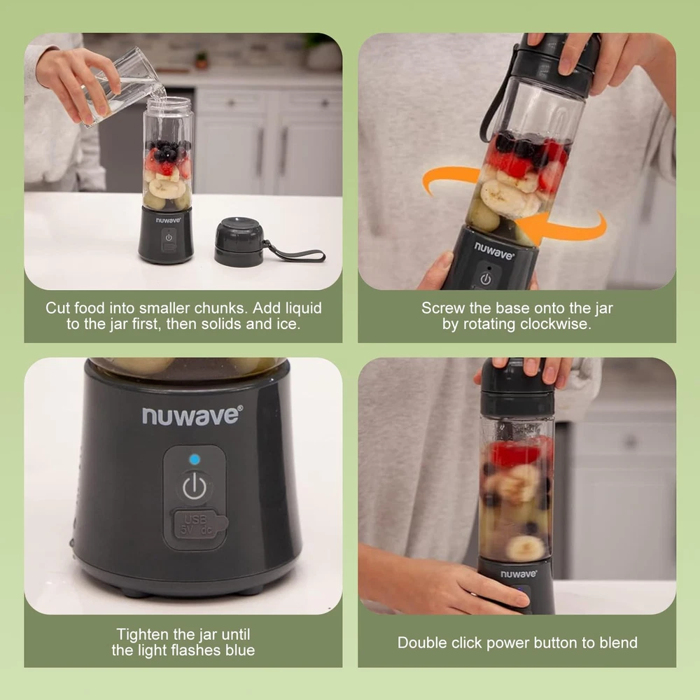 300W Smoothie Blender: Smoothie blender adopts 300 watts powerful motion motor, rotating speed to 20000 rpm, with 6-leaf stainless steel blades, easily crushing ice cubes fruits and vegetables, perfect for making nutritious, healthy shakes and smoothies only 30 seconds!(Please don't blend while charging) portable blender for shakes and smoothies. Blend And Go: Blend fruit smoothies, shakes, and your favorite icy drinks right in the 16 oz BPA-free travel jar. The personal blender jar comes with a carry loop, making it a convenient to-go cup. It’s lightweight at only 1.8 pounds, slightly less than half the weight of a 2-liter bottle of cola and fits most car cup holders. Food Grade Material: The shake blender parts are BPA free Tritan, and the blades are made of food-grade 304 stainless steel, which is wear-resistant, low-temperature resistant, healthy to ensure healthy drinking. Enjoy tasty & healthy homemade beverages everywhere. A USB charging port powers your blender for 20+ 30-second blending cycles on a full charge.** **In tests with a new, fully charged unit using 12oz of water in continuous back-to-back blending cycles, the blender completed 34 cycles before the power ran out. Results may vary depending on ingredients. Easy and Fast Cleaning: While the blending jar and lid are dishwasher-safe, we recommend a quick rinse first. Then, fill the jar with water and detergent and let the blender do the work. Remember to keep the base out of the dishwasher to extend its longevity.