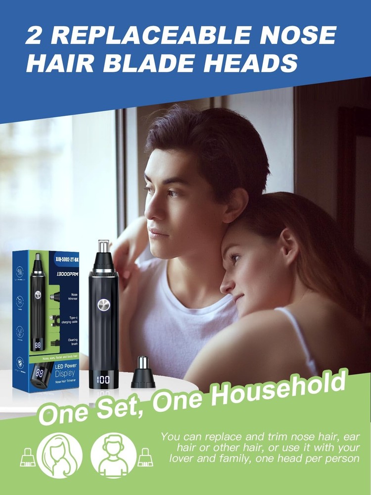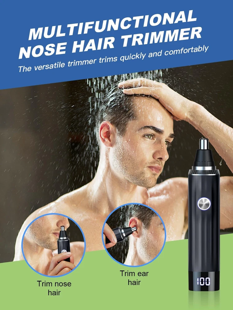 Are you tired of unruly nose hair, ear hair, and unwanted facial hair that affects your appearance and confidence? We have the perfect solution for you with our 2023 model Nose Hair Trimmer. It's a grooming tool that combines versatility, safety, and convenience to ensure you always look your best.Versatility in Grooming: This nose hair trimmer is not limited to just nose hair; it's a true all-in-one grooming companion. With its adaptive trimming system, it effortlessly handles nose hair, ear hair, eyebrows, beards, and facial hair. Say goodbye to unwanted hair and hello to a refined appearance. It's perfect for both men and women, ensuring a polished look every time.Safe and Painless Grooming: We understand the importance of a painless and irritation-free grooming experience. Our trimmer features a hypoallergenic stainless steel tip that prevents pulling, tugging, or scratching. The dual-edge stainless steel blade system with a 360° internal rotation design ensures efficient, painless, and residue-free cutting. It's gentle on your skin, ensuring a comfortable experience.Elevate your grooming routine with our multifunctional Nose Hair Trimmer. It's a grooming tool that embodies precision, convenience, and customer care. Make it yours today and always present your best self with confidence. 2 Interchangeable Heads & Multifunctional: 2024 Professional Wireless Nose Hair Trimmer, precisely removes nose hair, ear hair, eyebrow hair, beard, and facial stray hair. You can use it with your family, ensuring a confident appearance at all times Powerful Copper Core Motor & Painless: Allergy-resistant stainless steel nose hair trimmer features an upgraded copper-core motor, delivering power to the 360° rotating dual-blade system with a premium 13,000 RPM motor. Equipped with precision 360° dual-edge stainless steel blades, it smartly trims hair with accuracy. Designed to snugly fit the nasal cavity, it avoids pulling or damaging nose hair. Enhanced allergy resistance ensures a safer and more comfortable trimming experience Rechargeable with Type-C & Large Capacity Battery: nose hair trimmer features a uniquely designed USB charging interface, prioritizing charging safety by guarding against risks such as overvoltage, overcharging, and short circuits. Its powerful fast-charging capability allows it to reach full charge in just 2 hours, eliminating the hassle of frequently replacing AA batteries and significantly enhancing user convenience Newly Upgraded Digital Display Screen: nose hair trimmer is equipped with a digital LED screen, allowing users to effortlessly monitor the battery level and eliminating concerns about battery depletion during use. Its professional noise reduction design ensures that the noise level is lower than buzzing vibrations, considerately avoiding any disturbance to family members' sleep in consideration of the user's environment Portable & Durable: nose hair trimmer adopts an integrated design, presenting a compact pen-like appearance that is easy to carry and space-saving. It effortlessly fits into bags or travel cases, making it ideal for on-the-go use during trips. The sturdy body is crafted from high-quality ABS material, providing a lightweight and durable feel that is resistant to wear and tear, ensuring the product's longevity and minimizing the risk of scratches Best Gift: nose hair trimmer comes with a USB charging cable, allowing users to easily charge it using a power bank, laptop, or phone charger for added convenience. Its user-friendly design is suitable for both men and women, making it not only a practical choice but also a thoughtful gift option that brings practical convenience to friends and family IPX7 Waterproof & Easy to Clean: nose hair trimmer's blade is waterproof, making it easy to dismantle and clean for ensured hygiene. Additionally, the trimmer is equipped with a dedicated dust cover to effectively prevent the accumulation of dust, maintaining the product's cleanliness. This feature ensures users a healthier and more reliable grooming experience