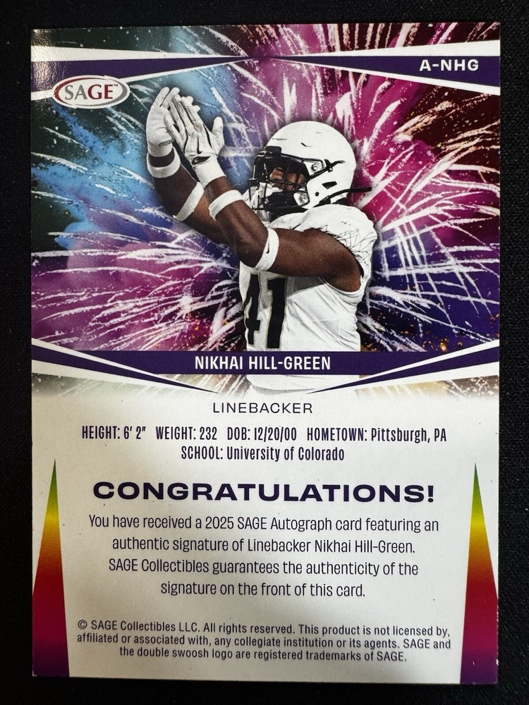 This limited edition 2025 Sage Low Series sports trading card features Nikhai Hill-Green of the Colorado Buffaloes. The card is autographed by the player himself, making it a valuable addition to any collection. With its short print and exclusive collectors edition, this card is a hot SP! for sports trading card enthusiasts. The card number is A-NHG and it comes from the NCAA League. Manufactured by SAGE, this card is a 1st edition and also features memorabilia from the player. Don't miss out on the chance to own this rare and highly sought-after card.