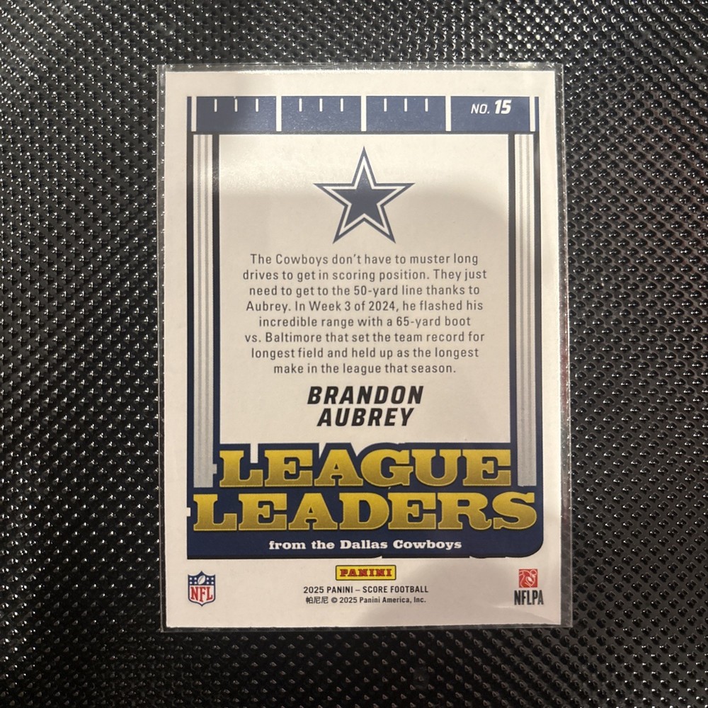 The 2025 Score Brandon Aubrey League Leaders trading card is a standard-sized football card featuring an autograph from Craig Morton. Manufactured by Panini, this card is part of the 2025 Score set and is an insert in the League Leaders subset. Signed with a label or sticker, the card showcases the Dallas Cowboys player in the National Football League (NFL) and is a unique collectible for fans and collectors alike. With a 20 Pt. card thickness and made of card stock, this original sports trading card is a valuable addition to any football card collection.