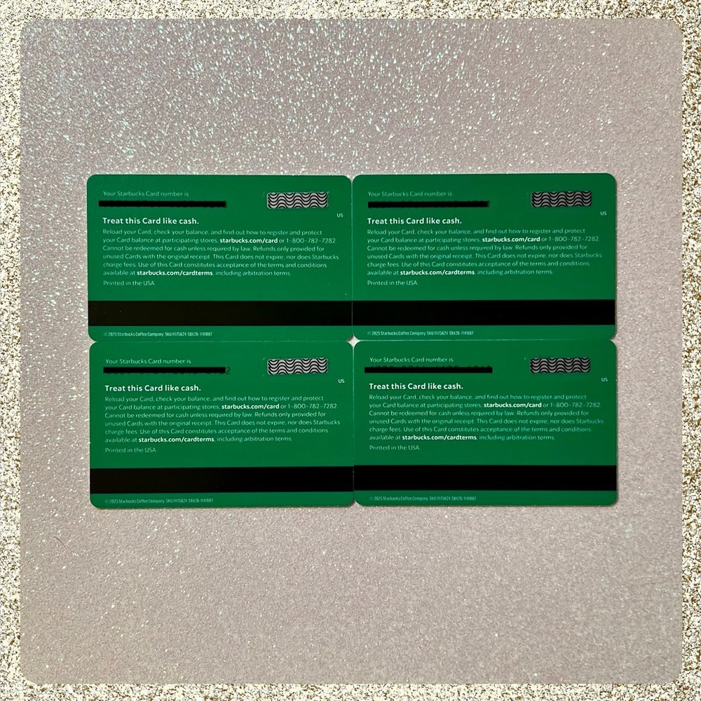 This listing is for a set of 4 2025 Christmas/Holiday Gift Cards with the mag strip on the back. They are in mint condition. The cards are brand new with the pin still in tact. It has no stored value at this time, but you can load money to the cards at a Starbucks store or at Starbucks.com. Buy with confidence. I have 100% feedback :)