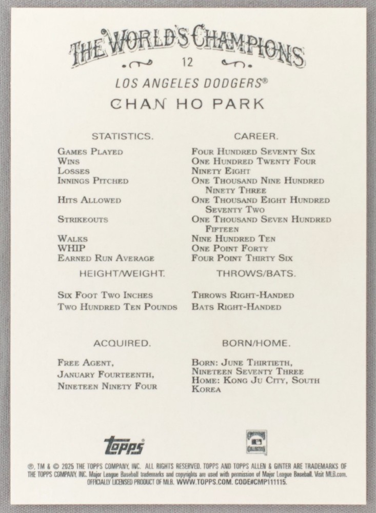 The product is a 2025 Topps Allen & Ginter trading card featuring Chan Ho Park of the Los Angeles Dodgers. This sports trading card is part of the Major League Baseball league and belongs to the 2025 season. Manufactured by Topps, this card is a collectible item for fans of baseball and sports trading cards. It showcases the player in his Los Angeles Dodgers uniform and is identified by the card number 12.