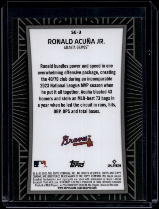 This limited edition 2025 Topps Chrome Baseball card features Ronald Acuna Jr. with a stunning Shadow Etch design. A must-have for any MLB fan or trading card collector, this card is a rare find that showcases one of baseball's brightest stars. Don't miss your chance to own a piece of history with this unique and highly sought after trading card.