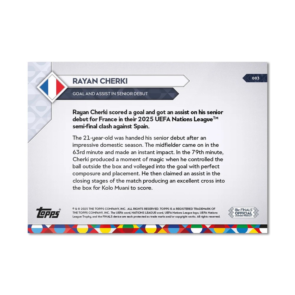 π¨ PRESALE β Will ship once received from Topps (ETA late June) π¨ This is the official 2025 Topps Now UEFA Nations League card #003 , featuring Rayan Cherki 's senior debut for France β with a goal and an assist against Spain in the semi-finals. Card #: 003 Player: Rayan Cherki π«π· Match: Spain vs France β 06/05/25 Highlight: Goal and Assist in Senior Debut Condition: NM/Mint β Will ship pack fresh Official Topps UEFA Nations League Release β Debut Insert At just 21, Cherki came off the bench to score a stunning volley and provide a late assist for Kolo Muani, instantly announcing himself on the international stage. π¦ Expected shipping: 2β3 weeks after Topps ships to sellers
