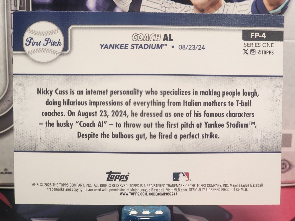 This 2025 Topps Series 1 trading card features a beautiful pink parallel/variety design, making it a must-have for any baseball fan or collector. The card number is FP-4 and it depicts Coach Al giving his first pitch. The card is part of the 2025 Topps set and is perfect for those who love sports trading cards. This card is manufactured by Topps and is of excellent quality. It is a great addition to any collection and is sure to be a conversation starter. The card is also a great gift for any baseball fan or collector. Don't miss out on this rare and unique card.