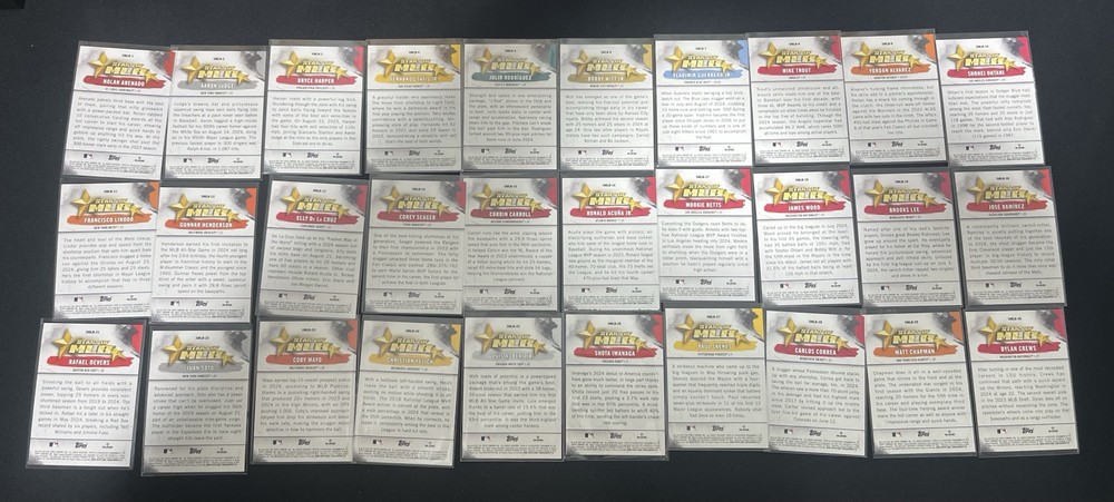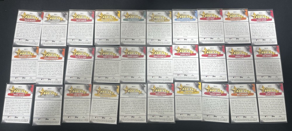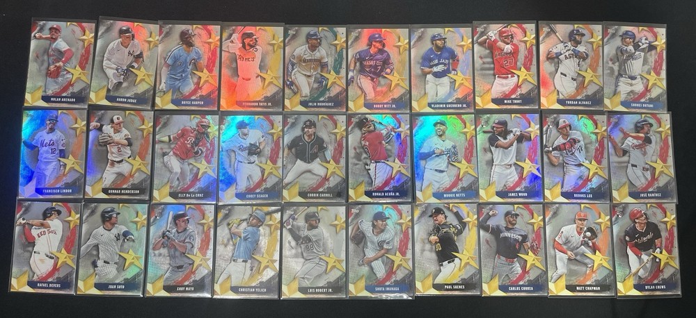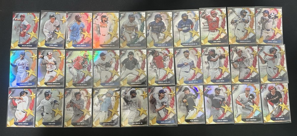 The 2025 Topps Series 1 ⭐️Stars Of MLB⭐️ Set #SMLB1-30 features a collection of 30 standard-sized baseball trading cards showcasing various Major League (MLB) players. These cards are crafted from card stock and are original pieces licensed by Topps. The set is based on the MLB World Series event, with cards depicting players from different teams in the 2025 season. Each card is in English and bears the Topps autograph authentication, manufactured in the United States.