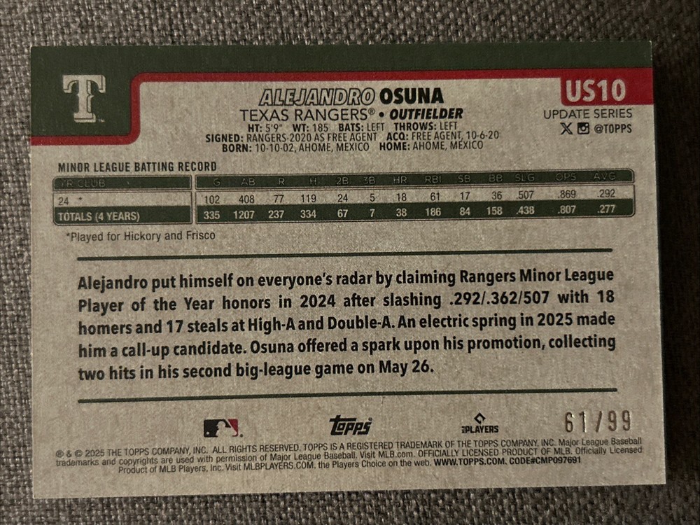 The product is a 2025 Topps Update Series baseball trading card featuring Alejandro Osuna of the Texas Rangers. This particular card is part of the vintage stock insert set and has a limited print run of only 99. The card is manufactured by Topps, is made of standard card stock, and is in near mint or better condition. It is a standard-sized sports trading card with 20 Pt. thickness and is part of the base set for the 2025 season of Major League Baseball. This original card is a valuable addition to any baseball card collection.