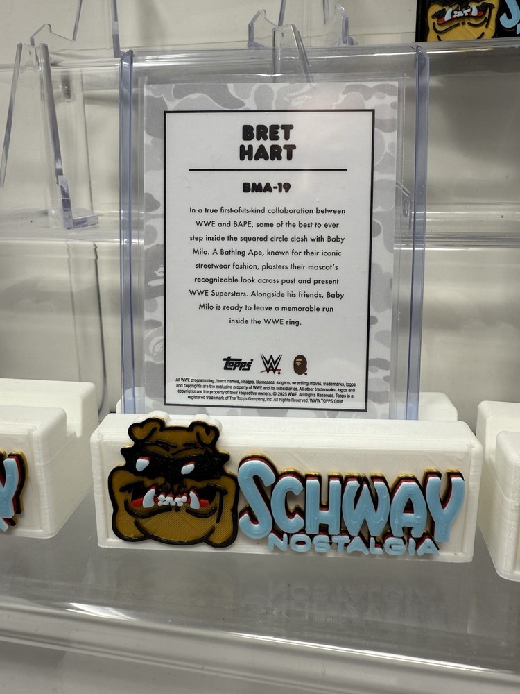 The product is a limited edition 2025 Topps WWE x BAPE trading card featuring Bret Hart in the Baby Milo insert set. This card showcases a black and white camo design, with a card thickness of 35 Pt. and is made of card stock. It is a standard size card and is part of the original 2025 Topps WWE x BAPE set. This collectible piece celebrates the World Wrestling Championship and is a must-have for fans and collectors of wrestling memorabilia.