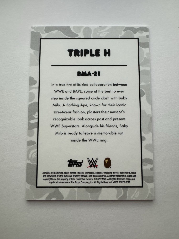 The 2025 Topps WWE X BAPE Triple H Baby Milo Insert is a standard-sized sports trading card featuring the wrestler Triple H. Manufactured by Topps in 2025, this original card is part of the 2025 Topps WWE set and is made of card stock. The insert card showcases Baby Milo, a popular character within the wrestling universe, and is sure to be a collectible item for fans of WWE and wrestling in general. With its unique design and inclusion of a top athlete like Triple H, this card is a valuable addition to any wrestling card collection.