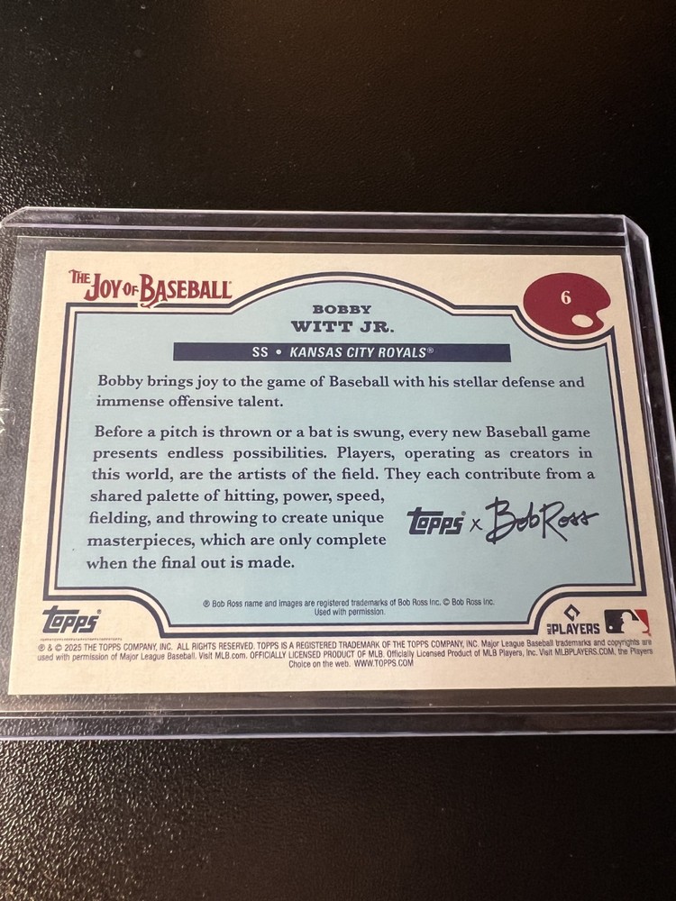 The product is a 2025 Topps X Bob Ross the Joy of Baseball trading card featuring Bobby Witt Jr. of the Kansas City Royals. This limited edition card is a Prussian Blue parallel with a print run of only 50. Made of card stock with a thickness of 20 Pt., this original sports trading card is part of the 2025 set and is serial numbered. The card showcases Bob Ross's iconic style of incorporating joy and creativity into the art of baseball, making it a unique and desirable collectible for fans and collectors alike.