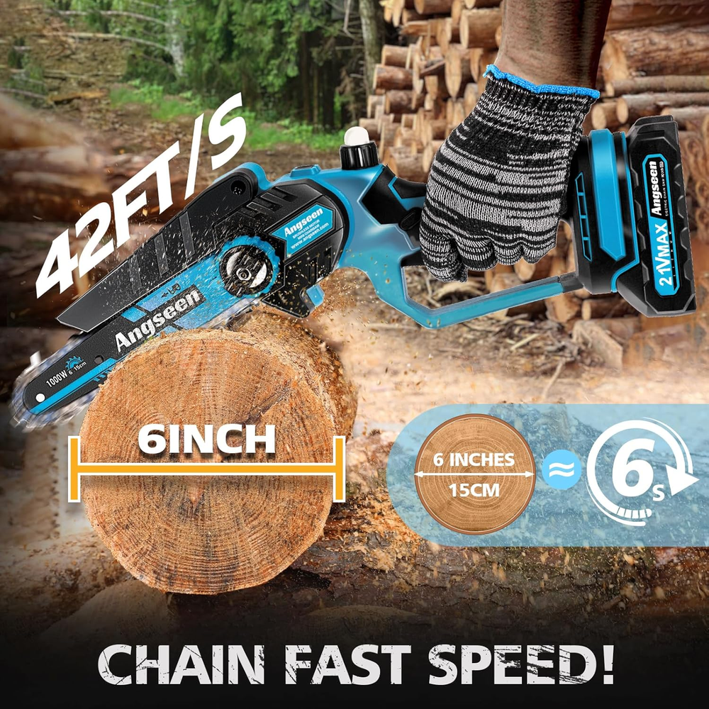1000W Powerful Brushless Motor: Angseen mini chainsaw is equipped with a 1000W powerful brushless motor, with a cutting speed of up to 42FT/S. It can effortlessly cut through 6-inch wood in just 6 seconds, representing a 30% increase in efficiency compared to traditional pure copper motors with brushes. Additionally, due to the brushless motor’s fewer moving parts and reduced friction, the electric chainsaw cordless operates more stably and safely, without overheating or burning. Its lifespan is also extended by 5 to 7 years compared to pure copper motors Rechargeable Large Capacity Batteries: Angseen mini chain saw battery powered comes with 2x 21V 2000mAh removable & rechargeable lithium batteries, providing a runtime of up to 70 to 90 minutes. This ensures uninterrupted operation and eliminates worries about running out of power. The batteries charge fully in just 1.5 hours, ensuring convenience and speed. For best performance, fully charge the batteries before extended periods of non-use Manganese Steel Chain with Tool-free Adjustment: This mini chainsaw cordless has a high-quality manganese steel chain, deeply quenched for smooth cutting. It easily cuts through thicker wood that other chainsaws struggle with, making it ideal for tree branches, tree trimming, wood cutting, camping, and gardening. Unlike other mini chainsaw that need a screwdriver for adjustment, ours allows tool-free tension changes by turning the knob on the chainsaw, saving you time with quick and easy operation Automatic Oil Filling System: Our small cordless chainsaw features an automatic lubricating chain system. Simply pour regular motor oil into the oil tank and press the bubble hole to lubricate the chain, reducing wear and ensuring smoother cutting. A single oil filling can last an entire day, eliminating the need to carry a heavy bottle of lubricating oil 5 Safety Designs: 1.Safety Lock: prevents accidental activation (press the safety lock and start button simultaneously to start the chain saw); 2.Safety Baffle: prevents wood from splashing outward; 3.Goggles: provided to protect your eyes from dust and wood chips; 4.Gloves: equipped to protect your hands during operation; 5.Non-slip Textured Handle: ensures a secure grip to prevent accidental slipping while working What you get: 2x 2000mAh batteries, 2x chains (one pre-installed), 1x charger, 1x gloves, 1x goggles, 1x oil bottle (excluding oil), 1x brush, 1x carrying case, 1x user manual Product Description