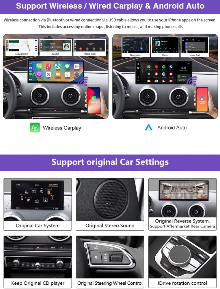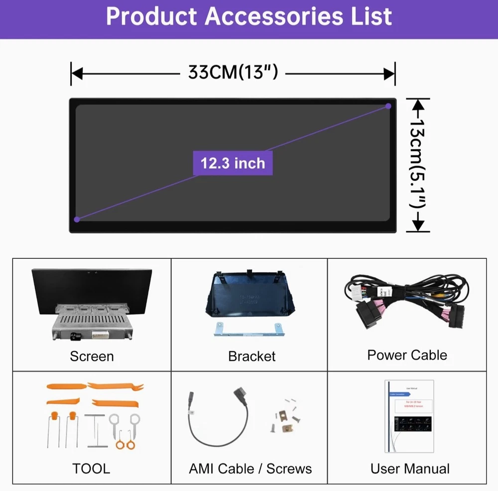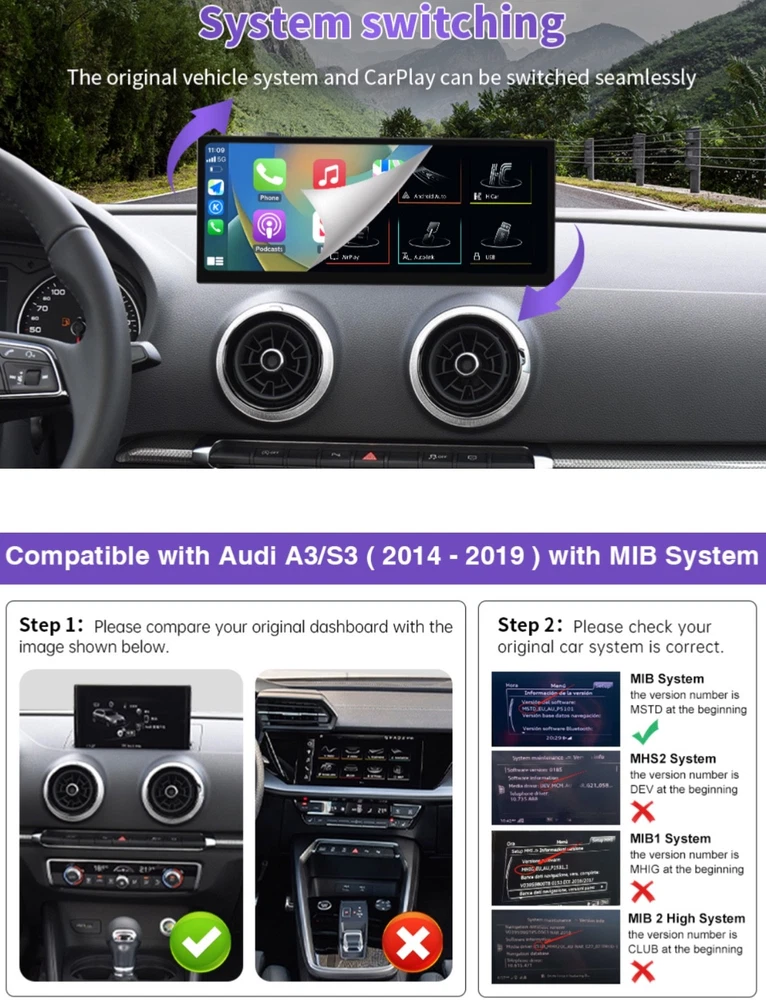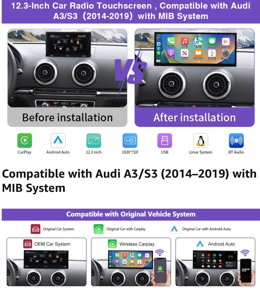 #2783 2025 Upgraded 12.3" Ultra-Narrow Touchscreen Wireless CarPlay Android Auto Receiver Compatible with Audi A3/S3 (2014–2019), for MIB System Brand ninetom Item Weight 2.35 Kilograms Manufacturer ninetom 【Pre-shopping Notes】This touchscreen is compatible with A3/S3 (2014–2019) with MIB system. Not compatible with other systems. Please confirm your car has MIB system before purchase. The unit runs on a Linux system, providing stable performance without freezing or lag even during long-term use. 【Upgraded 12.3" HD Touchscreen】This latest-generation 12.3-inch touchscreen features a high-definition 1920×720 IPS display with ultra-narrow bezels and a premium aluminum body. It upgrades the original screen while maintaining full compatibility with the factory system. The IN-CELL full lamination technology enhances clarity by eliminating air gaps, while the anti-reflection layer reduces glare by up to 75% for better visibility in sunlight. 【Built-in Wired & Wireless CarPlay/Android Auto】 Supports both wired and wireless CarPlay & Android Auto for GPS, calls, messages, music, and more via Siri or touch. Use Siri/Google Assistant hands-free for navigation, contacts, and notifications. Also supports screen mirroring for videos, maps, and other smartphone features on your car display. 【Supports Original Functions】The upgraded touchscreen retains all original car functions, including the radio, amplifier, joystick controls, and reversing camera, without altering the vehicle’s software. It supports both original and aftermarket features while adding Linux system enhancements for an improved experience. 【Dual System Switching】Easily switch between the Linux interface and your car’s original system with one click. The capacitive touchscreen keeps all factory functions—radio, controls, gauges, alerts, and reversing camera—while adding Linux features without altering the car’s original software or controls. 【1-Year Warranty & Installation Assistance】Installation won’t damage original wiring or affect your factory warranty. Professional installation is recommended if unsure. Contact us anytime—our team has more experience than most repair shops. Dashboard removal is needed for wiring. Most issues come from cable or setting errors, which we’ll help fix. Test all functions before reassembly.