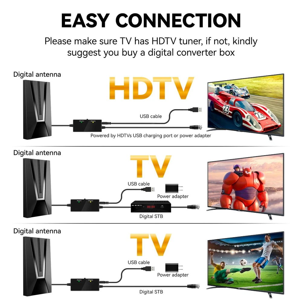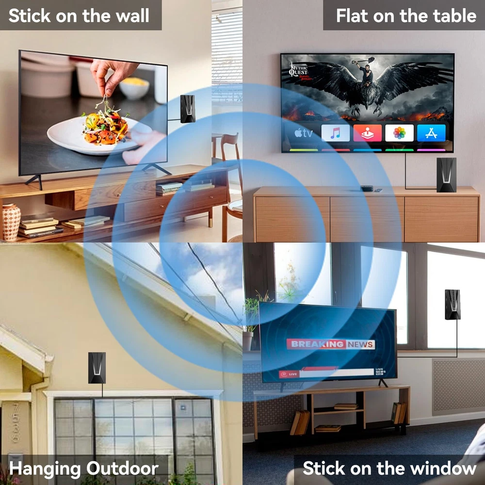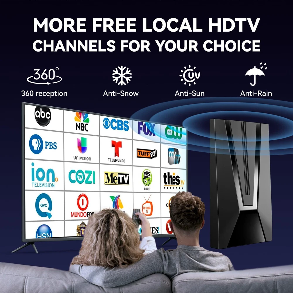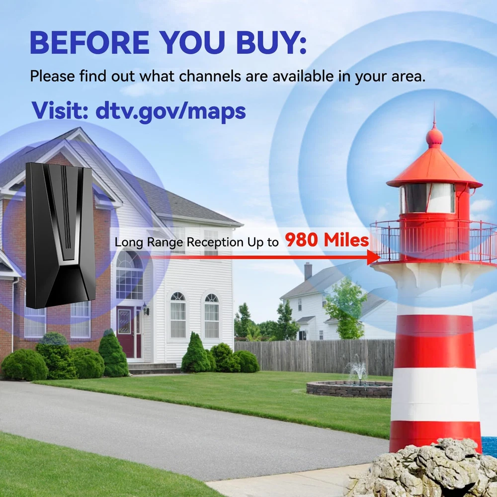 Never Pay Monthly Bill - Say goodbye to expensive traditional cable bills with our new upgraded high technology TV antenna. It's compatible with TV converter boxes and hundreds of digital Televisions/4K Ultra high definition (4K UHD), offering access to a plethora of HD channels including CW, Fox, AMC, ABC, Hulu, Netflix, ESPN, CBS, NBC, PBC and more. You can watch news/movies and any your favorite programs, enjoy free for life HD local channels, can save up to $3,000 a year! Up To 980 Miles Range Reception - TV antenna support super distance 980 miles reception and 360° reception around your HDTV. You can receive stable signals even in bad weather! Advanced signal booster optimize the signal transmission protection against interference with other signals, which can make sure you can get more channels even you are far away broadcast towers. Please switch the amplifier to "short range" if your house is very close to the broadcast tower (within 35 Miles). Full HD Crystal TV & Upgraded Smart IC Chip - Adopted powerful amplifier signal controller, built-in newest generation smart IC chip and crystal clear filter technology to pick up signals. The new technology filters out cellular and FM signals resulting in clearer pictures, low noise and access to more free broadcast TV signals with enhanced gain, range and frequency performance. No monthly contract and potentially save thousands of dollars a year! 35FT Coaxial cable & Easy to Install - Extra long high performance coaxial cable ensures Antenna can be placed anywhere in your home for the best signal and the strongest reception. Connect the antenna to 'Ant In' On the back of any HDTV Place the antenna in the desired location and scan for channels on your television menu. NOTE: Please re-scan for channels after each moving the tv antenna. Please visit "dtv gov maps'' information for the available channels in your location. 100% Satisfaction Guaranteed - We rigorously test our products to ensure top performance and provide lifetime professional technical team support! We are trying our best to make every customer satisfied, we will provide intimate service, if you aren't satisfied for any reason or have any questions about the product, please contact us when you receiving your antenna, we will give the best solution.