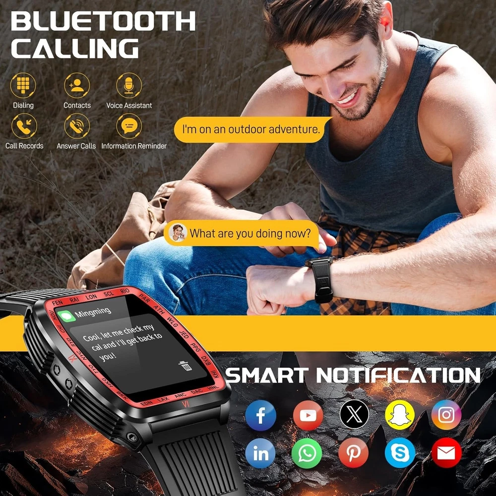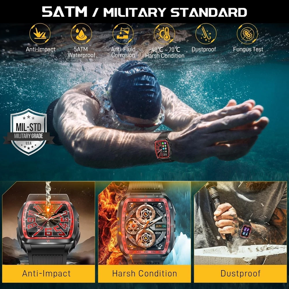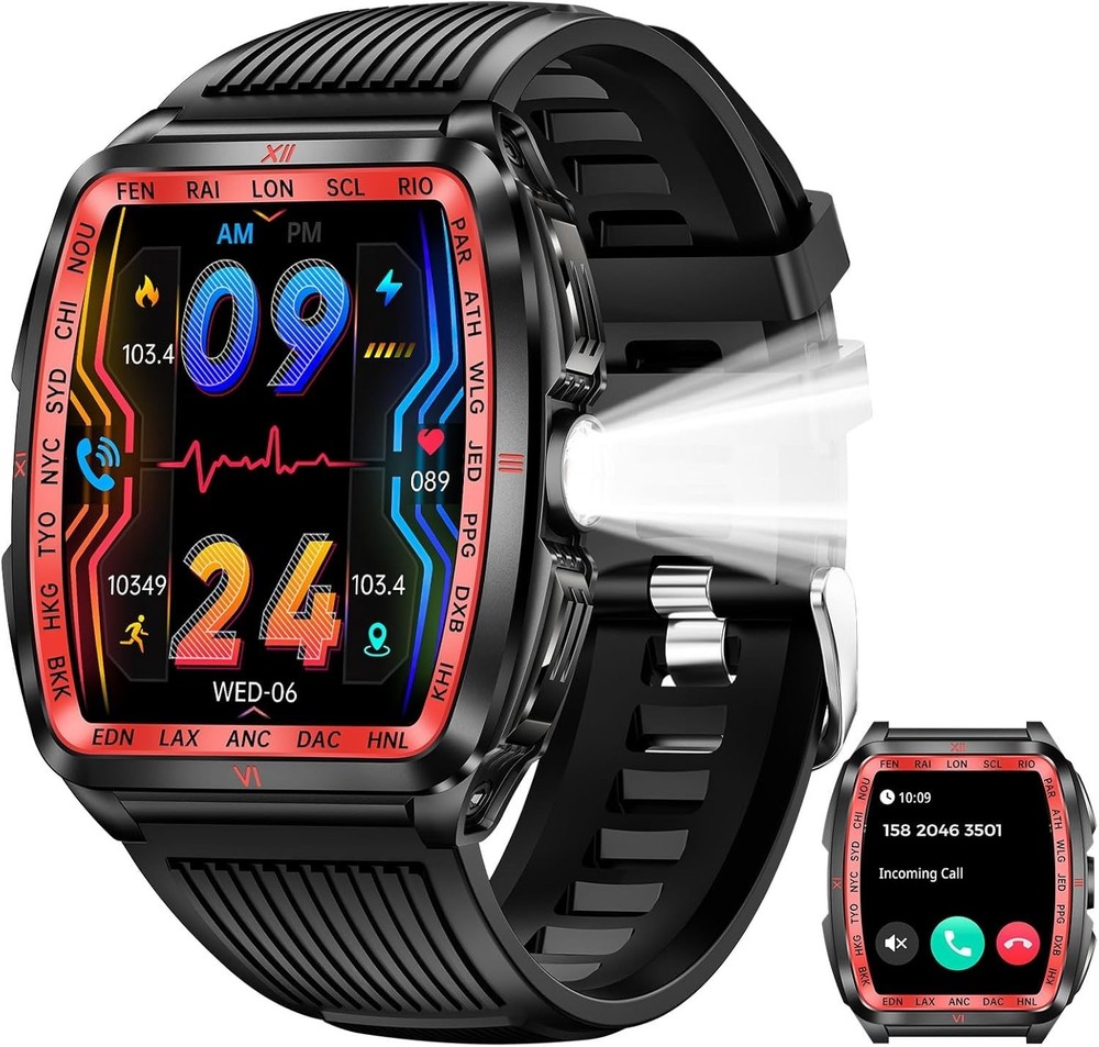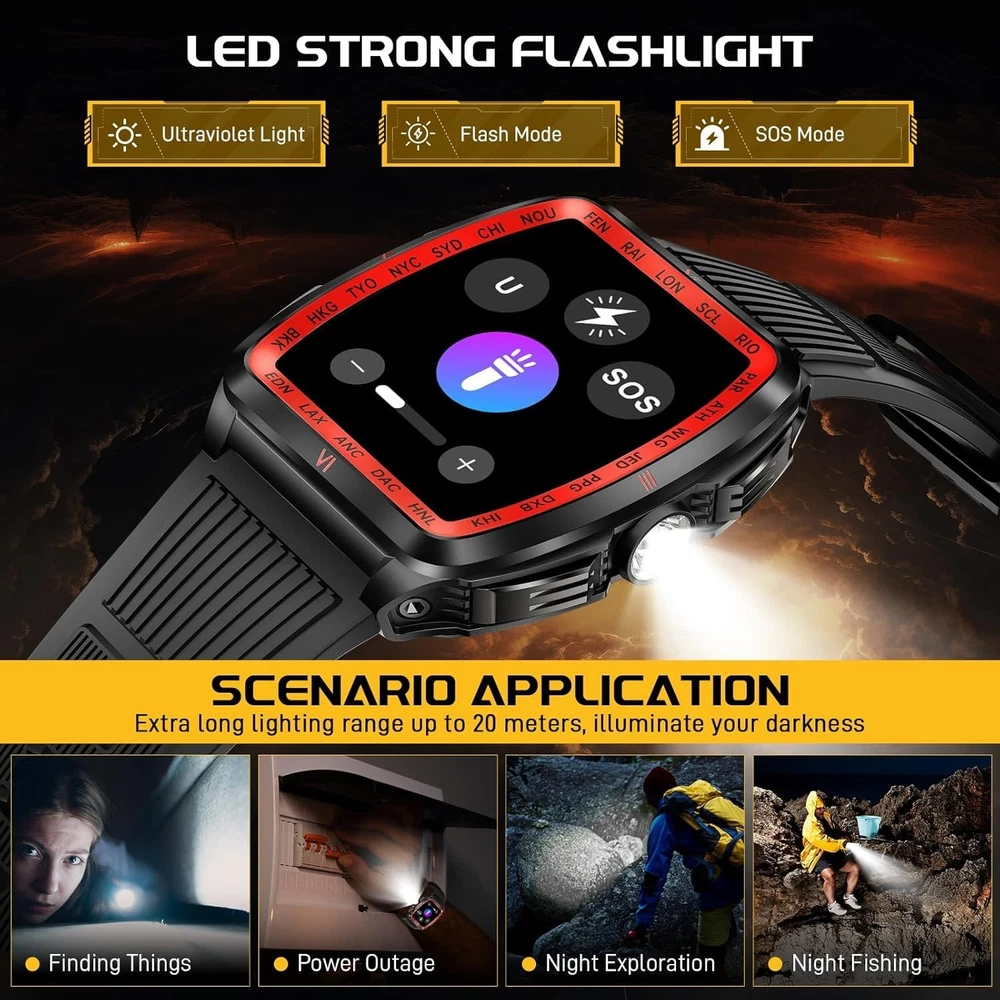 From the brand Previous page Next page Product Description KELEEL Military Smart Watch for Men 5ATM Waterproof with LED Flashlight/UV Light Click to play video KELEEL military smart watches are uniquely designed with a novel appearance that ensures functional versatility while maintaining its ruggedness. KELEEL men's smartwatches are a reliable companion for everyday life or outdoor adventures. Previous page Next page 1 100+ Sports Modes 2 Health Monitoring 3 Sleep Monitoring Super Strong LED Flashlight with Multiple Light Modes Previous page Next page KELEEL military smartwatch comes with a super powerful LED flashlight with a range of up to 20 meters. The flashlight of this military smartwatch has multiple selectable modes (bright mode, flash mode, SOS mode, UV), which makes it very useful for a wide range of scenarios. KELEEL military smart watch for men has passed a number of military-grade tests for extreme temperatures, low pressure, salt spray, liquid contamination, and more. It is suitable for any outdoor sports and harsh working environment, very rugged and durable. Previous page Next page HD Big Screen Large Battery 200+ Dials & DIY Multifunction 5ATM Deep Waterproof Design The smart watch body shell has been sprayed and engraved three times, and is 50 meters deep waterproof, so you can swim or shower without worry. Previous page