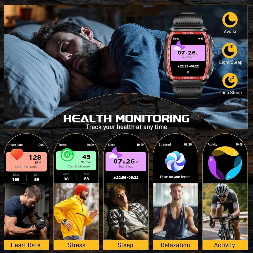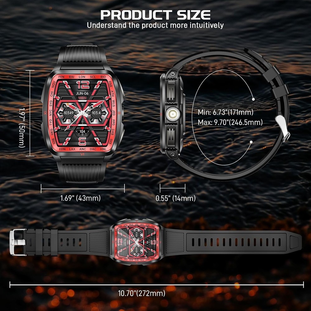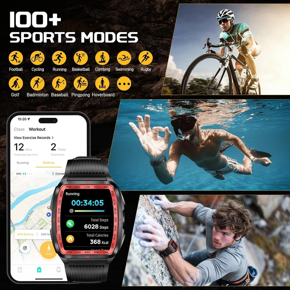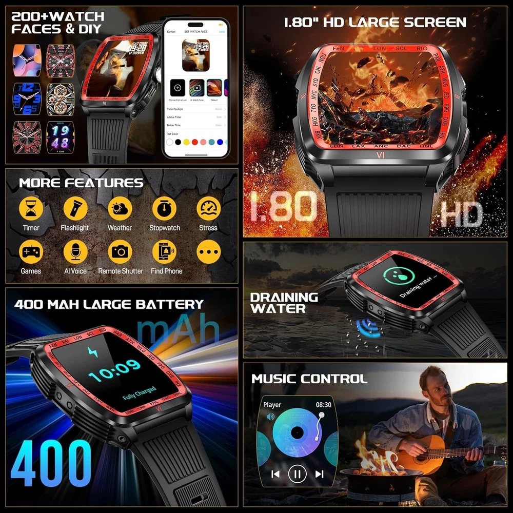 From the brand Previous page Next page Product Description KELEEL Military Smart Watch for Men 5ATM Waterproof with LED Flashlight/UV Light Click to play video KELEEL military smart watches are uniquely designed with a novel appearance that ensures functional versatility while maintaining its ruggedness. KELEEL men's smartwatches are a reliable companion for everyday life or outdoor adventures. Previous page Next page 1 100+ Sports Modes 2 Health Monitoring 3 Sleep Monitoring Super Strong LED Flashlight with Multiple Light Modes Previous page Next page KELEEL military smartwatch comes with a super powerful LED flashlight with a range of up to 20 meters. The flashlight of this military smartwatch has multiple selectable modes (bright mode, flash mode, SOS mode, UV), which makes it very useful for a wide range of scenarios. KELEEL military smart watch for men has passed a number of military-grade tests for extreme temperatures, low pressure, salt spray, liquid contamination, and more. It is suitable for any outdoor sports and harsh working environment, very rugged and durable. Previous page Next page HD Big Screen Large Battery 200+ Dials & DIY Multifunction 5ATM Deep Waterproof Design The smart watch body shell has been sprayed and engraved three times, and is 50 meters deep waterproof, so you can swim or shower without worry. Previous page