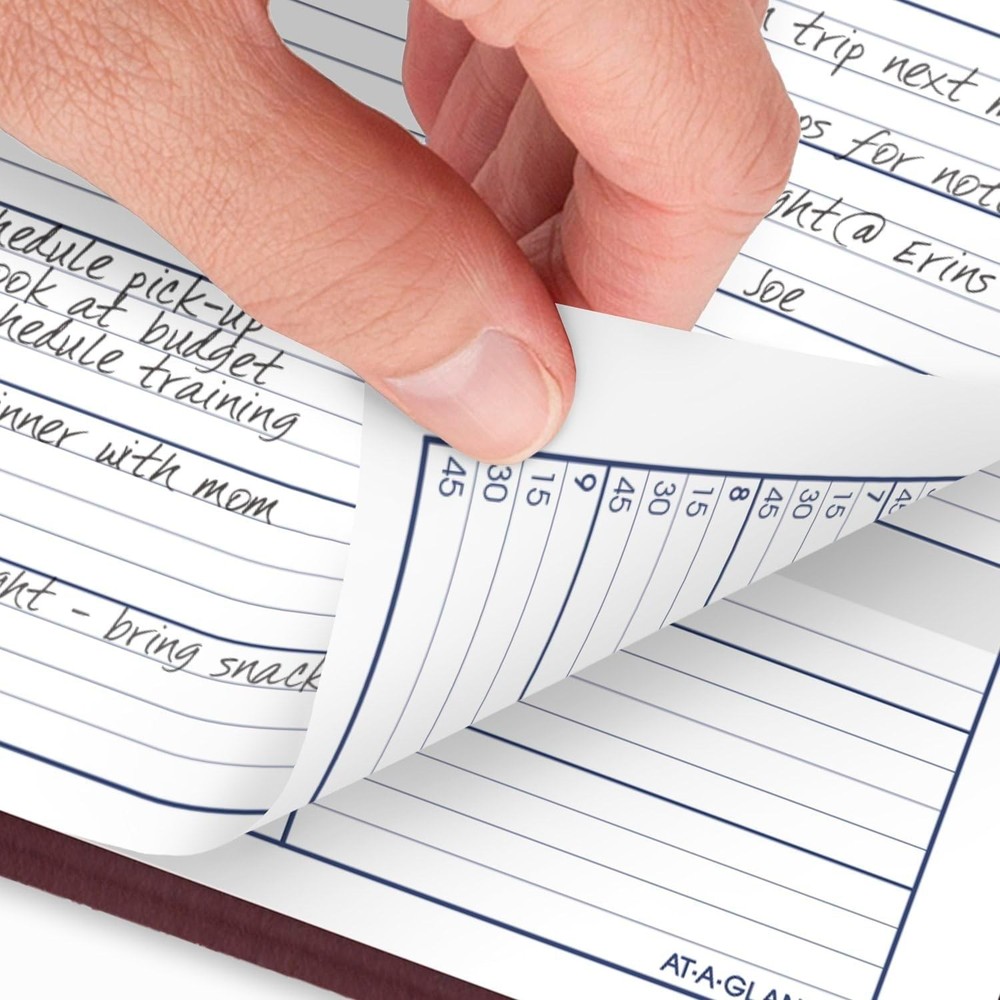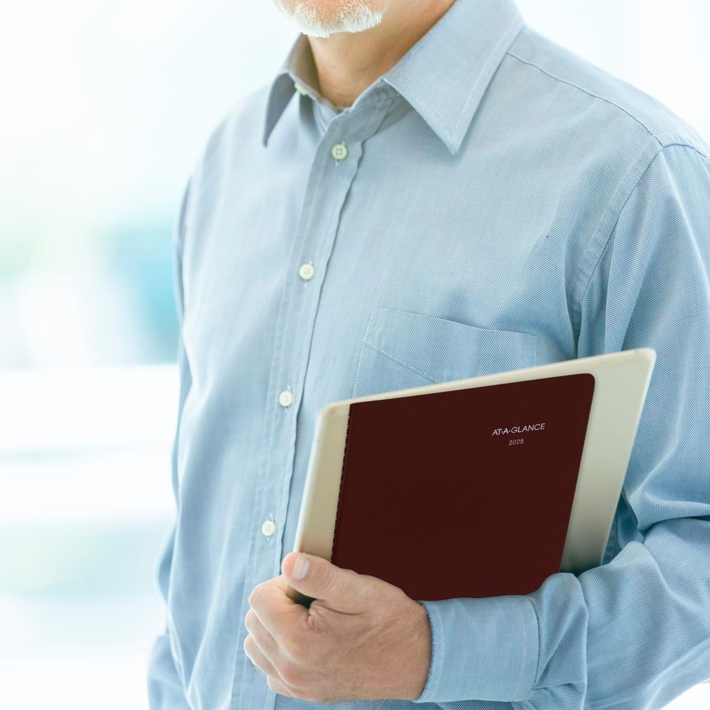 AT-A-GLANCE 2025 Appointment Book Planner, Weekly, 8" x 11", 8 x 11, Burgundy Product Details Manufacturer: ACCO Brands Brand: AT-A-GLANCE Item Weight: 10.6 ounces Product Dimensions: 18.69 x 10.56 x 12.12 inches Item model number: G5201425 Color: Burgundy Cover Material: Faux Leather Material Type: Paper Number of Items: 1 Size: 8 x 11 Sheet Size: 8 x 8 inches Ink Color: Black Manufacturer Part Number: G5201425 Brand: AT-A-GLANCE Color: Burgundy Cover Material: Faux Leather Format: Notebook, Organizer Calendar Type: Weekly Target Audience: Teacher, Adult, Student Sheet Size: 8 x 8 inches Material: Paper Binding: Spiral-bound Special Feature: Not_Performance_Used YEAR ROUND PLANNING – Planner covers a 12-month date range from January 2025 — December 2025 with Julian dates INK BLEED RESISTANCE – Plan your schedule without fear of distracting ink bleeding. Our high-quality paper is designed for ink bleed resistance, which keeps plans neat and legible. WEEKLY VIEWS – One week per two page spread features ruled hourly appointment times from 7:00 a.m. — 9:45 p.m., Monday — Friday and 7:00 a.m. — 6:35 p.m. on Saturday. Sundays are untimed. Pages measure 8" x 11". SPECIAL FEATURES – Includes a 3-year reference calendar, personal information and important dates PROFESSIONAL DESIGN – Planner has a durable burgundy cover and twin wire binding to help prevent snags and secure pages ASSEMBLED IN THE U.S. – Thoughtfully designed and assembled in the U.S. using high-quality materials Confidently face every deadline this year with the AT-A-GLANCE DayMinder Weekly Appointment Book Planner. Date range covers 12 months from January 2025 — December 2025 with Julian dates. Guaranteed to last all year.* Plan your schedule without fear of distracting ink bleeding. High-quality paper is designed for ink bleed resistance, which keeps plans neat and legible. One week per two page spread features ruled hourly appointment times from 7:00 a.m. — 9:45 p.m., Monday — Friday and 7:00 a.m. — 6:35 p.m. on Saturday. Sundays are untimed. Past, present and future reference calendars included on each weekly spread. Pages measure 8" x 11". Expand your organizational skills with special pages. Includes a 3-year reference calendar, personal information and important dates. Planner has a durable burgundy cover and twin wire binding to help prevent snags and secure pages. Thoughtfully designed and assembled in the U.S. using high-quality materials. *ACCO Brands will replace any defective AT-A-GLANCE planner that is returned within one year from the date of purchase. This guarantee does not cover damage due to misuse or abuse.