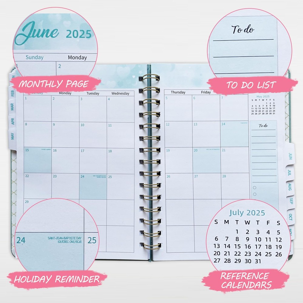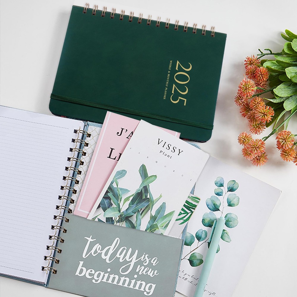 Stay organized and on track with the 2025 Planner Weekly and Monthly Academic Planner. This premium planner covers the entire year from January to December 2025, with daily calendar pages and ample space for notes and appointments. Measuring 6.4" x 8.5", it's a convenient size to carry with you. The twin-wire binding allows it to lay flat, while the tabs make it easy to navigate between months. The faux leather cover in a stylish green hue adds a touch of elegance, and the elastic closure keeps everything secure. An interior pocket provides a handy place to store loose papers or cards. With premium pages and a yearly agenda layout, this planner is the perfect companion for students, professionals, or anyone looking to stay organized in 2025. 2025 Planner Overview: This 2025 planner weekly and monthly is an ideal partner for keeping organised, from Jan 2025 to Dec 2025, 100 gsm premium thick paper, providing a smooth writing experience and preventing ink bleed-through. Size 6.4" x 8.5", easy to carry in a handbag or backpack for on-the-go planning. Soft and smooth skin feeling leather surface makes this 2025 monthly weekly planner notebook more distinctive and premium texture. Perfect for work, school, home Professional Content Design:This 2025 calendar monthly planner is so well organized, its layout corresponds perfectly to all your daily needs, it comes with Quick Reference Information, Calendar 2025 2026 Yearly Overview, UK/US/CA Holidays Reminder, the whole Month Overview, To-Do lists and Notes. With ample space for notes, appointments, and detailed daily planning, this calendar book is a comprehensive planning tool for busy individuals More Practical Functionalities:Monthly Tabs / Inner Pocket / Spiral Bound / Elastic Closure, enhancing usability and organization. High quality and well-made, secure and durable. The spiral planner 2025 perfect as a life day planner, academic planner, school planner 2025, appointment planner, work planner , happy planner 2025, student/teacher planner 2025 or Personal Organiser Convenient Monthly View: Each monthly spread of the 2025 monthly planner contains an overview of the month and a to do list section, offering a comprehensive snapshot of the schedule. Easily plan and prioritize tasks, deadlines, and events with just a glance, Stay organized and inspired throughout Efficient Weekly View:The week is shown using two pages, with each day having enough room to put appointment times, addresses, to-do lists. Note Section for to schedule your week ahead, jot down summary and review of the week