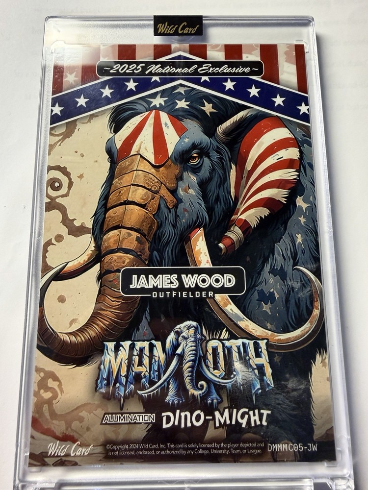 The 2025 Wild Card Jumbo National Exclusive Mammoth trading card featuring James Wood, a rookie player for the Washington Nationals, is a unique collectible item for baseball fans. This oversized card is a one-of-a-kind, serial numbered print run of 1, making it a highly sought-after addition to any sports trading card collection. Encased for protection and preservation, this exclusive card is sure to be a standout piece for fans of the Major League (MLB) and collectors alike.