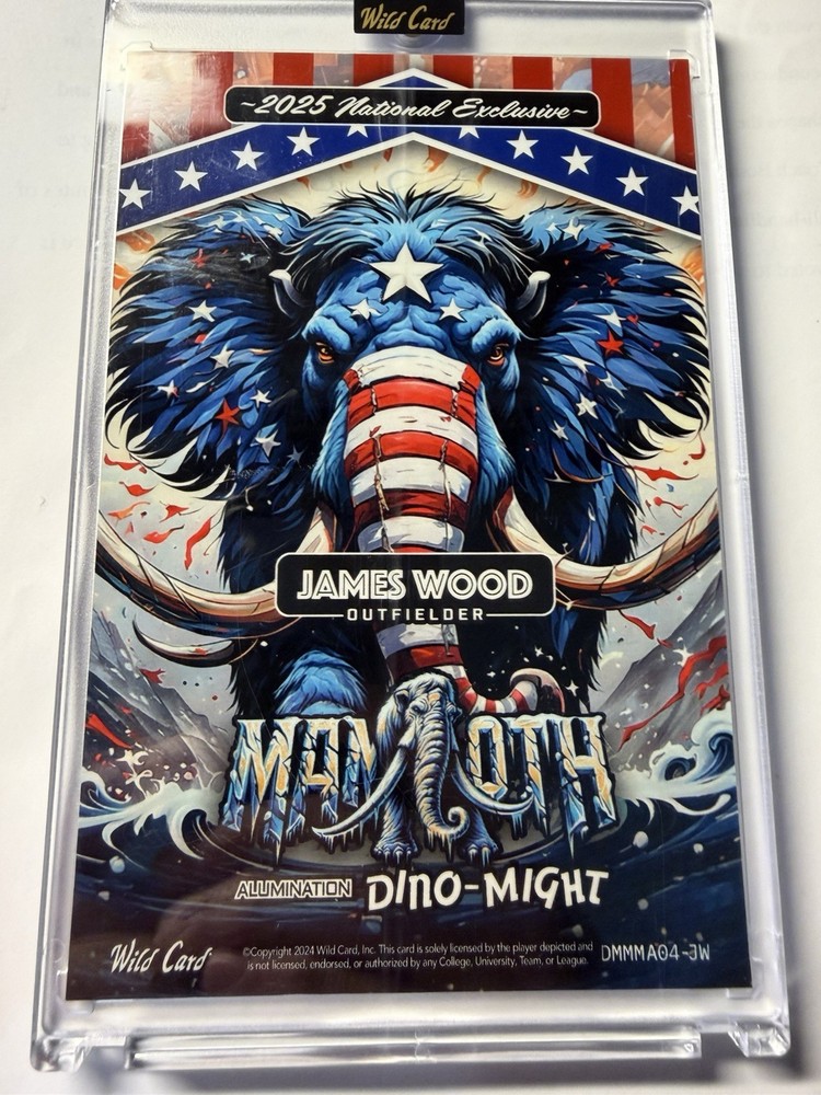 The 2025 Wild Card Jumbo National Exclusive Mammoth trading card featuring James Wood, a rookie player for the Washington Nationals, is a unique collectible item for baseball fans. This oversized card is a one-of-a-kind, serial numbered print run of 1, making it a highly sought-after addition to any sports trading card collection. Encased for protection and preservation, this exclusive card is sure to be a standout piece for fans of the Major League (MLB) and collectors alike.