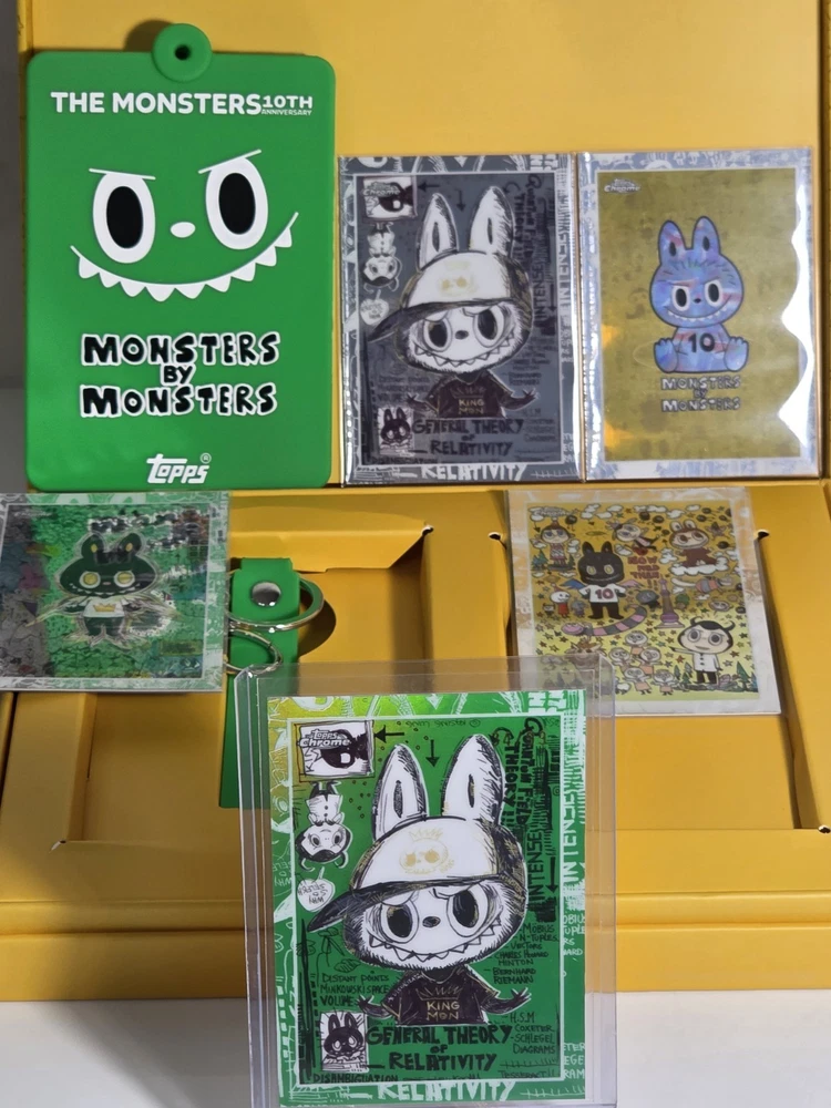 The product is a 2025 Topps Chrome Labubu The Monsters 10th Heaven card, featuring a standard size and English language. This card, green, numbered 34 out of 99. Cards was carefully pulled and sleeved right away. Comes with 4 base cards , original open box, fanatic mag case and never used matching green silicone case holder.