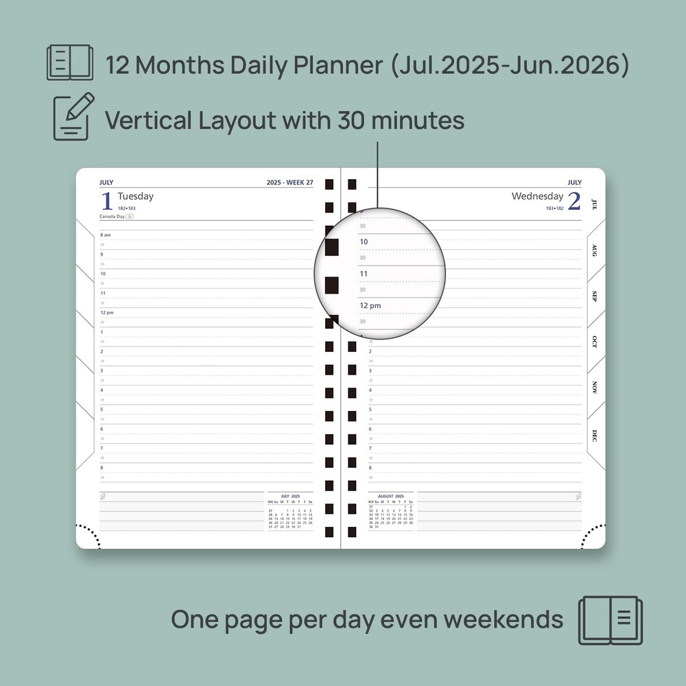 2025-2026 ACADEMIC PLANNER ONE PAGE PER DAY EVEN WEEKENDS: This daily planner (July 2025- June 2026) features 365 daily pages from 8:00 a.m. to 8:00 p.m with a 30-minutes interval,which presents spacious everyday planning with hourly schedules for your appointments. A5 MEDIUM SIZE: The size of this 2025-2026 daily planner is 6'' X 8.5'',slightly smaller than a flat panel,comfortable to carry and use,which makes your busy daily routines organized. QUICK SEARCH FUNCTION: The monthly tabs and tear-off page corners allow you to quickly browse and locate the current day. Besides, a bookmark ribbon is added to mark any wanted page of your choice. EXTRA PAGES: This 2025-2026 daily planner also contains "2025-2026 Yearly Overview" Page + "2025-2026 Holiday & Calendar" Page + Contact Pages + Password Page + Dotted Notes Pages for jotting down your ideas, thoughts or any other happy things in detail. HIGH QUALITY PAPER - The use of premium 80GSM acid-free ivory paper, makes it silky smooth to write on and ink resistant, bringing you the ultimate writing experience.