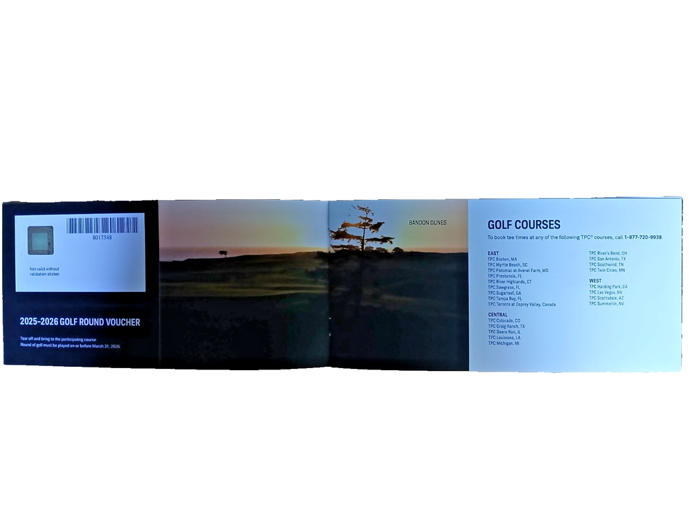 The 2025-2026 Golf Round Voucher includes a round of golf at many courses around the country. See the list in the photos. Take on some of the top courses in North America. Some restrictions apply. Please feel free to ask any questions.