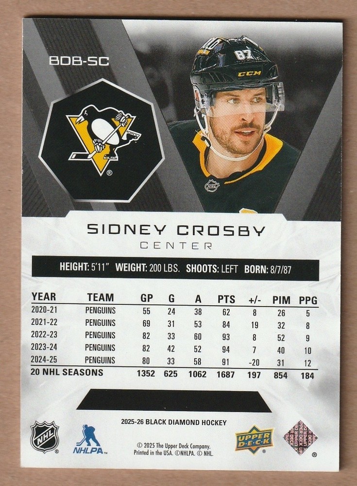 Photos of the item that you will receive are shown in the photo. 2025-26 Black Diamond SIDNEY CROSBY 023/349 Any items shipped to a Canadian address must pay appropriate sales tax. WE COMBINE SHIP 1.00 FOR ADDITIONAL ITEM. Shipping within Canada is $3.95, to the USA is $9.50, anywhere else $12.00. To All USA Customers We Ship From Calais, ME Every Tuesday, This Allows For A Tracking Number and A Signature If Required. ALL USA MAIL WILL STILL GO VIA CALAIS,ME EVERY TUESDAY. Please send me a message if you have any questions. Thanks!