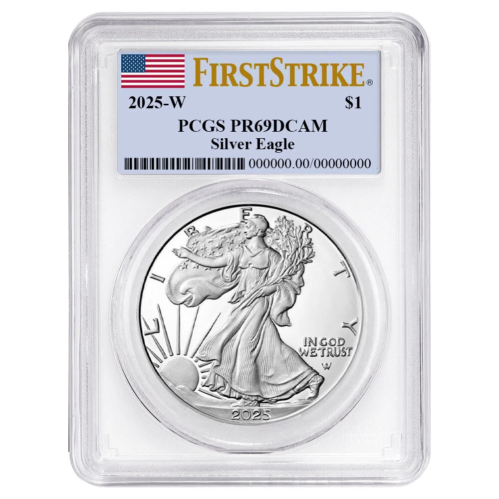 Free Shipping On All Orders Menu gold US Gold American Eagles American Buffalos Pre-33 Gold Gold Bars 1 oz Gold Bars Fractional Gold Bars Gold Rounds World Gold Coins Queen's Beast Series Canadian Maple Leafs S. African Krugerrands British Britannias Chinese Pandas Austrian Philharmonics silver US Silver American Eagles America The Beautiful 90% Silver 40% Silver Silver Rounds Silver Bars 1 oz Silver Bars 5 oz Silver Bars 10 oz Silver Bars Kilo oz Silver Bars 100 oz Silver Bars Silver Shot World Silver Queen's Beast Series Canadian Maple Leafs S. African Krugerrands British Britannias Chinese Pandas Austrian Philharmonics Mexican Libertads Australian Kangaroo's other Platinum Palladium Ancient Coins Error Coins Proof Sets Mint Sets Supplies and Publications auctions Store Categories Bullion Silver Eagles Gold Eagles Gold Buffalo Platinum Eagles First Spouse Gold Modern Commemoratives Ultra High Relief Pre-1933 U.S. Gold World Coins Error Coins Proof & Mint Sets Early U.S. Coinage Pre-33 U.S. Gold Morgan & Peace Silver $1 Dollars $1 Half Dollar 50c Quarters 25c Dime 10c Nickel 5c Small Cent 1c Supplies & Publications Original Government Packaging Ancient Coins No Reserve Auctions Other Store newsletter Add our store to your Favorites to receive our email newsletters about new items & special promotions. Sign up 2025-W Proof $1 American Silver Eagle PCGS PR69DCAM FS Flag Label White Frame Product Description The American Silver Eagle is considered one of the most popular coins worldwide. The creation of these iconic 1 Troy oz of .999 fine silver coins was authorized through the Liberty Coin Act of 1985, and production began in 1986. In 2021, a redesign was introduced by the U.S. Mint. The original obverse design, based on Adolph A. Weinman’s 1916 “Walking Liberty” Half Dollar, has been updated with the help of modern technology. Now a closer reflection of Weinman’s original design, the obverse includes the addition of his traditional artist’s mark on the coin itself. The reverse of Silver Eagle also received an updated form created by one of the U.S. Mints Artistic Infusion Program Designers, Emily Damstra. Now known as “Eagle Landing,” the image depicts an eagle approaching a landing, carrying an oak branch to add to its nest. Coin Features: 1 Troy oz .999 Silver Proof Coin minted at the West Point Mint bears the “W” mint mark Shipped in protective packaging Shop confidently, knowing that when you make a purchase, you are buying the best. Each coin has been carefully assessed by the Professional Coin Grading Service (PCGS) and is certified to be in near-perfect condition. To protect their condition, these items are shipped in their original PCGS certification slabs. Coins arrive in protective slabs courtesy of the PCGS Free Shipping on all orders The coin pictured is only a representation of the coin you will receive, not the exact coin (serial numbers will vary) If you have any questions or concerns, please do not hesitate to contact us. Our dedicated Customer Service team will be happy to assist you M-F from 9 am to 5 pm EST. Shipping Payment Returns About Us Shipping We offer free shipping on all of our listings! All items must be shipped directly to your registered eBay address, no exceptions. We will not ship it to an alternative or forwarding address. All of our packages are fully insured. Orders over $750.00 require Signature Confirmation. No insurance claim will be processed if the United States Postal Service or any other carrier designates the package as delivered via tracking number, regardless of circumstance. In general, we ship items using USPS First Class Mail or FedEx Ground. Other methods may be used depending on circumstance. eBay will post an estimated shipping time as soon as shipping information is uploaded to an order. This time frame is only an estimate, not a guarantee. Please be sure to verify that your order is correct prior to submitting payment. Once an order is placed it can only be canceled not adjusted. Orders are processed quickly and once they are moved to our shipping department an order can no longer be canceled, it would have to be returned (all returns are subject to restocking fees). Disclaimer: Once the item has left our facilities, it is under the control of the third party shipping service. We always do our best to provide our customers with speedy service; however some things are out of our control. There is always the possibility for a delay due to these third party services or the possibility of a product becoming damaged or lost in transit. The simple fact is, all of the above-described scenarios are unacceptable to us and we will never put this burden on our customers. If anything happens to a product in transit, we will always be willing to replace the product. Customer satisfaction is our number one priority and we do whatever we can to accommodate you. Pinehurst Coins will not accept purchases for any item that is mispriced due to technical issues, regardless if those issues are caused by eBay's system or our own. All mispriced orders will be canceled and your money will be completely refunded immediately. Payment For large orders with customers that we do not have a previously established business relationship, a wire may be necessary. This will be determined at the discretion of Pinehurst Coins. Payment is due at the time of checkout, no exceptions. We do not offer discounts unless it is otherwise posted on our listing. Some listing will provide you with a bulk purchase discount. Please see individual listings for details. Placing an order locks in your price. We do not offer price adjustments on our items. Both the precious metals and numismatic markets can be volatile and change on a regular basis. Placing your order locks in your price and this price cannot be adjusted. We will not charge you additional money if the price goes up therefore if the price goes down we do not credit you the difference. Returns Pinehurst C