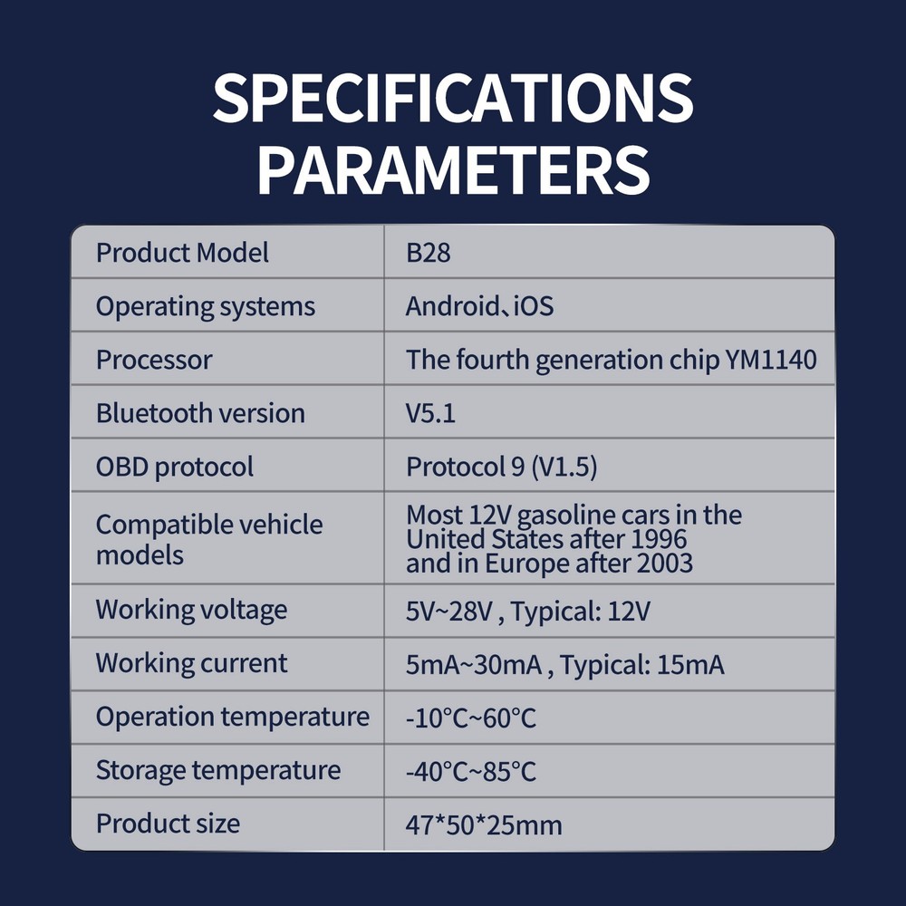 About Our Product 1. Wireless Professional Diagnostics, Rich App Experience Ditch the cords! Connect seamlessly via advanced Bluetooth 5.1 for smart pairing and a stable connection. Our official, ad-free app provides a truly intuitive experience with a comprehensive suite of features: perform a One-Click Full Vehicle Diagnosis , view Real-Time Data Streams & Graphs , analyze trips, run Vehicle Performance Tests , and customize your dashboard. It's professional power, simplified and wireless. 2. Powerful 4th Gen Chipset: Fast, Reliable & Future-Proof At its core lies the advanced Fourth Generation YM1140 SOC Chip , designed for industrial-grade reliability and speed. This powerhouse ensures rapid data processing and supports Over-The-Air (OTA) Firmware Updates , meaning your tool gets smarter over time with new features and compatibility improvements. 3. Universal Compatibility & Global Ready Works with most 12V gasoline vehicles (USA 1996+ / Europe 2003+) supporting all 9 major OBD-II protocols . The app supports an impressive 25 languages , making it a truly global tool. Already trusted by users in over 180 countries across North America, Europe, the Middle East, and Southeast Asia. 4. Superior Durability & Extended Voltage Range Built to last in any environment. With an ultra-wide operating voltage of 5V-28V (surpassing many competitors), it handles voltage fluctuations with ease. It operates reliably in temperatures from -10°C to 60°C (14°F to 140°F) . The clear tri-color indicator lights (Power/Bluetooth Connection/OBD Link) provide instant status confirmation. 5. Universal Compatibility: Works with Most Cars (1996+) Compatible with most 12V gasoline vehicles from 1996 and later in the USA, and 2003 and later in Europe. Supports all 9 major OBD-II protocols. NOTE: Your vehicle must have a standard OBD2 port. Check your vehicle's manual for compatibility. Details Specification Connection : Bluetooth 5.1 (No cables needed for phone connection) Chip : 4th Gen YM1140 Protocols : All 9 OBD-II Protocols Operating Voltage: 5V – 28V (Typical 12V) O pera ting Temperature: -10°C ~ 60°C (14°F ~ 140°F) Dimensions: 47mm x 50mm x 25mm (Compact & Portable) Comprehensive Diagnostic Functions: Read & Clear Diagnostic Trouble Codes (DTCs) View Freeze Frame Data & I/M Readiness Status Access Vehicle Information (VIN, CALID, CVN) Oxygen (O2) Sensor Monitoring & Component Tests On-Board System Monitor Test & Advanced Code Lookup Monitor Battery Voltage & Performance Unified Diagnostic Services (UDS) for enhanced coverage Malfunction Indicator Light (MIL) Status Packing List 1x OBD2 Bluetooth Scanner 1x User Manual (via QR Code) Shipping Payment Returns Contact Us Shipping 1. All items will be shipped in 24 hours after receiving your payment . 2. We ship this item to US only via USPS first class mail. It usually takes 3-5 working days to deliver. Payment 1. We can only accept payment from PayPal. 2. Please keep the consistency of Paypal address and ebay address. Returns 1. We offer 30 days return policy. 2. Please contact us within 30 days from the date you receive your package if you have any questions with the products . 3. Refund will be sent after we got your returned package. 4. All returned items should be in the original packaging with tracking number. Contact Us We work from Monday - Saturday 9:00AM - 6:00PM, but we will reply once we get your message. There will be delay on response if you send message or E-Mail on Sunday. 2026 Bluetooth Auto Car Diagnostic Tool OBDII Scanner Adapter OBD2 Code Tool A+ About Our Product 1. Wireless Professional Diagnostics, Rich App Experience Ditch the cords! Connect seamlessly via advanced Bluetooth 5.1 for smart pairing and a stable connection. Our official, ad-free app provides a truly intuitive experience with a comprehensive suite of features: perform a One-Click Full Vehicle Diagnosis , view Real-Time Data Streams & Graphs , analyze trips, run Vehicle Performance Tests , and customize your dashboard. It's professional power, simplified and wireless. 2. Powerful 4th Gen Chipset: Fast, Reliable & Future-Proof At its core lies the advanced Fourth Generation YM1140 SOC Chip , designed for industrial-grade reliability and speed. This powerhouse ensures rapid data processing and supports Over-The-Air (OTA) Firmware Updates , meaning your tool gets smarter over time with new features and compatibility improvements. 3. Universal Compatibility & Global Ready Works with most 12V gasoline vehicles (USA 1996+ / Europe 2003+) supporting all 9 major OBD-II protocols . The app supports an impressive 25 languages , making it a truly global tool. Already trusted by users in over 180 countries across North America, Europe, the Middle East, and Southeast Asia. 4. Superior Durability & Extended Voltage Range Built to last in any environment. With an ultra-wide operating voltage of 5V-28V (surpassing many competitors), it handles voltage fluctuations with ease. It operates reliably in temperatures from -10°C to 60°C (14°F to 140°F) . The clear tri-color indicator lights (Power/Bluetooth Connection/OBD Link) provide instant status confirmation. 5. Universal Compatibility: Works with Most Cars (1996+) Compatible with most 12V gasoline vehicles from 1996 and later in the USA, and 2003 and later in Europe. Supports all 9 major OBD-II protocols. NOTE: Your vehicle must have a standard OBD2 port. Check your vehicle's manual for compatibility. Details Specification Connection : Bluetooth 5.1 (No cables needed for phone connection) Chip : 4th Gen YM1140 Protocols : All 9 OBD-II Protocols Operating Voltage: 5V – 28V (Typical 12V) O pera ting Temperature: -10°C ~ 60°C (14°F ~ 140°F) Dimensions: 47mm x 50mm x 25mm (Compact & Portable) Comprehensive Diagnostic Functions: Read & Clear Diagnostic Trouble Codes (DTCs) View Freeze Frame Data & I/M Readiness Status Access Vehicle Information (VIN, CALID, CVN) Oxygen (O2) Sensor Monitoring & Component Tests On-Board System Mo