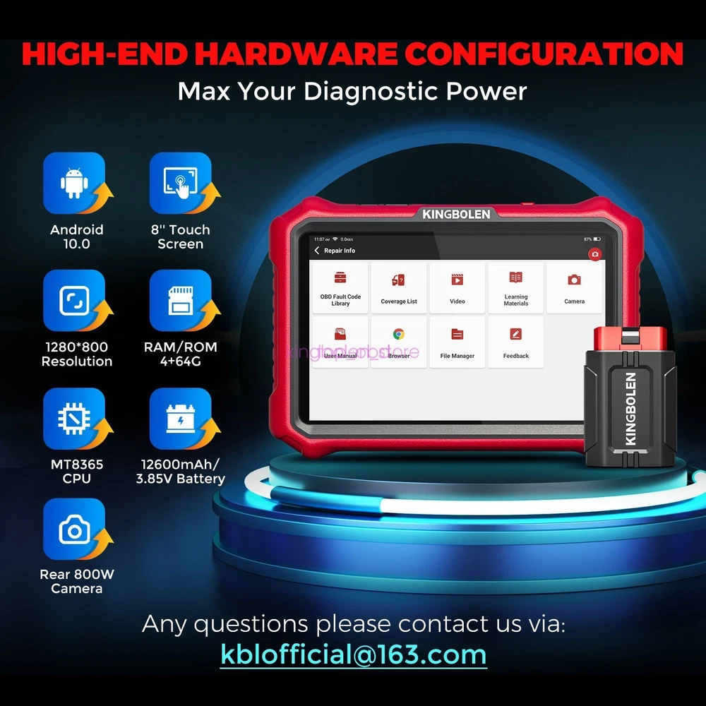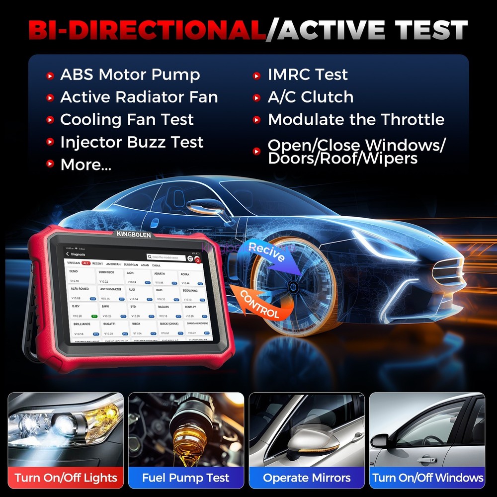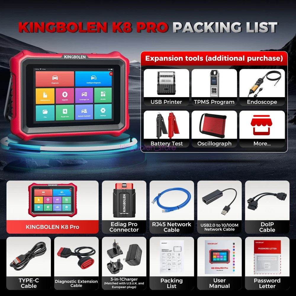KINGBOLEN K8 PRO 8inch Car full system Scanner bluetooth with 42 Special service, support EC~U Coding, Active test+ Android 10 OS running on 8-inch HD IPS Touch Screen + 64GB Memory + Lifetime free update online KINGBOLEN K8 PRO Language: English, German , Spanish , French , Italian , Japanese , Portuguese , Russian , Polish , Turkish , Dutch , Hungarian , Chinese Traditional. It will add these languages soon : Korean , Greek , Arabic , Denish , Persian, Romanian, Croatian, Finnish, Swedish, Czech KINGBOLEN K8 PRO Professional Diagnostic Tool CAR REPAIR SHOPS & MECHANICS 's First Choice !!! KINGBOLEN K8 PRO is a well-balanced bi-directional scan tool. It offers a decent number of OBD2 functions in addition to bidirectional tests. Experience comprehensive and OE-Level OBD2 diagnostics, ECU coding, Live data streaming, Active testing and AutoVIN technology for identifying vehicles easily. You’ll love it if you are a DIY mechanic or enthusiast. KINGBOLEN K8 PRO supports Full system diagnostic : The Full Systems of the car mainly including Drive System, Chassis System, Body System, Electrical system : 1.PCM(Drive System): Engine, Transmission, Transfer case, Electrical Machine Electronics, Fuel Pump, Gear, and more... KINGBOLEN K8 PRO OBDII Car Automotive Diagnostic Tool OBD2 Scanner OBD 2 Code Reader TPMS Functions PK Automotive Scanner 2. Chassis System: Accumulator Management Electronics, Steering, Integrated Chassis Management, Tyre Pressure Control, Active Cruise Control, Braking System, Suspension, TPMS and more... 3.BCM(Body System): SRS Airbag, Camera, Audio Radio, Gateway, Cluster Dashboard, Rain Sensors, Charging Interface Module, Parking Assistance, Power Control Unit, Touch box, Light, Battery Charging System, Head up Display, Wipe Control System, Roof, Seat & Door Motor system, Immobilizer, ABS ESP system, Air Condition.Electric Windows, Telephone, and more... 4.Electrical System: Including Centralized control system for engine and power transmission, Chassis integrated control and safety system, Intelligent body electronic system, Communication and information / entertainment system. OBD2 Diagnostic Tools Professional Full System Bi-Directional Control AF Adjust DPF Injector TPMS Automotive Scanner It supports the detailed Function : --read fault codes: read and decode the DTCs to identify where the fault location is; --clear fault codes: erase the DTCs to turn off the MIL after repairs; --retrieve ecu information: allows you to retrieve vehicle information; --Graph live data stream: view the dynamic data stream to determine vehicle condition --ECU Coding : Match, learn, or code the new ECU; Customize your car, unfold the hidden features, or disable the annoying functions; Reprograms the adaptive data for certain components after repairs. --Active Test ( Bi-directionnal Control ) : Actuate solenoids and actuators for active testing, send commands to systems/components to test their working status, without using the vehicle controls. Diagnostic Tool Scanner Automotivo ECU Coding OBD2/EOBD OBD PK MS906BT MS908S MS906 With the Diagnose Function , you can enhance performance, save energy, reduce emissions and more as following: For Engine: detect common issues as Poor lubrication, Failing oil pump, Oil deposits and debris, Inadequate fuel and air compression, Leaking engine coolant, Blocked engine radiators, Prolonged engine detonation, Damaged oxygen sensors, Aged spark plugs, etc. For SRS: pinpoint the trouble area as: a bad seat belt, a corroded crash sensor, or some water intrusion in a connector, etc. For ABS: diagnose Blown sensor fuse, Low brake fluids, and Faulty sensor, etc. For Transmission: avoid Grinding or shaking sensation in gear, Whining, humming or clunking noises, Burning smells, Gears Slipping, Low or Leaking Transmission Fluid, etc. Kingbolen K8 PRO Automotive Scan Tool Map Bi-Directional Control ECU Coding Full Diagnostics & 42+ Resets Support DoIP & CAN FD For TPMS: verify problems of Low tire pressure, Faulty in tire pressure monitor control module, Unknown tire sensor, Failure to identify tire sensor, etc. KINGBOLEN K8 PRO supports ECU Coding and Active tester function : ECU Coding : the advanced coding function is used to re-flash the vehicle control modules, which allows you to update the computer software on the vehicle to the latest version, as well as to reprogram adaptive data for certain components after making repairs or replacements, providing solutions for the issues of drivability, fuel efficiency, power loss, fault codes, durability of mechanical parts etc. But please note, ecu coding are NOT universal for all vehicles, please check compatibility with VIN number before purchase. Active Test & Bi-directional Control : Bi-Directional Control capability and is capable of performing Active Tests to access vehicle-specific subsystems and component tests. The tester outputs commands to the ECU to drive the actuators in order to determine the integrity of the system or parts by reading the ECU data, or by monitoring the operation of the actuators .For example , x431 v have the ability to actuate relays, injectors, coils, or perform system tests, etc. Also it will actuate solenoids valve and actuators for active testing to identify the error easily moreover. The bidirectional functions are quite extensive. even open an e.g.r. valve and seeing the difference in idle response and oxygen sensor voltage. Please note: Active tests are NOT universal for all vehicles, check compatibility with VIN number before purchase. Active tests vary depending on the manufacturer, year, and model, and only the available tests display in the menu. KINGBOLEN K8 PRO Support TPMS Diagnostic function : ( It need works with ThinkTool tpms G1 ) KINGBOLEN K8 PRO can work with wireless tire pressure diagnostic tool (optional accessory) toachieve the features of TPMS activation, programming and learning. a) Activation: to activate the sensor's IlD, wheel pressure, sensor frequency,