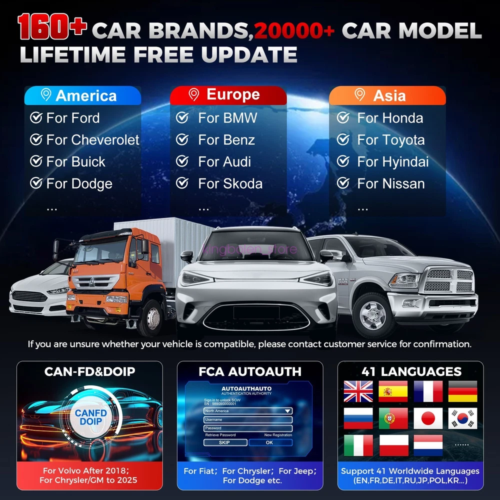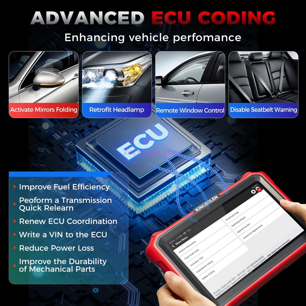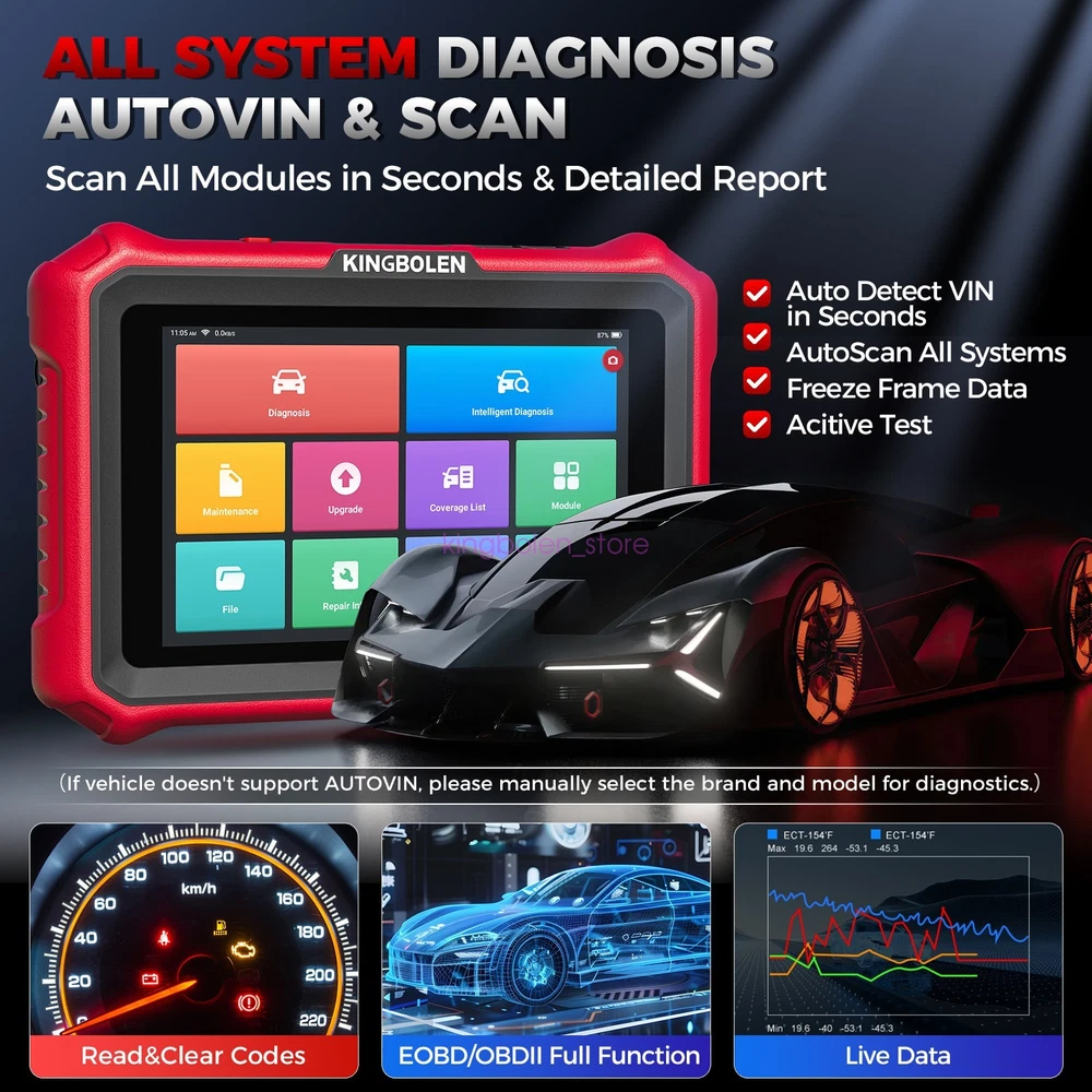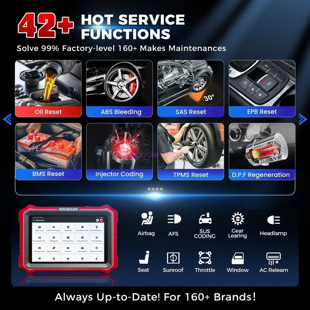 KINGBOLEN K8 PRO 8inch Car full system Scanner bluetooth with 42 Special service, support EC~U Coding, Active test+ Android 10 OS running on 8-inch HD IPS Touch Screen + 64GB Memory + Lifetime free update online KINGBOLEN K8 PRO Language: English, German , Spanish , French , Italian , Japanese , Portuguese , Russian , Polish , Turkish , Dutch , Hungarian , Chinese Traditional. It will add these languages soon : Korean , Greek , Arabic , Denish , Persian, Romanian, Croatian, Finnish, Swedish, Czech KINGBOLEN K8 PRO Professional Diagnostic Tool CAR REPAIR SHOPS & MECHANICS 's First Choice !!! KINGBOLEN K8 PRO is a well-balanced bi-directional scan tool. It offers a decent number of OBD2 functions in addition to bidirectional tests. Experience comprehensive and OE-Level OBD2 diagnostics, ECU coding, Live data streaming, Active testing and AutoVIN technology for identifying vehicles easily. You’ll love it if you are a DIY mechanic or enthusiast. KINGBOLEN K8 PRO supports Full system diagnostic : The Full Systems of the car mainly including Drive System, Chassis System, Body System, Electrical system : 1.PCM(Drive System): Engine, Transmission, Transfer case, Electrical Machine Electronics, Fuel Pump, Gear, and more... KINGBOLEN K8 PRO OBDII Car Automotive Diagnostic Tool OBD2 Scanner OBD 2 Code Reader TPMS Functions PK Automotive Scanner 2. Chassis System: Accumulator Management Electronics, Steering, Integrated Chassis Management, Tyre Pressure Control, Active Cruise Control, Braking System, Suspension, TPMS and more... 3.BCM(Body System): SRS Airbag, Camera, Audio Radio, Gateway, Cluster Dashboard, Rain Sensors, Charging Interface Module, Parking Assistance, Power Control Unit, Touch box, Light, Battery Charging System, Head up Display, Wipe Control System, Roof, Seat & Door Motor system, Immobilizer, ABS ESP system, Air Condition.Electric Windows, Telephone, and more... 4.Electrical System: Including Centralized control system for engine and power transmission, Chassis integrated control and safety system, Intelligent body electronic system, Communication and information / entertainment system. OBD2 Diagnostic Tools Professional Full System Bi-Directional Control AF Adjust DPF Injector TPMS Automotive Scanner It supports the detailed Function : --read fault codes: read and decode the DTCs to identify where the fault location is; --clear fault codes: erase the DTCs to turn off the MIL after repairs; --retrieve ecu information: allows you to retrieve vehicle information; --Graph live data stream: view the dynamic data stream to determine vehicle condition --ECU Coding : Match, learn, or code the new ECU; Customize your car, unfold the hidden features, or disable the annoying functions; Reprograms the adaptive data for certain components after repairs. --Active Test ( Bi-directionnal Control ) : Actuate solenoids and actuators for active testing, send commands to systems/components to test their working status, without using the vehicle controls. Diagnostic Tool Scanner Automotivo ECU Coding OBD2/EOBD OBD PK MS906BT MS908S MS906 With the Diagnose Function , you can enhance performance, save energy, reduce emissions and more as following: For Engine: detect common issues as Poor lubrication, Failing oil pump, Oil deposits and debris, Inadequate fuel and air compression, Leaking engine coolant, Blocked engine radiators, Prolonged engine detonation, Damaged oxygen sensors, Aged spark plugs, etc. For SRS: pinpoint the trouble area as: a bad seat belt, a corroded crash sensor, or some water intrusion in a connector, etc. For ABS: diagnose Blown sensor fuse, Low brake fluids, and Faulty sensor, etc. For Transmission: avoid Grinding or shaking sensation in gear, Whining, humming or clunking noises, Burning smells, Gears Slipping, Low or Leaking Transmission Fluid, etc. Kingbolen K8 PRO Automotive Scan Tool Map Bi-Directional Control ECU Coding Full Diagnostics & 42+ Resets Support DoIP & CAN FD For TPMS: verify problems of Low tire pressure, Faulty in tire pressure monitor control module, Unknown tire sensor, Failure to identify tire sensor, etc. KINGBOLEN K8 PRO supports ECU Coding and Active tester function : ECU Coding : the advanced coding function is used to re-flash the vehicle control modules, which allows you to update the computer software on the vehicle to the latest version, as well as to reprogram adaptive data for certain components after making repairs or replacements, providing solutions for the issues of drivability, fuel efficiency, power loss, fault codes, durability of mechanical parts etc. But please note, ecu coding are NOT universal for all vehicles, please check compatibility with VIN number before purchase. Active Test & Bi-directional Control : Bi-Directional Control capability and is capable of performing Active Tests to access vehicle-specific subsystems and component tests. The tester outputs commands to the ECU to drive the actuators in order to determine the integrity of the system or parts by reading the ECU data, or by monitoring the operation of the actuators .For example , x431 v have the ability to actuate relays, injectors, coils, or perform system tests, etc. Also it will actuate solenoids valve and actuators for active testing to identify the error easily moreover. The bidirectional functions are quite extensive. even open an e.g.r. valve and seeing the difference in idle response and oxygen sensor voltage. Please note: Active tests are NOT universal for all vehicles, check compatibility with VIN number before purchase. Active tests vary depending on the manufacturer, year, and model, and only the available tests display in the menu. KINGBOLEN K8 PRO Support TPMS Diagnostic function : ( It need works with ThinkTool tpms G1 ) KINGBOLEN K8 PRO can work with wireless tire pressure diagnostic tool (optional accessory) toachieve the features of TPMS activation, programming and learning. a) Activation: to activate the sensor's IlD, wheel pressure, sensor frequency,
