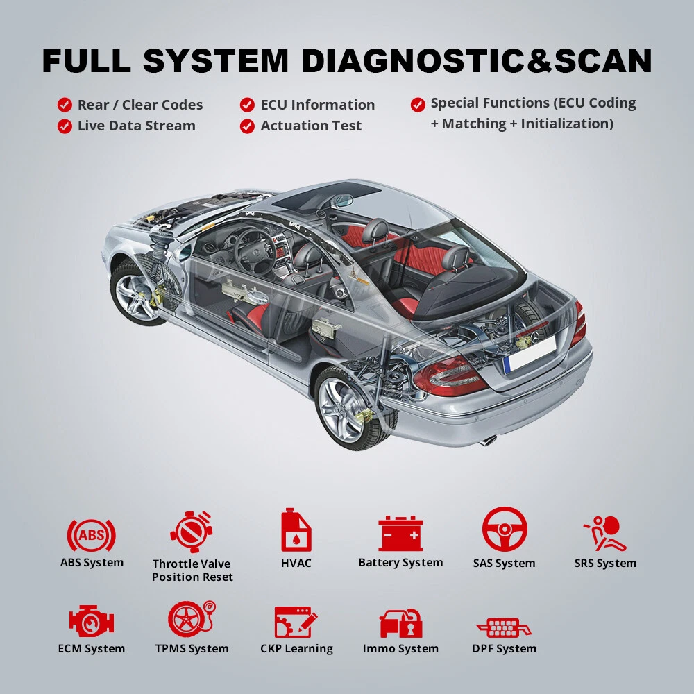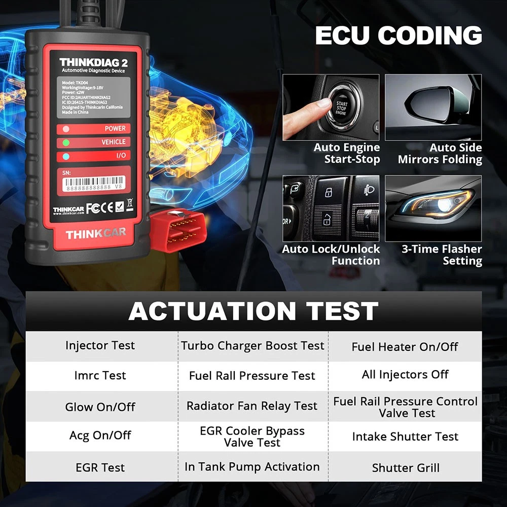 Turn Your Smart Device Into A Professional Technician's Diagnostic Tool ✔️ CANFD Protocol: Thinkcar Thinkdiag2 is the only tool in this range that supports CAN FD protocol vehicles(for GM vehicles after 2020), saving on buying adapter and getting stable communication. ✔️ 120 Car Brands Coverage +10 languages : Thinkdiag2 professional scan tool supports most car models after 1996 year of 120+ car brands. Global version can be used without geographical restrictions. ✔️ Bidirectional Control/Actuation test : Thinkcar thinkdiag2 car scanner diagnostic tool Features Full bi-directional control ability, to send commands to vehicle’s systems/components, to verify system input/output without using the vehicle's controls.Such as: turn on the radiator fan, modulate the throttle, open/close windows, operate mirrors, Injector Buz Test, turn on interior & exterior lights, sound horn, test door lock actuators and such. ✔️ ECU Coding : For customize your car, unfold the hidden features, or disable the annoying functions(turn off the back up beep, turn the seat belt buzzer off); Re-identify the adaptive data for certain components after repairs or replacements. (NOTE: DO NOT Support ECU reprogramming) ✔️ 15+ Reset Functions : Along with all the common maintenance functions, such as ABS Bleeding, K*y Programing, Injector Coding, Oil Reset, DPF Reset, BMS Reset etc. ✔️ Auto Auth for FCA SGW: Thinkcar Thinkdiag2 car canner allows you to unlock the protected FCA vehicle SGW module for Chrysler/for Dodge/for Jeep/for Alfa Romeo/for Fiat vehicles, etc. (NOTE: Only provide AutoAuth login portal, and need purchase the registration number on the AutoAuth website by yourself.) ✔️ All System Diagnosis : Thinkdiag obd2 scanner supports read all vehicle systems (including ENG, ABS, SRS, ABS, AFS, EBD, TCS, chassis, body and electric and electronic equipment system, etc.) of the error code, cleanup code, read the data flow, the freeze frame. It can also perform all the commands that a mechanic needs, to know the product problem whether caused by car's electrical wiring or car’s component. ✔️ AutoVin & Auto Scan : Automatically retrieve the vehicle identification number for comprehensive all available systems scan for quick diagnostics. ✔️ Tips : Internet connection is recommended when using it. Some functions may not be available or diagnostic result error without connecting network. ThinkDiag2 Has 15+ Poular Maintenance Reset Function Oil Light Reset : This allows you to recalculate the engine oil life system after an oil change. TPMS Reset : When the car tire pressure fault light is on, after carrying out maintenance, you need to reset the tire pressure through the tire pressure reset function to extinguish the tire pressure fault light. Brake pad reset : When the brake pads and brake pad wear sensing line are replaced, the brake pad indicator lights up, after the brake pad sensor line short circuit is repaired, or after the servo motor is replaced, the reset needs to be done. SAS Calibration : Calibrate the steering angle sensor and clear the fault memory. Battery Reset : It is to use Thinkdiag2 to perform a reset process on the monitoring unit of the car battery, clear the original fault information about the battery being low, make it match again, and let the monitoring unit monitor with the relevant information of the existing battery as the standard. ABS Bleeding : When the ABS system contains air, the brake system needs to be exhausted through the ABS exhaust function to restore the ABS system braking sensitivity. The ABS bleed function is required when replacing the ABS computer, ABS pump, brake master pump, brake sub-pump, brake lines, and brake fluid. ETS Learning : Initializes the throttle actuator to restore the "learning" values stored on the ECU to their default state. D-P-F regeneration : Generally, D-P-F regeneration matching is required when the exhaust back pressure sensor is replaced, the particulate trap is removed or replaced, the fuel additive nozzle is removed or replaced, the catalytic oxidizer is removed or replaced, the DPF regeneration fault light is illuminated and matched after repair, and the D-P-F regeneration control module is repaired and replaced, mainly to remove the trap performance by using combustion oxidation on a regular basis Always maintain the best stability. Injector Coding : usually in the replacement of ECU, the injector nozzle, is required to confirm the code of each cylinder nozzle or re-code. So that the cylinder can better identify each cylinder nozzle, and more accurate control or correction of the amount of fuel injection of each cylinder. Sunroof initialization : This function can set the sunroof locking off, closing when it rains, memory function of sliding/tilting sunroof, outside temperature threshold, etc. E-G-R Adaption : This function can be used for self-learning after E-G-R (Exhaust Gas Recirculation) valve cleaning or replacement Suspension Matching : When replacing the body height sensor in the air suspension system, after the control module or when the car is leveled incorrectly, this function needs to be performed to adjust the body height sensor for level calibration. Transmission Learning : When the transmission is disassembled or repaired (after the battery is disconnected in some car models), it will lead to shift delay or shock problem, then this function needs to be performed to make the transmission compensate automatically according to the driving conditions in order to achieve a more comfortable and ideal shift quality. Headlight Matching ECU Coding The ECU coding function is used to reflash the vehicle control module, which allows you to match repaired or replaced components to the ECU. It can activate the hidden functions for VW, for AUDI, for BENZ, and for BMW models. If you want to confirm whether your model can perform this function, please provide the VIN number or specific vehicle information (yea