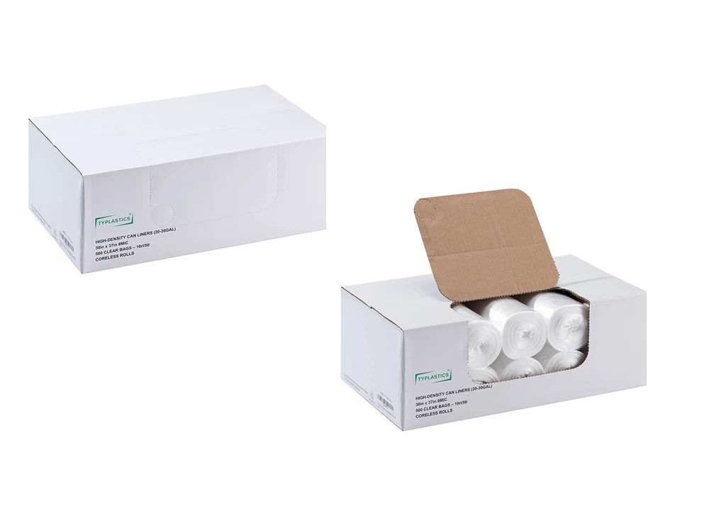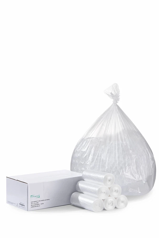 20-30 Gallon Can Liners: 500 count. Scent free. Size: 30" x 37". Packing: 50 clear bags per roll, 10 rolls per box. Fits most 20-30 Gallon trash cans: Bags are made from high performance polyethylene, Star Seal Bottom allows for Even Weight Distribution, Tear Resistance, Leak-Proof, and Easy Removal from Trash Bin. Cost Efficient Multipurpose Bags: 500 durable bags are neatly packaged on Perforated Coreless Rolls for Clean Storage and Easy Dispensing. Recommended for carrying mediumweight trash without sharp edges, such as yard leaves, clothes, styrofoam, paper, plastic bottles for recycling, and etc. in office, home, yard, hotel, home kitchen, bathroom, and more Institutional janitorial needs. Environmentally Friendly: Our Bags are manufactured using 20% Less energy without sacrificing the performance to reduce our carbon footprint.