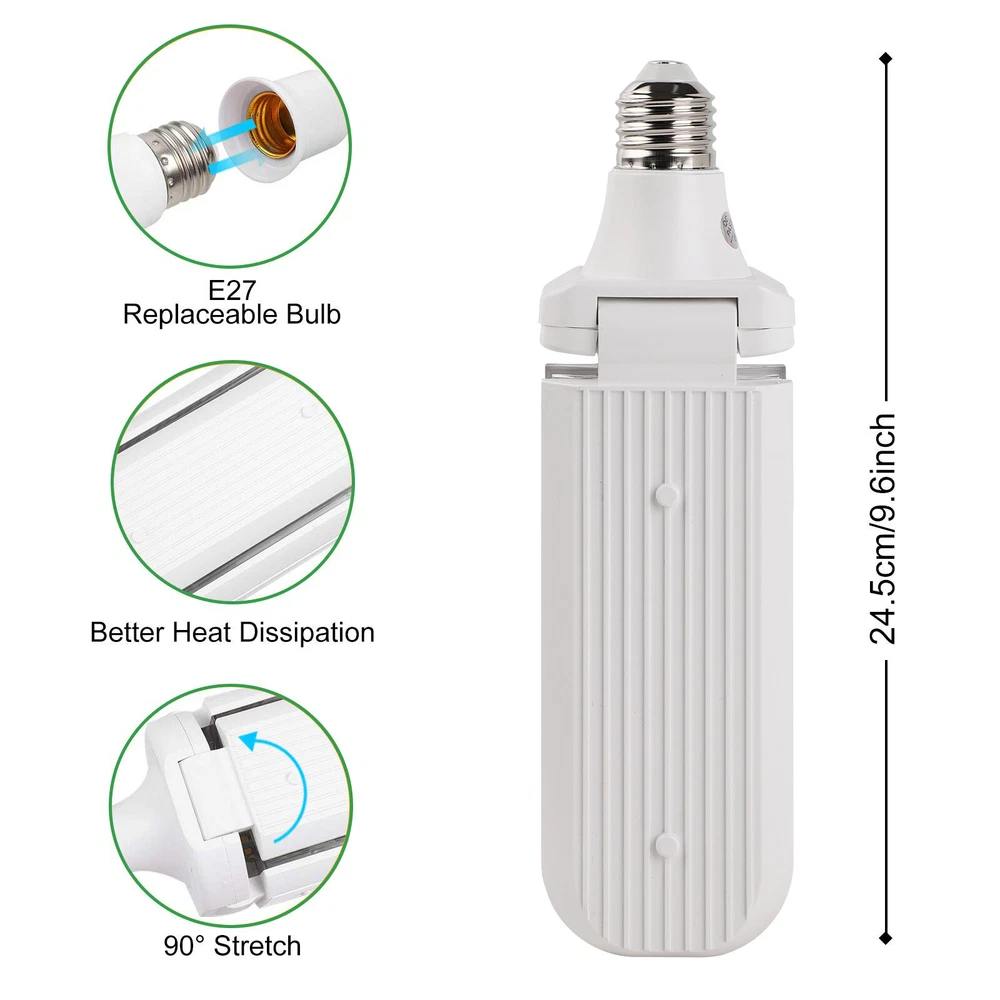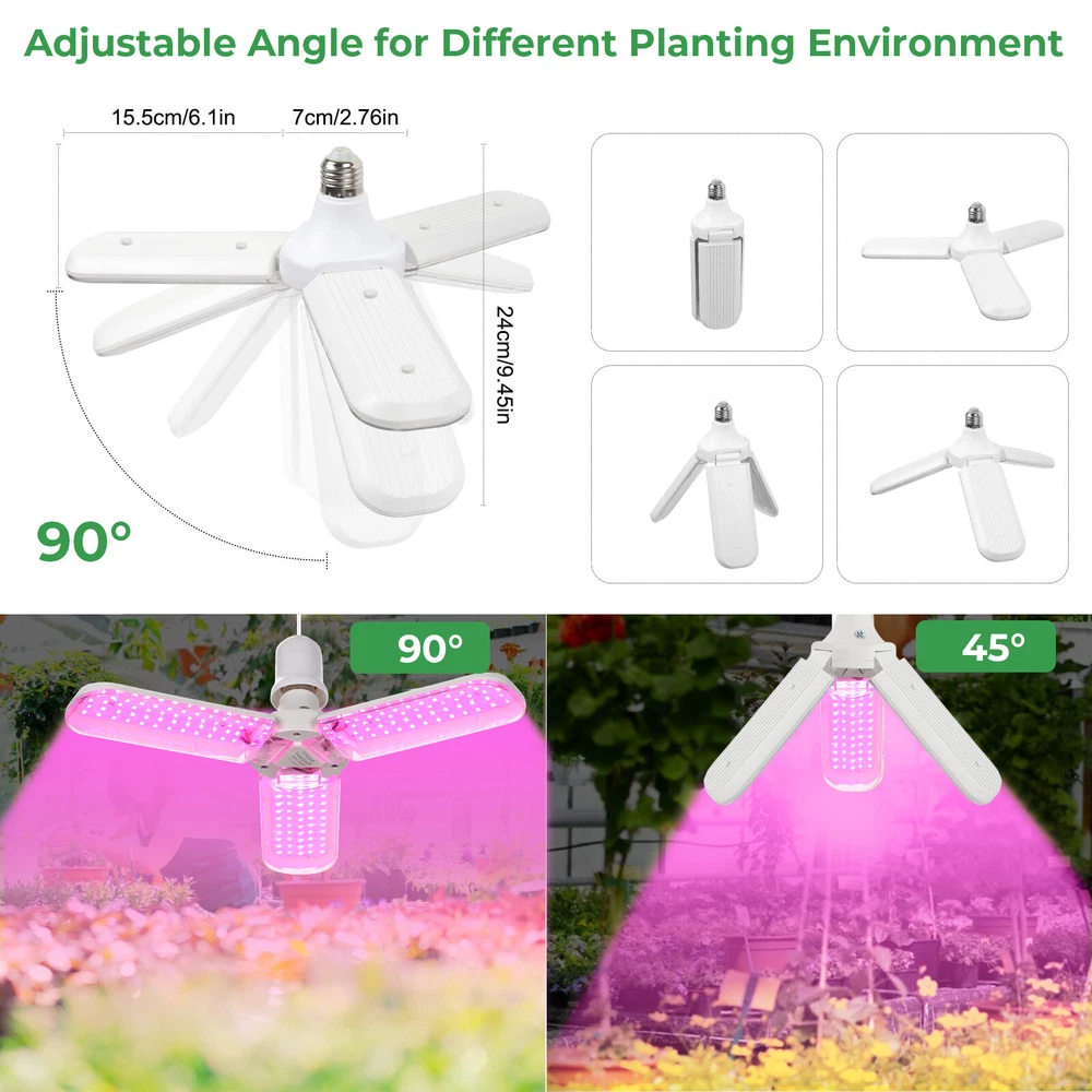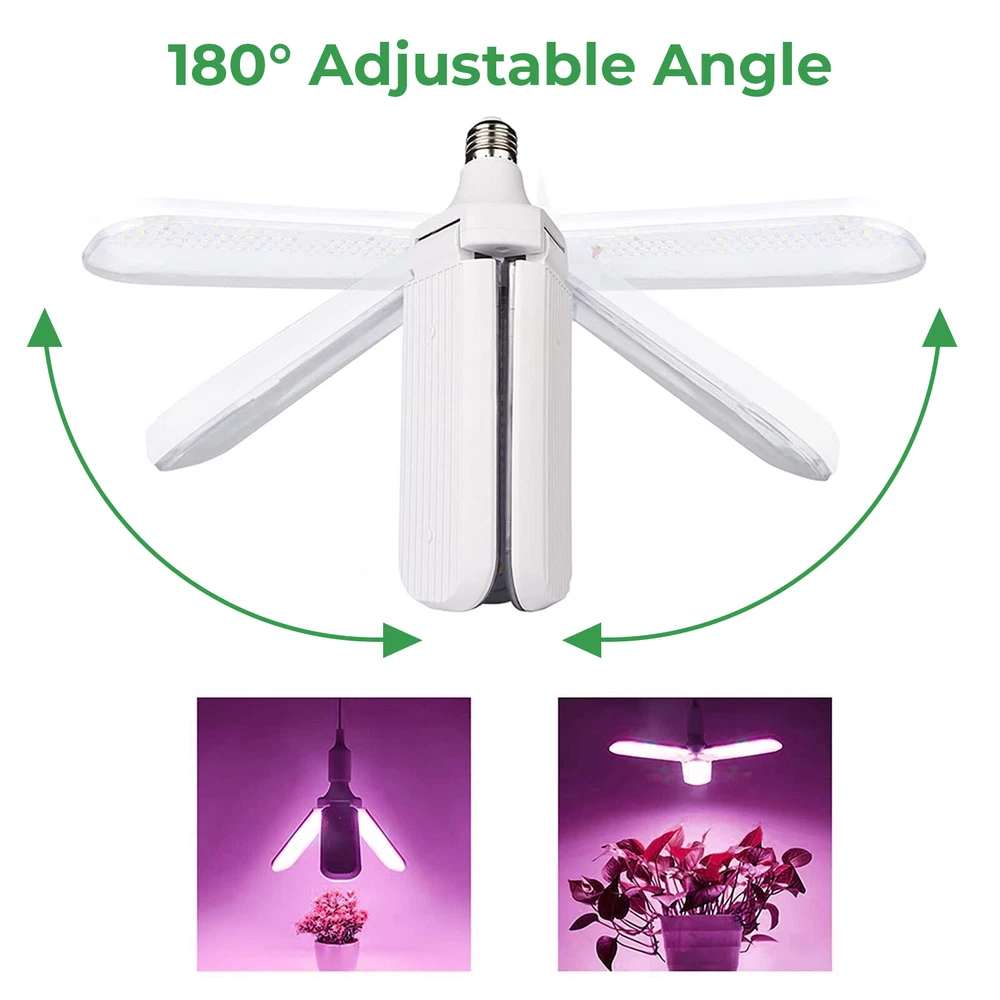 Product Description LED Grow Lights for Indoor Plants 20/40/60W Full Spectrum Plant Light Bulb, E26/E27 Lamp Holder,2/3/ 4 Leaves Foldable Design, LED Growing Lamp for Seeds, Vegetable, Flower Description: Features: 【New Technology 】Grow light bulbs use fan blades with foldable design. Each blade can be folded up to 90°, so you can decide the light direction and adjust the range of the lighting; and all LEDs are covered by the waterproof PC light cover with a transmittance of more than 100%, which can prevent water mist from touching the lamp beads, thus improving the life and safety of the plant grow light. 【Perfect Plant Grow Light Bulb】Equipped with 120/180/240pcs lamp beads and higher wattage, allowing your plants to receive more energy without burning your plants, the best full spectrum to give your plants much light with a high output PPFD distance from indoor plants. Provide the perfect high-quality sunlight for vegetables, tomatoes, cucumbers, peppers, and herbs. 【A Best Full Specturm】Full spectrum led grow light uses 380-780nm wavelength, perfect for all growing stages plants. Indoor plants receive a more uniform light than single red or blue spectrum light, making your plant grow faster and healthier。 【B Best Full Specturm】Full spectrum led grow light including 3000 K, 5000 K, 660 nm, 730 nm IR, and 395 nm UV, these light rays can simulate natural sunlight, improving the photosynthesis rate and growth speed of plants, and are suitable for all stages of plants from germination to growth to flowering. In addition, UV light can improve the immunity of the plants, so that your plants can grow healthier 【Easy To Install & Safe】It has an E26 / E27 medium base, so indoor grow lights can fit in most standard lamps. Perfect fit for your greenhouse. Flowlamp plant grow lights use Aluminium & Plastic materials to build the cooling system. Support the light working for a longer time. 【Energy Saving】This growing lights feature advanced LED technology that uses energy and generates low heat, resulting in cost savings over comparable fixtures. Our indoor plant lights are rated to last for over 50,000 hours. Specifications: Material: Aluminum+PC Full spectrum pink light LED Quantity: 120/180/240 pcs (60pcs 380-780nm of Each leaf) Sunlight LED Quantity: 120/180/240 pcs (10pcs 660nm+4pcs 460nm+2pcs 730nm+2pcs 395nm+42 pcs 3500K of Each leaf) LED Type: 2835SMD LED Power: 20W/30W/40W (Notice: LED driver power supply is affected by current and voltage, with an actual power error of ± 10%) Input Voltage: AC85-265V Base Type: E26 / E27 Package includes: 1x LED grow light Payment Shipping Returns Contact Us Paypal. We only ship to confirmed paypal address. Items are generally dispatched within 1~3 business days after payment is cleared. Please make sure your address in Paypal is matched with your shipping address before you pay. We offer a 30 days return guarantee. If you are not satisfied with the item, you can return it within 30 days after item received. If items have any problem due to quality, please contact us for refund, exchange or a replacement. Please contact us first before item returned. Customer Service from 9:00 am - 6:00 pm on Business Days. Payment Paypal. We only ship to confirmed paypal address. Shipping Items are generally dispatched within 1~3 business days after payment is cleared. Please make sure your address in Paypal is matched with your shipping address before you pay. Returns We offer a 30 days return guarantee. If you are not satisfied with the item, you can return it within 30 days after item received. If items have any problem due to quality, please contact us for refund, exchange or a replacement. Please contact us first before item returned. Contact Us Customer Service from 9:00 am - 6:00 pm on Business Days. powered by