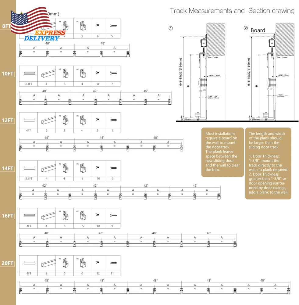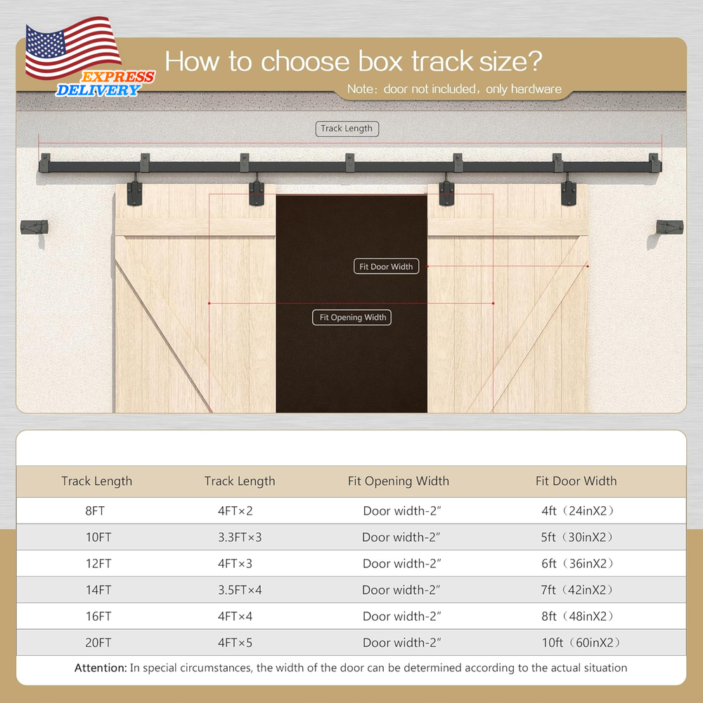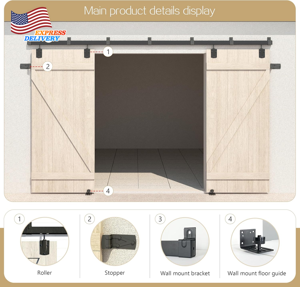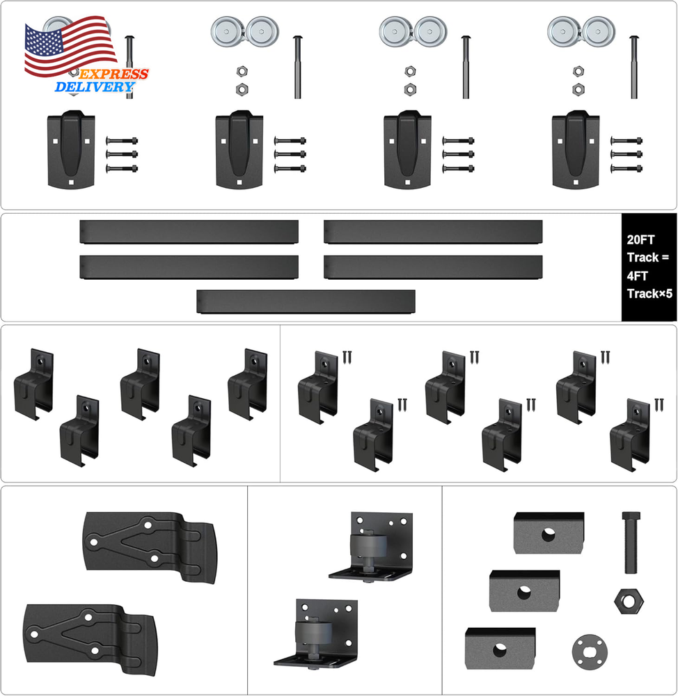 Store New Arrivals Add to Favorite View Feedback Contact 20FT Heavy Duty Box Rail Exterior Sliding Barn Door Hardware Kit FREE SHIPPING Description Item model number XC46 Item Package Quantity 1 Style Rustic Assembly Required Yes Size Name 20FT Track Kit(No Door) Color Black Material Carbon Steel Batteries Required? No Item Weight 56.9 pounds Batteries Included? No Color Name Black Size 20FT Track Kit(No Door) Product Dimensions 240 x 1.88 x 2.38 inches Included Components 5 X 4FT box tracks, 6 X connector brackets, 5 X brackets, 4 X metal roller with door straps, 2 X stops, 2 X end caps, 2 X wall mount floor guide, and detailed step-by-step instructions., NOT Including Doors Suitable For Barn Door Model XC46 MPN Does not apply Heavy-Duty Construction:Specifically designed for outdoor use, our barn door hardware kit is constructed from solid, roll-formed galvanized steel with a robust black powder-coated finish. This anti-corrosion surface ensures the hardware withstands harsh outdoor environments, providing years of protection and durability. Built for Exterior Doors:Capable of holding doors up to 450 lbs, this hardware kit is perfectly suited for outdoors, offering reliable performance in any weather. It accommodates door panels with thicknesses ranging from 1-1/2" to 2". The adjustable vertical lock nuts on the rollers ensure a secure fit, making it a great choice for exterior applications. Metal Rollers for Durability:The sliding rollers are made of metal, providing exceptional durability for outdoor use. While the metal construction ensures longevity and strength, it also means that the door operation produces some noise, making this hardware kit less suitable for indoor use where quieter performance is preferred. Requires Two-Person Installation:Due to the heavy nature of the components, this hardware kit requires at least two people for installation. It is not recommended for a single-person DIY project, as the weight and complexity of the installation process necessitate teamwork to ensure safety and proper setup. 20FT Full Set Hardware Includes:5 X 4FT box tracks, 6 X connector brackets, 5 X brackets, 4 X metal roller with door straps, 2 X stops, 2 X end caps, 2 X wall mount floor guide, and detailed step-by-step instructions. 20FT Track fit MAX 2 Door width 120in(Fit 60" per door) Product description ABOUT US We offer the best prices around on high quality products. Our E-store includes media such as books, movies, music and games while offering electronics, toys, sporting apparel, clothing, tools, general home, garden items and more. SHIPPING We are always working hard to ensure your package arrives as soon as possible. Please understand that some factors like weather, high postal traffic, and the performance of shipping companies are outside of our control. We offer free shipping to the lower 48 states and ship within 2 business days of payment, usually sooner. We do not accept P.O. Boxes. Please provide a physical address. For shipping outside of the continental USA, we only use eBay's Global Shipping Program.The item is shipped to KY and then sent to the rest of the world. International customers are responsible for all duties and taxes. Continue to check out in order to calculate costs for shipping the item to your country. Messages regarding eBay's Global Shipping Program MUST be directed at eBay EXCLUSIVELY. RETURNS We offer a 30-Day Return Policy on items which you are not completely satisfied with. You have the option for a full-refund or an exchange of the item. No returns are available on items shipped outside of the USA. PAYMENT We accept PayPal. CONTACT US This page content is yet to come Please ad us to your favorite seller and visit again later Thank You CUSTOMER SATISFACTION We try our very best to make sure every customer is completely satisfied. If there's a problem, message us! We're happy to help. WE ACCEPT Copyright © 2021 AutoDS. | All Rights Reserved