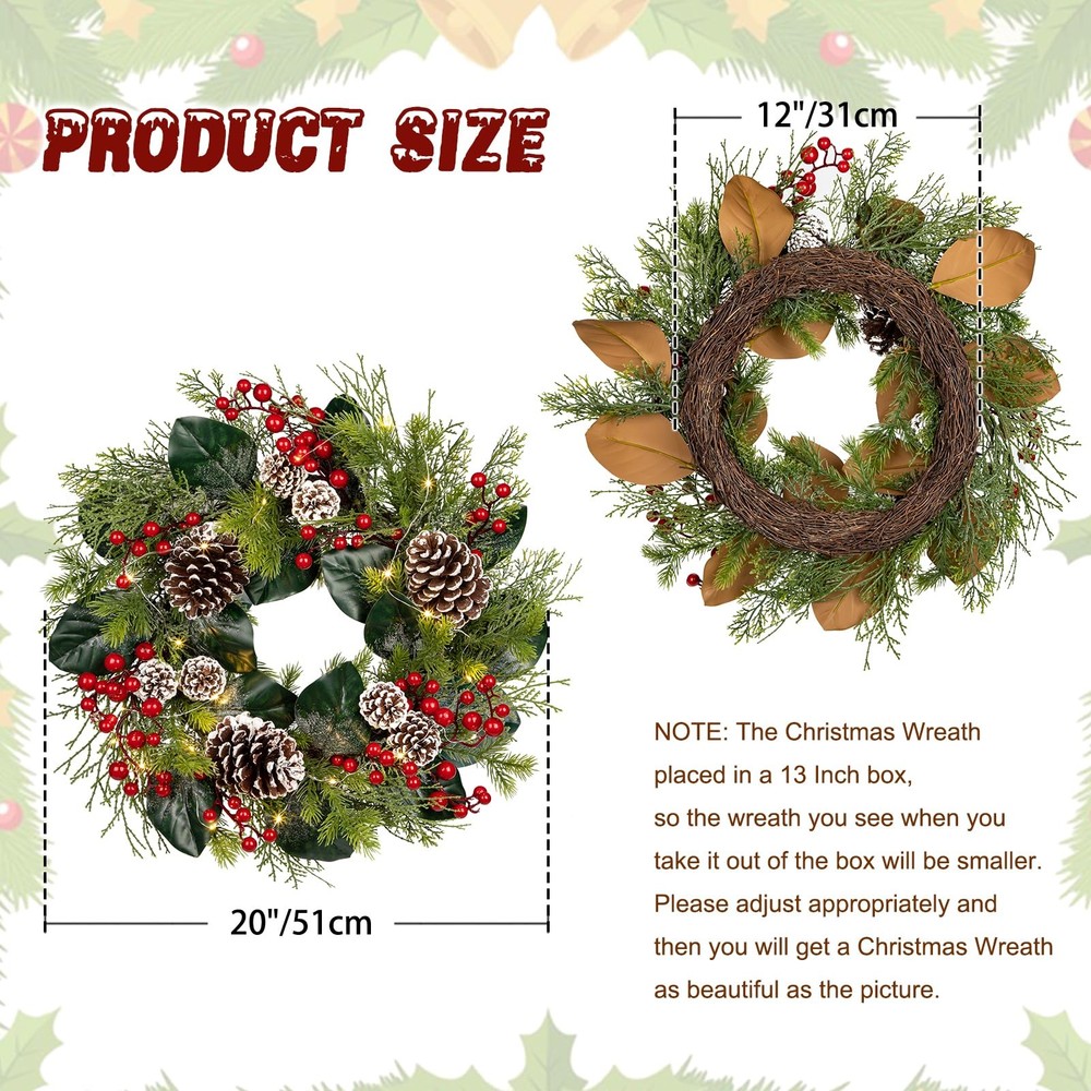 20 Inch Outdoor Lighted Christmas Wreath for Front Door This artificial wreath is an attractive addition for indoor and outdoor decoration, especial for Christmas. Using it can get more festive atmosphere and express your love for life. It will look great in any decor, use this wonderful winter or fall front door wreath for festive fall, winter, and Christmas decorations in your home or covered outdoor locations. Product Specification Quantity: 1 x Christmas Wreath with Light String Elements: Pine Cone / Red Berries / Cypress Leaves / Magnolia Leaves Overall Product Dimensions: 20" Package Dimensions: 13"L x 13"W x 5"H Rattan Base Dimensions: 12" Meterial: Polyethylene / Iron / Foam / Rattan Style: Christmas Decor Notes: The color may exist a slight difference due to different screen displays. For better display, please extend the wreath when you take it out of the box. Please allow a little size difference due to manual measurement. Christmas Ornaments: Welcome to choosing our Christmas wreath! This chic artificial Christmas wreath combines different festive elements and adds a festive atmosphere to your home. Hang the holiday wreath on your front door to warmly welcome visitors and offer them a warm welcome! Classic Xmas Elements: Prelit Christmas wreath is trimmed with flocked pine cones, red berry clusters, magnolia leaves, cypress leaves and LED string lights(batteries not included), features a natural grapevine base. All beautiful Christmas elements create a lively feel to your holiday decor Realistic Artificial Wreath: Constructed with sturdy, high-quality artificial polyethylene materials this hanging wreath decoration is built to bring holiday cheer for year after year. The Christmas wreath with lights is also an elegant festival gift. You can give it as an ideal gift to your relatives and friends to express your blessing and care Festive Decoration: Hang this LED Christmas wreath on the front door, wedding, mantel, staircase, home, wall, window, fireplace, living room, backdrop, mirror, bedroom, dining room, porch to complement both indoor and outdoor decoration and create a uniform festive decoration effect, for an unforgettable Christmas with your family Exquisite Craftsmanship: Treated with the latest pressing technology to prevent elements from falling off the wreath. This winter wreath will retain its original colors and lifelike appearance for years. Note: For better display, please extend the wreath when you take it out of the box