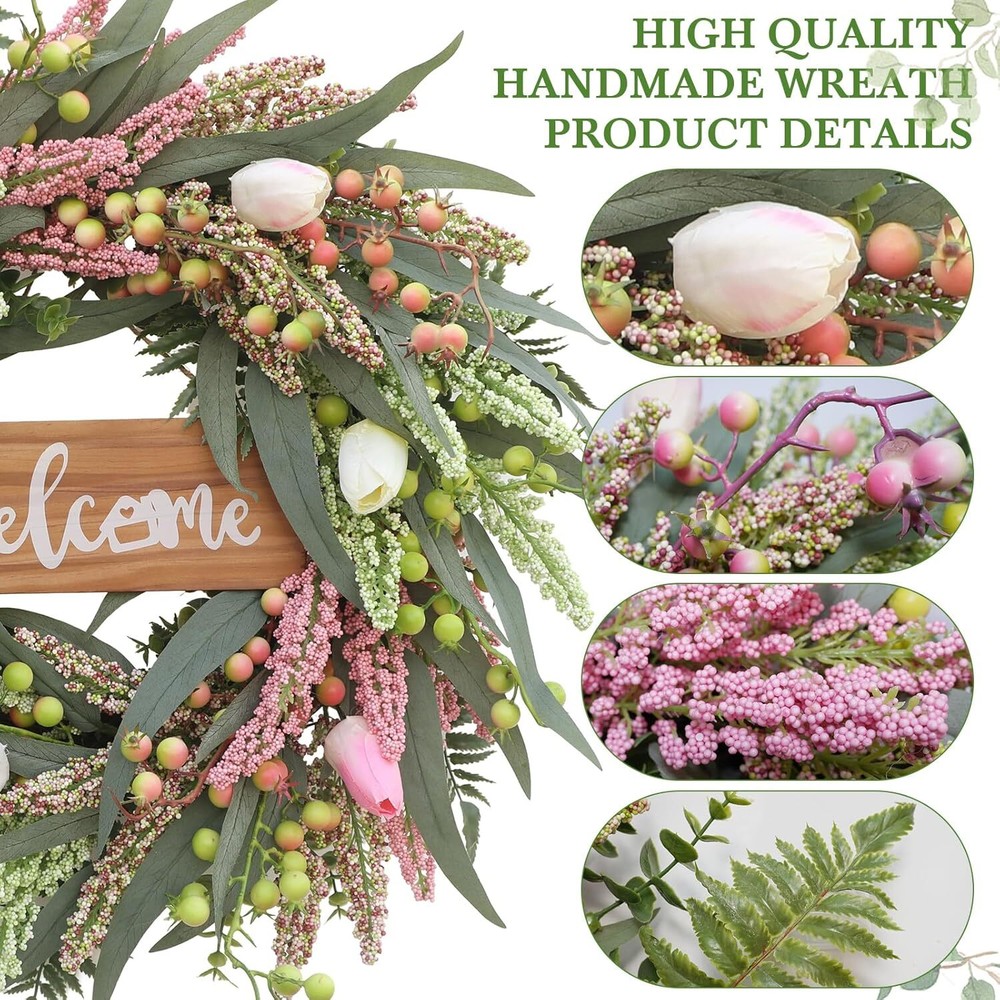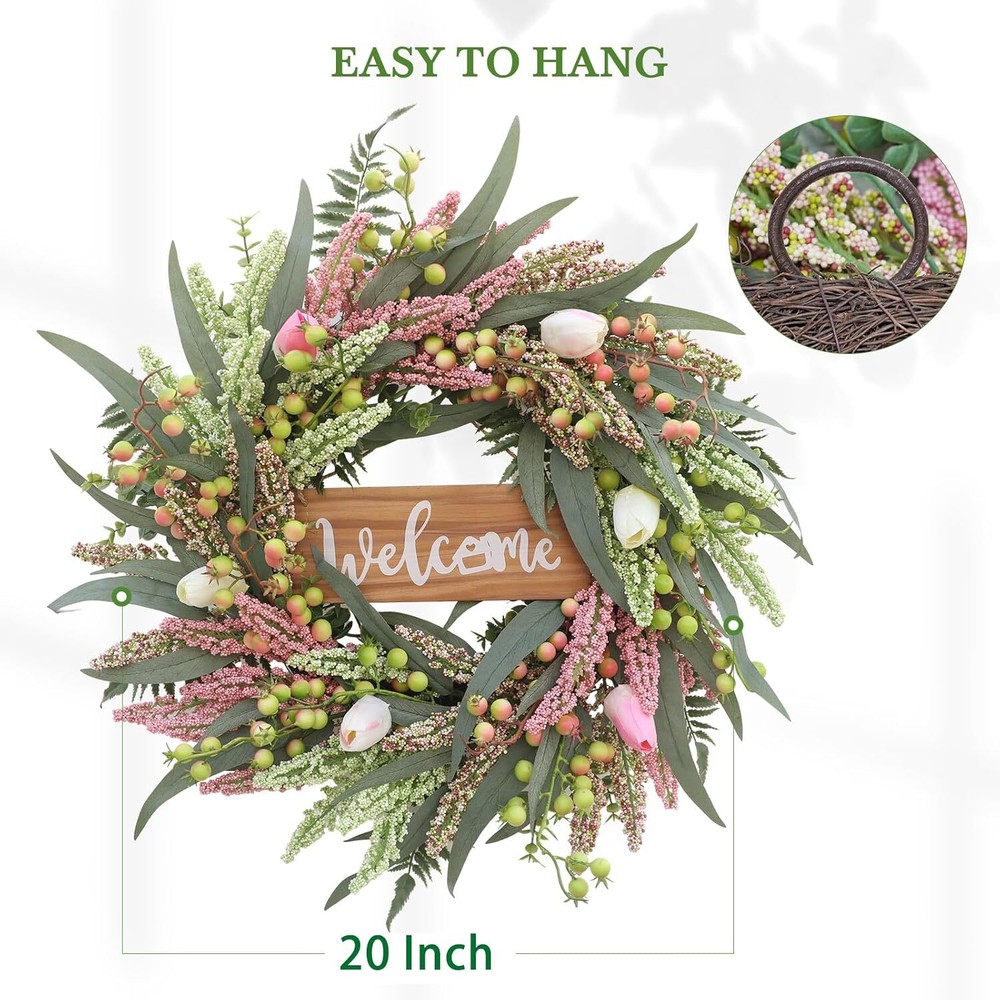 Wreaths for Front Door 20 Inch Tulip Wreath withTulip,Berries,Boxwood and Cattails Welcome Door Wreath, Porch, Window - Green Decor for Home, Farmhouse - Spring, Summer, Fall, All Seasons Item Description About this item 【Full and realistic】 Green eucalyptus leaf wreaths hand - made by Wish Wreaths,features eucalyptus leaves, tulip,green berries, andmany Made from lots of small berries in various colors, these look like cattails embellishedon it, making the wreath full, natural and realistic. Its elegance add a vibrant and pleasant vibe to your home. 【Perfect Size】 This spring wreath is 20 inches in diameter. Each rustic farmhouse eucalyptus wreath is packed in a sturdy and exquisite box, suitable as a gift for friends. Note that because the wreath is compressed by the box to avoid being damaged during delivery, please fully stretch it to reach its maximum size. 【Versatile】 It is suitable for all seasons of the year, spring, summer, fall and winter. You can add elements of each season on it, such as maple leaves, bells, etc. welcome wreaths It comes with a solid wood "welcome" sign. You can use it in cafes, restaurants, malls, and more. And you can DIY it however you like! When you design it yourself, you will find that your wreath is the most unique scenery 【Durable】Made of high-quality materials. Colors will never fade; leaves will never fall; berries will never rot.The base of the front door wreath is made of Anatural grapevine base, which is solid and not prone to falling off, ensuring lasting stability. It can be hung on the wall, front door, porch, bedroom, living room, etc. It is perfect for indoor and outdoor, weddings and parties. It's elegance is sure to impress your family and friends. 【Guarantee】: All our spring wreaths for front door are guaranteed by quality,And every wreath is handmade. If there are any problems with our products, please 【contact us】 at the first time, we will definitely give a perfect answer. › See more product details Payment We accept payment only through PAYPAL Shipping We ship products worldwide through standard express courier service, it will reach within 7 to 10 days to abroad buyers, we ship the product after recieved clear payment and give full information about shipment to the buyer Return We accept product return within 7 to 21 days from delivery date but product should be in original position and not in damaged condition,the return shipping charges will be buyer responsibility