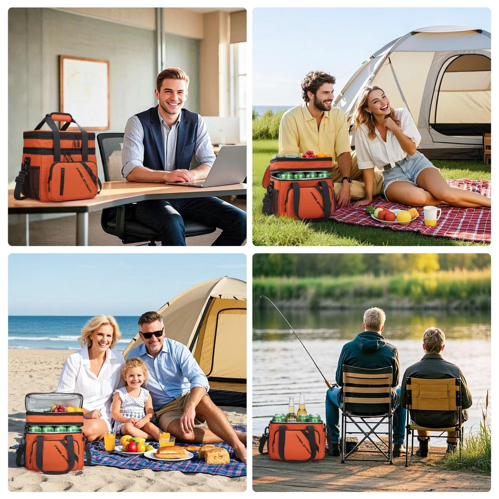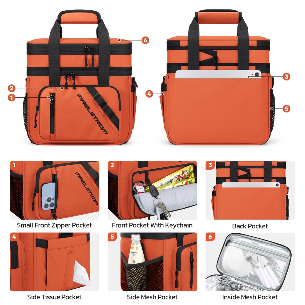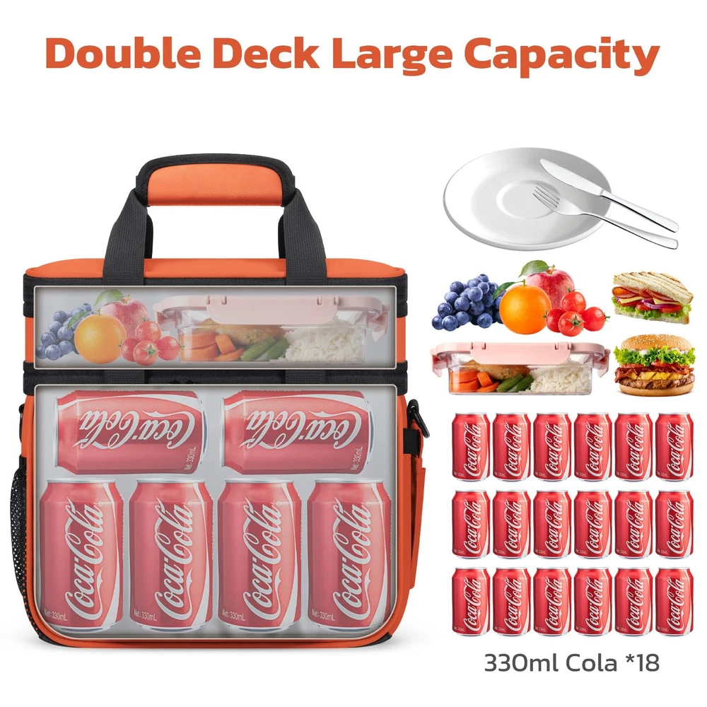 Large Capacity: lunch bag women uses an expandable design, divided into double layers, the lower layer can hold 18 cans of 330ml cans of drinks. The upper layer can hold some snacks, fruit, or lunch boxes, easily solving all your lunch needs. Also, with 2 side pockets, 2 front pockets,1 back pocket, and 1 Inside Mesh Pocket, these 6 pockets increase the practicality of this large lunch box Leakproof & Easy to Clean: The lunchbox men is made of extra-thick PEVA soft lining and heat-pressed seamless stitching to ensure leakproof and keeps food fresh. Premium SBS two-way zippers are smooth and durable for opening and closing. Besides, it is easy to clean, just wipe it with a napkin Excellent Thermal Insulation: The insulated lunch bag adopts 5 layers insulation materials, the exterior layer is rip-stop polyester fabric, the inner layer is made of 210D waterproof and food-grade PEVA material, and the middle layer is specially filled with 5mm thick insulating foam provides excellent protection for your food or drinks, which can keep cold or warm for up to 16 hours Multi-function Design: lunch box for men has a special keychain design on the front pocket, which is convenient for you to take out your keys to prevent loss. The side tissue pocket design allows you to take tissues at any time during the meal. Another inside mesh pocket is designed for placing knives, forks or spoons. An ideal gift choice for family and friends! Convenient Portable: This cooler lunch bag comes with an adjustable shoulder strap and durable handle. The lightweight design is very suitable for women, men and adults, you can crossbody or handheld, foldable and does not take up space, easy to carry. Perfect for office, travel, hiking, fishing, picnics, and various outdoor activities