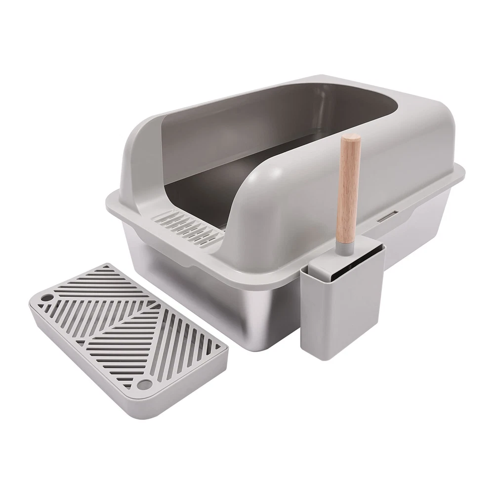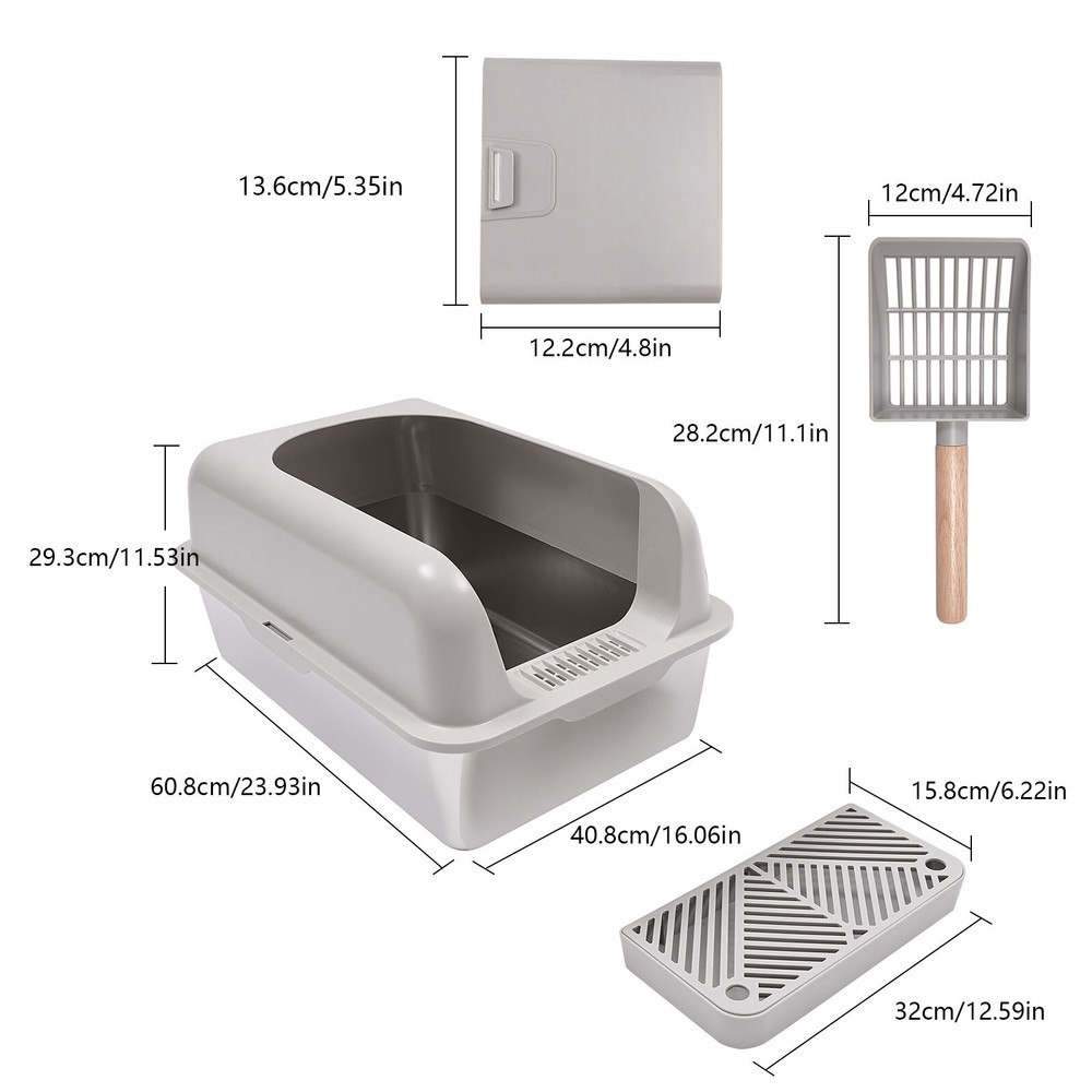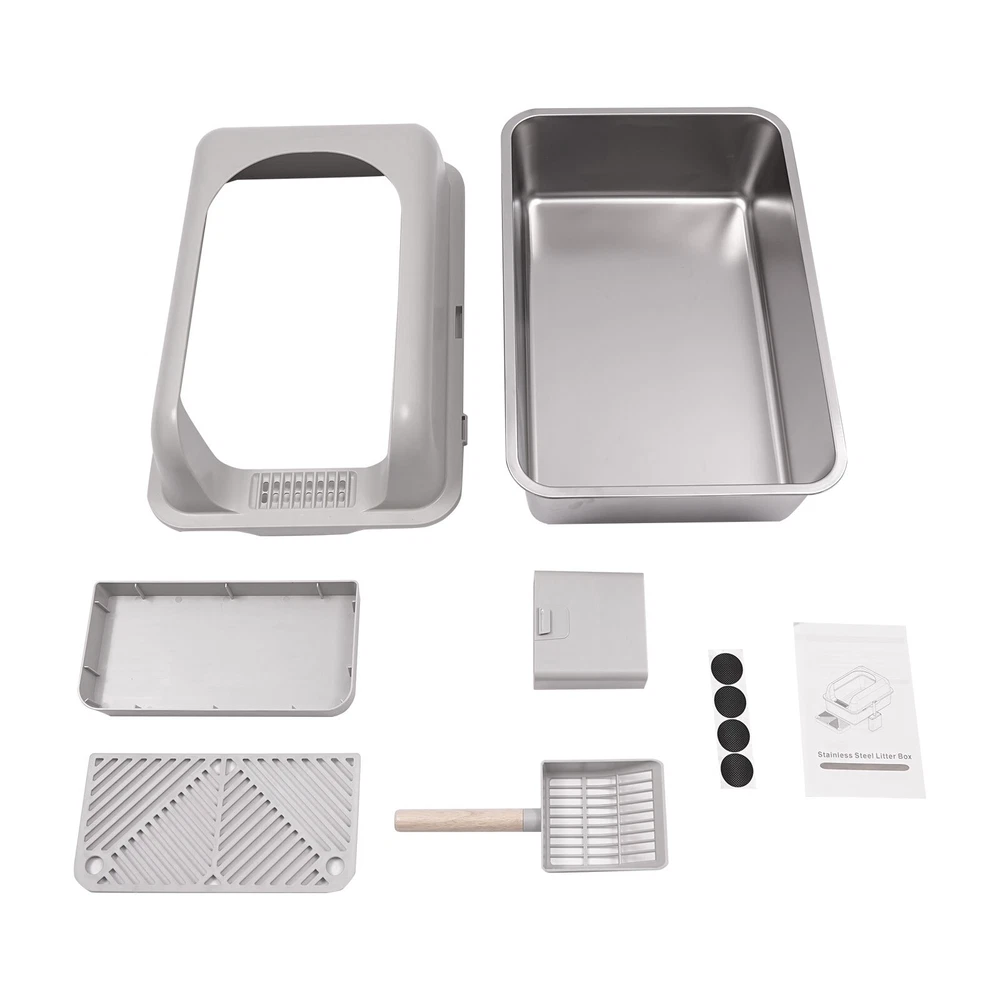 Specification Material: Stainless Steel, ABS Process: Electrolysis, Injection Molding Color: Light Gray+Silver Assembly Required: Yes Style: Modern Mount Type: Floor-Mounted Capacity: 20L/5.28gal Applicable Cat Weight: ≤10kg/22.05lbs Fence Height: 15cm/5.91in Litter Collecting Pedal Size: 32*15.8cm/12.6*6.22in Litter Scoop Size: 12*28.2cm/4.72*11.1in Litter Scoop Holder Size: 13.6*12.2cm/5.35*4.8in Product Size: 40.8*60.8*29.3cm/16.06*23.94*11.54in Package Size: 62*42*20cm/24.41*16.54*7.87in Gross Weight: 4.3kg/9.48lbs Net Weight: 3.5kg/7.72lbs WELCOME Description Do you want to provide a more comfortable living environment for your furry friends? Our stainless steel cat litter box is designed specifically for modern cat households, combining the antibacterial ability of stainless steel with a semi-open design to provide your pet with a comfortable and hygienic toilet environment. Come and purchase our products to make pet care easier and more enjoyable, and make pet life more comfortable. Key Features High-quality Materials: This product is made of high-quality stainless steel and ABS, and has undergone injection molding and electrolytic treatment. It has excellent resistance to bacteria , corrosion, rust, and stains, and can be used for a long time to be as beautiful as new. Semi-open Design: The large outlet above facilitates cats to enter and exit, reducing odors and bacterial growth caused by enclosed spaces, which helps maintain the hygiene and health of the cat's toilet environment. Large Size: With a size of 16.06*23.94*11.54 inches and a capacity of 5.28 gal, it is more spacious to provide a more comfortable environment for cats, and even multiple cats can use it freely. 360° Protection: The 5.91-inch guardrail can effectively prevent cat litter from splashing 360°, providing cats with a sense of security, allowing them to dig freely while keeping the surrounding environment clean and reducing cleaning frequency. Humanized Design: The enlarged litter intake aperture and litter collection pedals make it easy to retrieve leaking litter to reduce waste, and it's also the guardian of indoor cleanliness. Thoughtful Design: 4.72*11.1-inch cat litter scoop allowing you to quickly clean the litter box. The equipped cat litter scoop holder allows you to hang the scoop next to it for easy access. Easy to Clean: The smooth stainless steel surface does not easily adhere to cat litter and is less prone to bacterial growth. The detachable design allows you to disassemble the product for thorough cleaning. Ideal Gift: Thanks to the practicality and beautiful appearance of this product, you can give it as a gift to your pet friend on birthdays, housewarming, Thanksgiving, Christmas, or other holidays. Details Round Corners: They can better care for cats and your hands. Anti-Slip Foot Pads: They can make the product stand firmly on the ground and prevent slipping during use. Practical Handles: They allow you to move this product easily . Buckle: You can quickly install the litter scoop holder on the product through it. Application This product is suitable for cats weighing less than 22.05 pounds and can be placed in living rooms, corridors, bedrooms, balconies, pet shops, animal shelters, breeding centers, veterinary hospitals, cat sheds, and cat exhibitions. Specification Material: Stainless Steel, ABS Process: Electrolysis, Injection Molding Color: Light Gray+Silver Assembly Required: Yes Style: Modern Mount Type: Floor-Mounted Capacity: 20L/5.28gal Applicable Cat Weight: ≤10kg/22.05lbs Fence Height: 15cm/5.91in Litter Collecting Pedal Size: 32*15.8cm/12.6*6.22in Litter Scoop Size: 12*28.2cm/4.72*11.1in Litter Scoop Holder Size: 13.6*12.2cm/5.35*4.8in Product Size: 40.8*60.8*29.3cm/16.06*23.94*11.54in Package Size: 62*42*20cm/24.41*16.54*7.87in Gross Weight: 4.3kg/9.48lbs Net Weight: 3.5kg/7.72lbs Package Included 1* Stainless Steel Cat Litter Pan 1* Guardrail 1* Cat Litter Scoop 1* Litter Scoop Holder 1 * Litter Collecting Pedal 4 * Anti-slip Pads Notes Please check the style and size before purchasing. Please note that cat litter is not included in this product. Cat litter (not included)needs to be evenly spread in the litter box, with a thickness of 1.18-1.57 inches, and maintained at this thickness. Please clean the used litter promptly after the cat uses the litter box. If there are multiple cats at home, the litter replacement cycle can be shortened proportionally. It is recommended that households with one cat should replace it every 30 days, and households with two cats should replace it every 15 days. Please allow the slight color difference caused by the shooting light and 1-3cm error due to manual measurement, and make sure you do not mind before ordering. Payment Delivery details Terms of sales About us Contact us Payment We accept ebay payment 。 Fees such as import duties, taxes are not included in the item price or shipping costs. These charges are the buyer's responsibility. Delivery details Shipping: 2-9 working days to: USA Terms of sales We maintain high standards of excellence and strive for hundred percent customer satisfaction. Feedback is very important to us. We hope that you contact us immediately before you give neutral or negative feedback, so that we can address your concerns. It is impossible to address issues if we do not know about them! About us Your satis faction is our ultimate goal. We work hard to earn your trust and future business. Our certified technicians have tested each item before shipping. The unit comes with 1 year limited warranty on all manufacturing defects. a) If you receive a defective item, you may return it or ask for a discount. Please contact us within 14 days after you receive the package. b) What you returned must be intact and in its original packaging as re? u. Customer is responsible for shipping costs of the returned item. c) We will cover the cost of shipping back t with the shipping rate indicated in the registration page. We