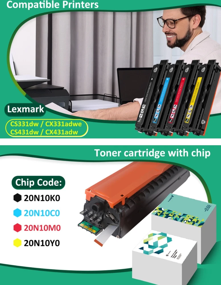 #2827 20N10K0 Black Toner Cartridge(with chip) for Lexmark CS331dw CS431dw CX331adwe CX431adw Printer,1,500 Pages High Yield Ink Cartridge Compatible 20N1HK0,20N1XK0 (2 Pack Black) Brand INKEEP Color 2 Black Included Components Toner Cartridge Compatible Devices Lexmark CS331dw, CS431dw, CX331adwe, CX431adw Printer Compatibility Options Lexmark CS331dw, CS431dw, CX331adwe, CX431adw Page Yield 1500 Packing list:2 Pack 20N10K0 black toner cartridge. Compatible Printer:20N10K0 black toner cartridges set for Lexmark CS331dw CS431dw CX331adwe CX431adw printer. High Capacity:20N10K0 black toner cartridge yields approximately 1,500 pages (at 5% coverage).Compatible 20N1HK0 and 20N1XK0 extra high yield cartridges. Stable Quality:Each toner cartridge undergoes a rigorous testing process to ensure toner quality and compatibility with your printer. After-sales Service: We provide lifetime technical support and replacement of defective toner cartridges, always ready to solve your problems. What's in the box Toner Cartridge