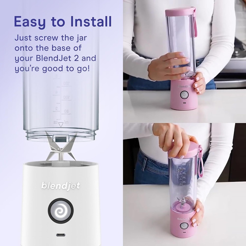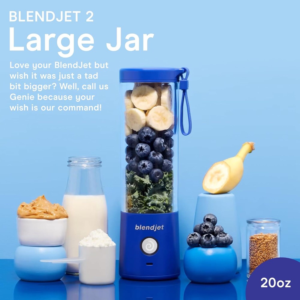 20-Ounce Jar for BlendJet 2 Portable Blender - Large with White Product Details Recommended Uses For Product: Smoothies Special Feature: Portable Container Shape: Cylindrical Closure Type: Flip Top Is Dishwasher Safe: No Item Package Quantity: 1 Product Care Instructions: Dishwasher Safe Item Volume: 2E+1 Fluid Ounces Is Microwaveable: No Item Form: Bottle Manufacturer: BlendJet Specific Uses For Product: Smoothies UPC: 810053643297 Lid Material: Flip Top Product Dimensions: 7.35 x 3 x 3 inches Item Weight: 10.5 ounces Brand: BlendJet Color: White Material: Glass Material Feature: Reusable, Food Grade Capacity: 5.9E+2 Milliliters Thirsty For More?: Love your BlendJet but wish it was just a tad bit bigger? Well, call us Genie because your wish is our command! This 20-ounce jar can hold 25% more than the standard BlendJet 2 jar so you can finally make those big blends you’ve always wanted. And before you ask – no, you don’t get two more wishes. So Much Room For Activities: This 20-ounce jar gives you the space you need to take your blended creations to the next level. Add that extra scoop of protein to your shake, that additional shot of espresso to your frappe, or that fistful of greens you conveniently never had room for in your smoothie before. Ditch the Measuring Cup: Leave those measuring cups in the kitchen drawer. We put measurement markings right on the jar to take the guesswork out of recipes. Let’s be honest though, you’re just going to ignore them and eyeball it as usual, aren’t you? So Fresh, So Clean: If you’re like us, you’re not a huge fan of cleaning. That’s why we designed the BlendJet 2 to clean itself, even with this 20-ounce beauty attached. Just add water, a drop of soap, and blend. Then watch as your BlendJet magically cleans itself. Remember to tell your BlendJet “thank you” for being such a good little helper. Installation is a Cinch: No screwdriver required. All you have to do is unscrew the standard jar from the base of your BlendJet 2 and screw on the 20-ounce jar. If you manage to screw that up, you most likely have a screw loose. Everyday Wellness: BlendJet was born from a desire to make the healthy choice the most convenient choice for all. Our mission continues to inspire and shape our innovative products, driving us towards a world where good health is within everyone's reach.