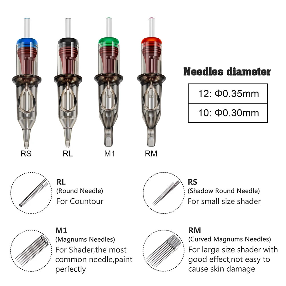 Specifications: Type: Tattoo Cartridge Needles Diameter: 0.30mm and 0.35mm for Choose Material1: Plastic Material1: 316 Medical Stainless Steel Color: 4 Colors for Different Size Condition: 100% New Package: 20PCS a Box Features: PACKAGE & SIZE - Yangna 100PCS disposable mixed tattoo cartridge needles, including 1003RL, 1005RL, 1007RL, 1009RL, 1205RS, 1207RS, 1207M1, 1209M1, 1207CM, 1209CM ( 10pcs of each size) for all cartridge tattoo machine pen. These mixed tattoo cartridge needles will meet your tattoo request for liner and shader. GREAT MATERIAL - Yangna Needles cartridges is made of 316L super stainless steel and high-grade plastic. Light clear colors tip body to easy to observe the needle striking, needle bar design is more advanced, letting the cartridge needle contact skin without dead spaces. EASY TO USE - Allows artists to set up cartridge needles and switch needle configuration very quickly during working process. Low profile housing & better ink flow & shaped on the inside. Filling in the colors is easy, dipping machine needles into a small pot of color or by filling color into the upper opening of cartridge. SAFETY MEMBRANE - Safety membrane inside cartridges system, that stops ink from passing through to the tube or cartridge machine. The cartridge needles are compatible with cartridge grips and machines. Cartridges come with close mouthed tips which can make needles strike more steady. SATISFACTION GUARANTEED - Yangna is a professional equipment manufacture over 10 years. We are constantly updating our products. Feel free to contact us if you have any issues about the Cartridge Needles or other products, all issues will be solved within 24 hours. We process refund or send you a replacement. Note: We also have other size cartridge tattoo needles. If you need you can contact us or find the tattoo needles which you need in our Yangna Official Store. Because of the difference between different monitors, the pictures may not reflect the actual color of the product. The size such as 1003RL, the "10" means the diameter of the cartridges is 0.30mm, and the "12" means 0.35mm. 20pcs RL/RS/M1/CM Size Disposable Sterilized Tattoo Cartridge Needles for Choose