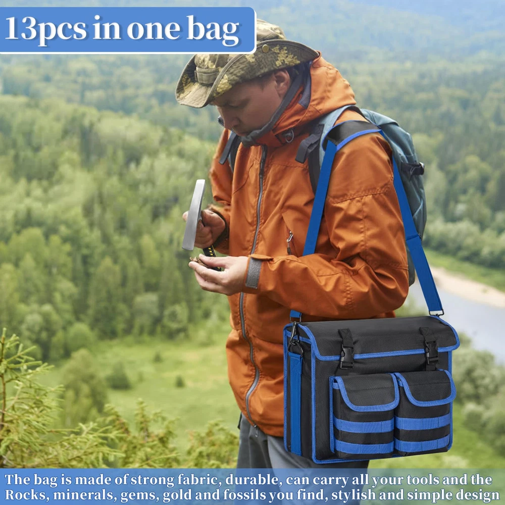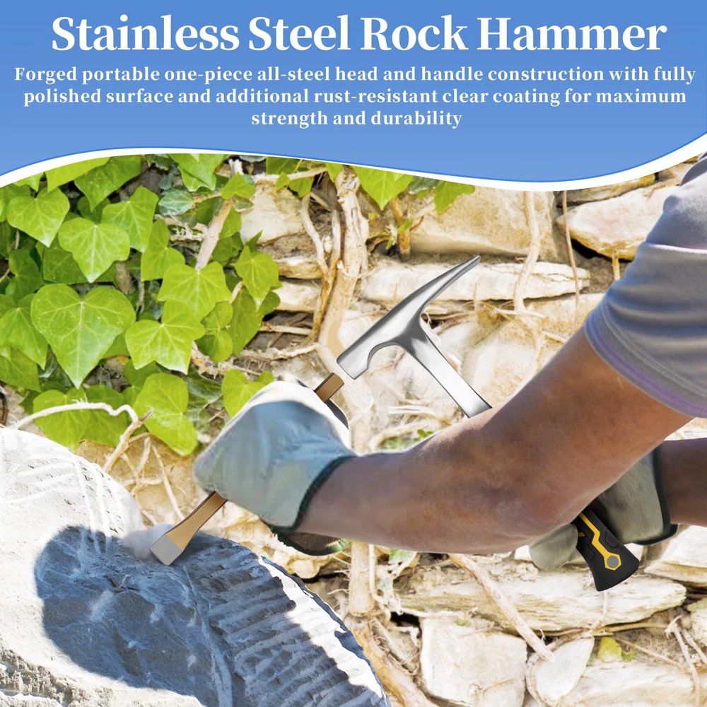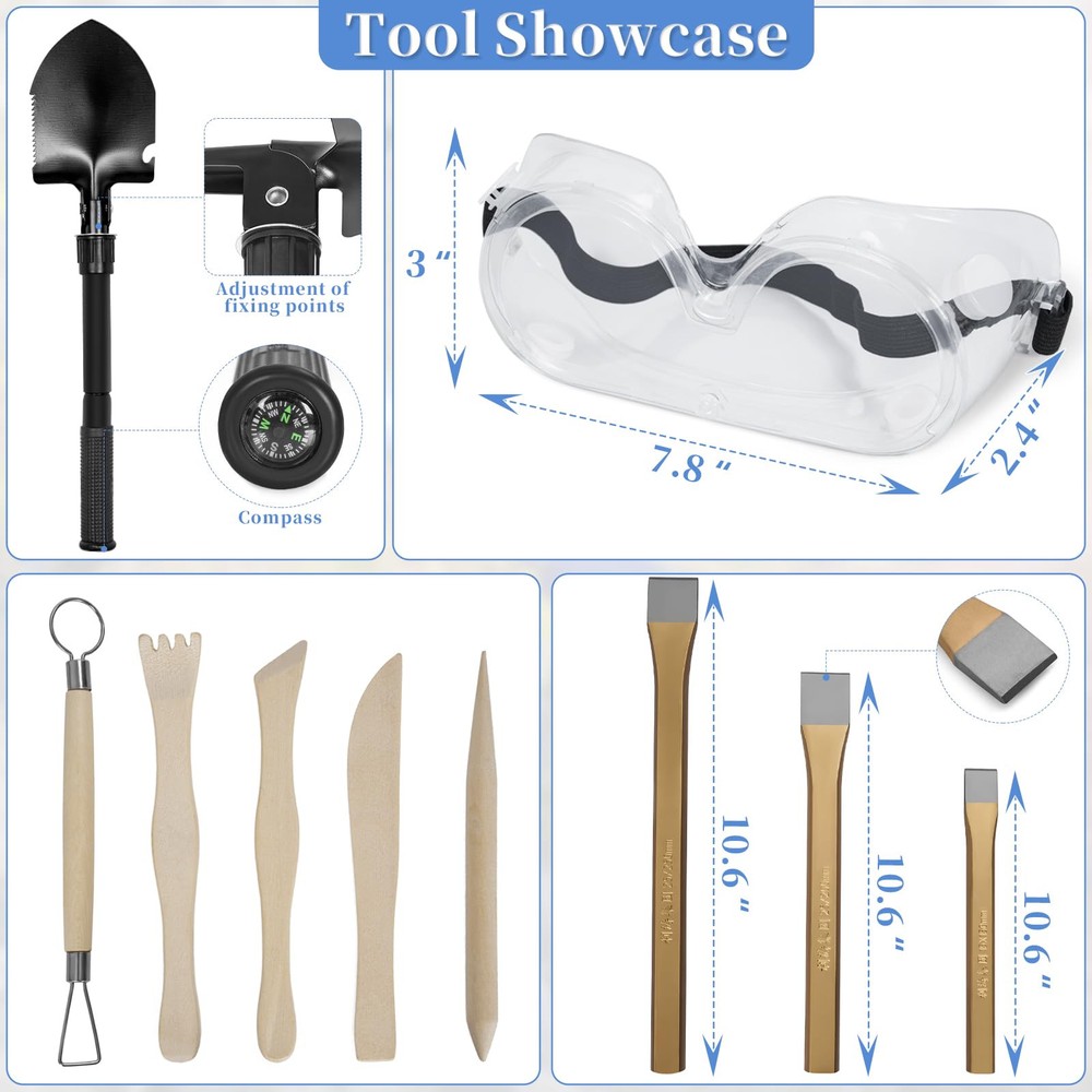 【Sturdy and Durable Storage Bag】Sturdy and durable storage bag with multiple storage pockets and snap-on design to keep your tools protected and quickly accessible. Carry all your tools and the rocks, minerals, gems, gold and fossils you find neatly and easily 【Rock Kit Tools Included】rock kit comes with a large canvas bag, rock hammer, 6-piece chisel set, anti-fog safety goggles, jewelry magnifier, small wooden brush, compass, whistle, multi-purpose shovel, 1 pair of gloves, 5-piece wooden pottery knife set 【Chisel Set】Our chisels are 5.9inches, 7.8 inches, 9.8 inches in length to meet various needs. They are made of high-strength forged steel and are good at chiseling bricks, concrete, metal and stone, allowing you to use them easily in exploring various geological formations 【Rock Tool Kit】For holidays, you can take your children to play outdoors. If you are not satisfied with our geological rock pick hammer kit tools, we are more than happy to solve it for you. Let you order with 0 risk 【Geological Tools to Inspire Interest】Provide budding rock enthusiasts with the right tools to inspire their passion for exploration. This kit is convenient and brings together all the basic tools