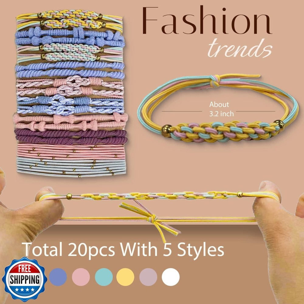 Hair Ties for Women Girls, 20 Pcs Boho Dual-Use Bracelets and Hair Tie for Thick Hair/Pony Tails, No Damage No Crease Elastics Hair Rubber Bands Ponytail Holders (Elegant) Features Soft & Stylish: You will get 20 pcs hair tie bracelets, 5 different styles, 10 colors for each stlye, enough quantity and styles to meet your daily needs, this hair tie has an artistic pleasing boho style which can be worn both as a hair tie and as a bracelet. A stylish bracelet when it's on the wrist and a hair tie when you need to tie your hair. Unique and distinctive in a crowd of bright hair ties everyone always uses. Super Comfortable Elastic: These hair ties for women is made of soft nylon which is elastic well and not easy to stretch out or break. Easy to remove without leave hair creases. Just twists around a ponytail for 2~3, it will stay well, so easy to use. Sturdy & Hard-wearing: These elastic hair ties are made from soft nylon cotton and designed with sturdy rubber band inside. Elastic, robust and not easy to break or deform. And braided design can keep your hair secured for a long time without loosing no matter when you are doing sports or working. Widely Application: Our cute hair holders can be use to all hair types. You can DIY all hair types with these hair elastics. It can easily stretch and tightly fix the hair during work, sports or entertainment and many other occasions, and keep the hair style all day long. Hassle-Free Customer Service: We stand firmly behind our products. Each TENGYES product comes with 12 months customer service. For quality related issues, a replacement is allowed. Shipping Free & Fast Shipping: We offer free shipping to most of the USA with a normal delivery time of 3-7 days. However, due to the current situation, additional delivery time (up to 3 weeks) may be required for some items. Alternative Carriers: We may use alternative carriers (e.g., USPS, FedEx, UPS) to ensure your package arrives safely and on time. Due to the use of multiple carriers, we are unable to provide a tracking number automatically. Handling Time: Orders are processed and shipped within 1-2 business days of receiving cleared payment. Shipping Restrictions: Shipping to Alaska, Hawaii, Puerto Rico, Guam, and other US territories may incur shipping charges or delivery restrictions. Please contact us before ordering, or your order can be refunded/cancelled. State Restrictions: Certain items may not be shipped to California due to state regulations. Contact for Tracking Updates: If you require tracking updates or have any concerns about the delivery of your order, please feel free to contact us, and we will be happy to assist you. Return Policy 30-Day Hassle-Free Returns: If you are not completely satisfied with your purchase, you can return the item for free within 30 days of receiving it for a full refund or exchange. Easy Return Process: Contact us, and we will provide you with a prepaid return shipping label and detailed instructions. No Restocking Fee: There are no restocking fees for returns. However, the buyer is responsible for return shipping costs if the return is not due to a seller"s error. Refund Processing: Refunds will be processed within 1 business day of receiving the returned item in its original condition. Feedback Your feedback is extremely important to us. We strive to provide the best products and customer service possible. If you are satisfied with your purchase, please take a moment to leave us a positive review. If you have any concerns or issues with your order, please contact us before leaving negative feedback. We are committed to resolving any problems and ensuring your satisfaction. Contact Us If you have any questions or concerns, please feel free to reach out to our customer support team. You can contact us through the eBay messaging system. We are available Monday to Friday, 9:00 am to 5:00 pm EST, and we will do our best to respond to your inquiry within 24 hours. Thank you for supporting our small family business!