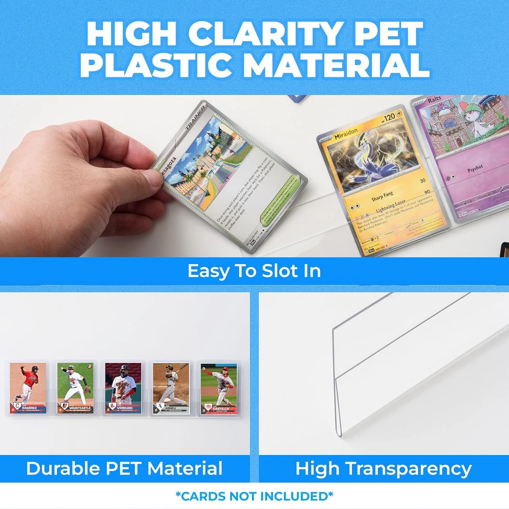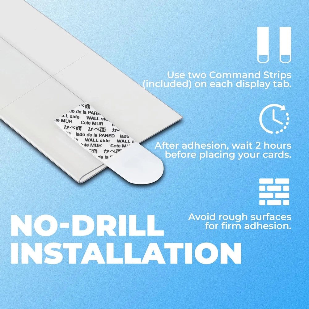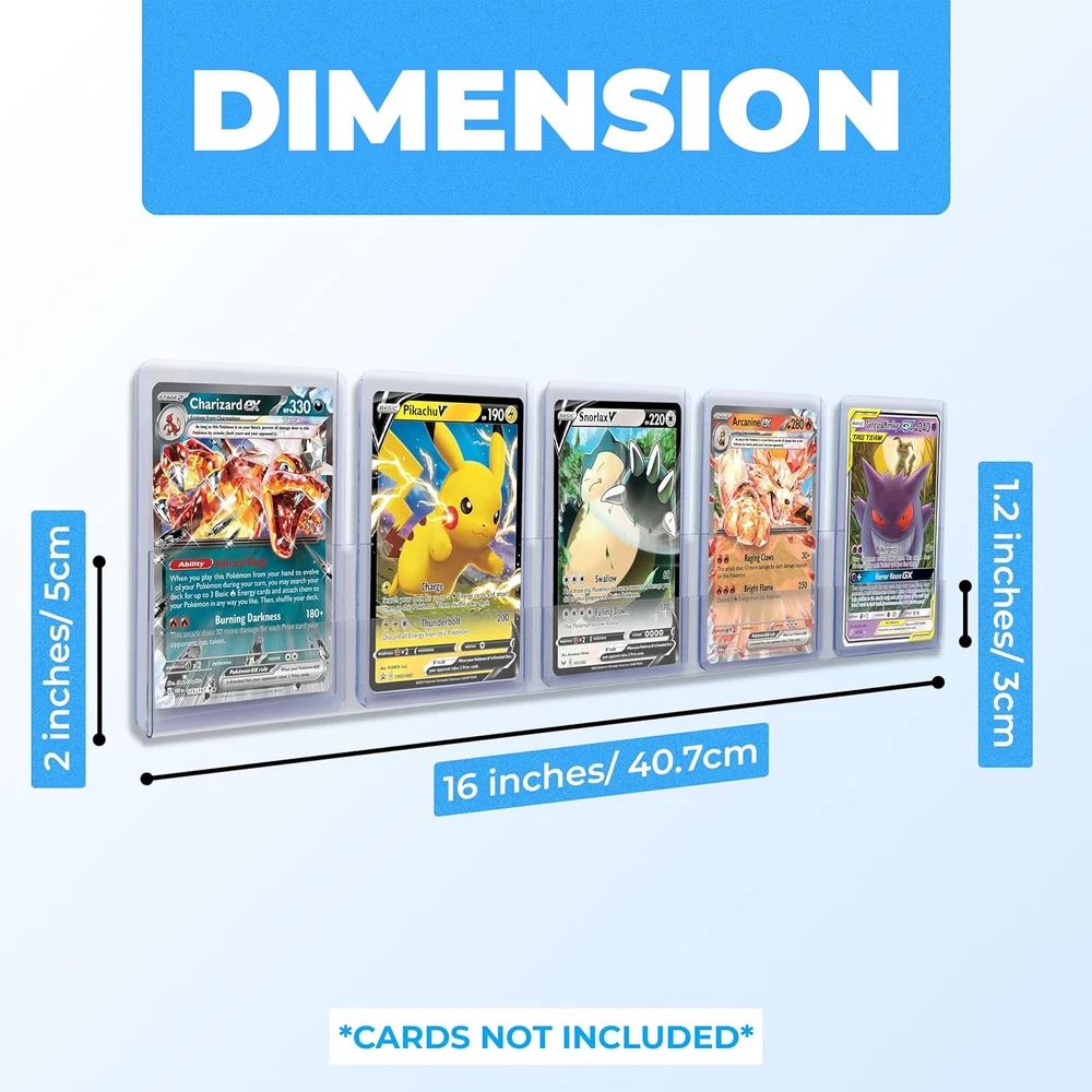 20-Pack PET Baseball Card Display Case - Hold Up to 120 20-Pack, Transparent Product Details Mounting Type: Wall Mount Frame Size: 16 x 0.08 inches Shape: Rectangular Manufacturer: DT Ultimate Product Dimensions: 16 x 0.08 x 2 inches Item model number: 24001-2 Color: Transparent Brand: Tapeera Product Dimensions: 16"L x 0.08"W x 2"H Frame Material: Plastic Item Weight: 1.28 ounces SIMPLE INSTALLATION - No screws needed! With the provided Command strips, installation is a breeze. Mount and position the display anywhere on the wall without hassle. SHOWCASE YOUR PRIZED COLLECTIBLE CARDS - Compatible with various trading game cards. Made from high-clarity PET material, it ensures your cards are showcased in all their glory. EASY CARD ROTATION - Changing displayed cards is a breeze. With its user-friendly design, even children can effortlessly swap out cards to showcase their favorites. SPACE-SAVING - a minimalist, transparent design perfect for organizing card collections on shelves in bedrooms, living rooms, or collector's spaces, optimizing space while seamlessly complementing any decor. VERSATILE GIFT - Ideal for card collectors, including sports cards, trading card games, and baseball cards serves as the perfect gift.