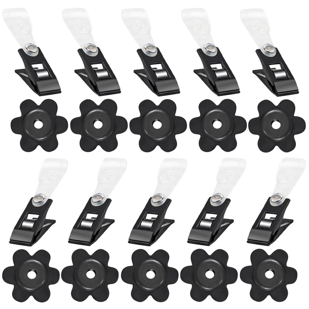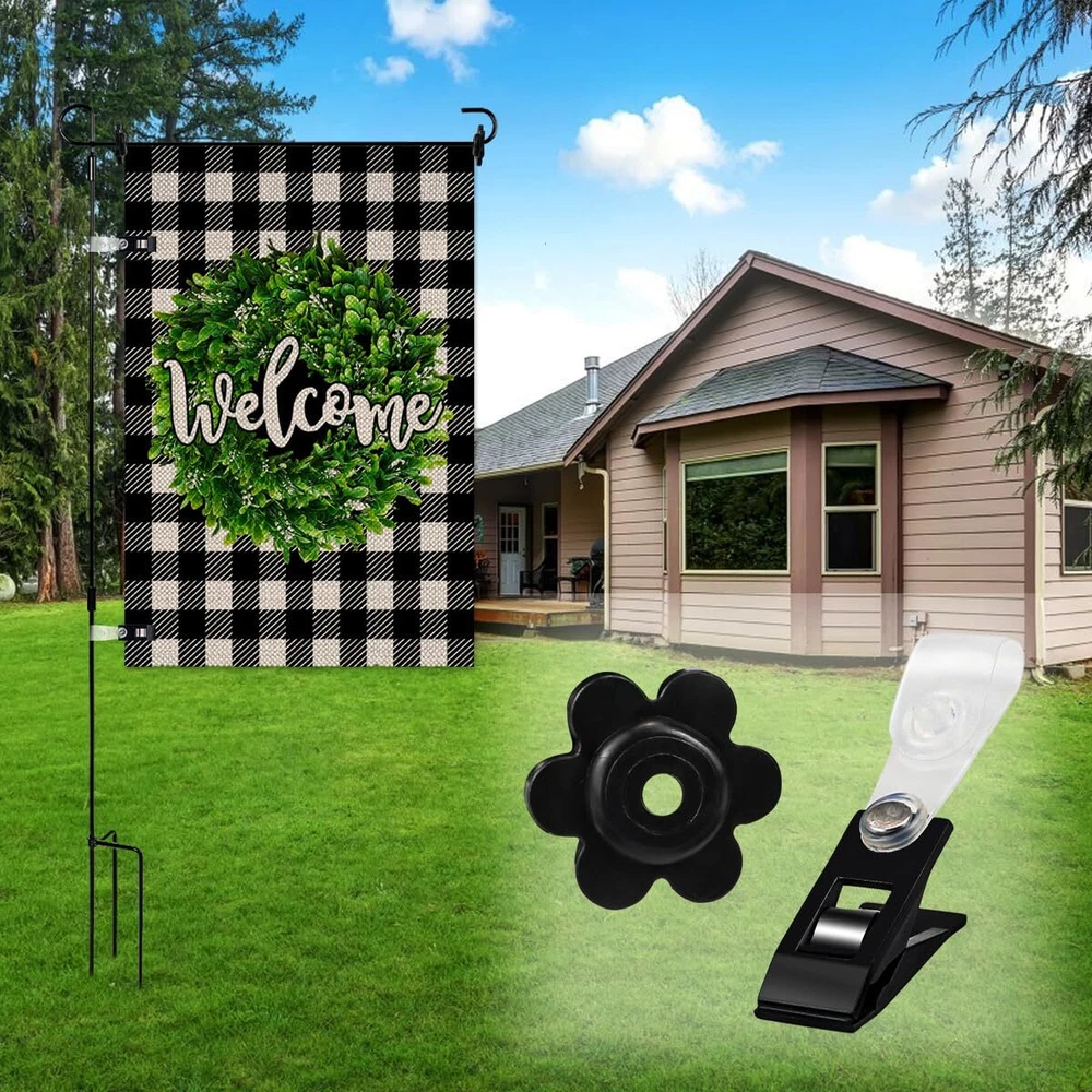Features Material:Plastic,Rubber Color: Black Flag Clips Size: About2.2x0.47inches/56x12mm Stoppers Inner Hole diameter: About 0.2inch/5mm Package Includes:10 x Garden Flag Clips,10 x Garden Flag Stoppers Notes 1.Manual measurement, please allow slight errors on size. 2.Choking risk may exist, please keep away from children. Package Content: Including 10 pieces of rubber garden flag plugs and 10 flag clips, which can work properly in the environment of sunshine, rain and wind. Tools For Fixing Flags: The flag clips and rubber stoppers are specially set for garden flag poles, the rubber stoppers are soft and thick and can be resized to fit different sizes of flag poles, this set can effectively prevent flags from blowing away, effectively prevent flags from being blown away and work properly in different weather. Easy To Install: The black flower-shaped rubber stopper with holes is put on the open end of the flag holder to prevent the flag from falling off, and it is put on in the same way as you put on the flag. The clip is at the bottom of the flag and clips onto the upright part of the flag stand, keeping your flag in place even on windy days, simple and easy to use. Flag Plug: The black flower shaped rubber plug has a diameter of about 1.14 inches and the black flower shaped rubber plug has an inner hole diameter of about 0.2inches, it has good flexibility to fit snugly to most garden flagpoles. Flag Clip: The clip is about 2.2 inches in length and the clip holds the flag well so that it doesn't roll around the top of the flagpole when it's windy outside. It keeps your flag in place so you can enjoy it without always having to adjust it.