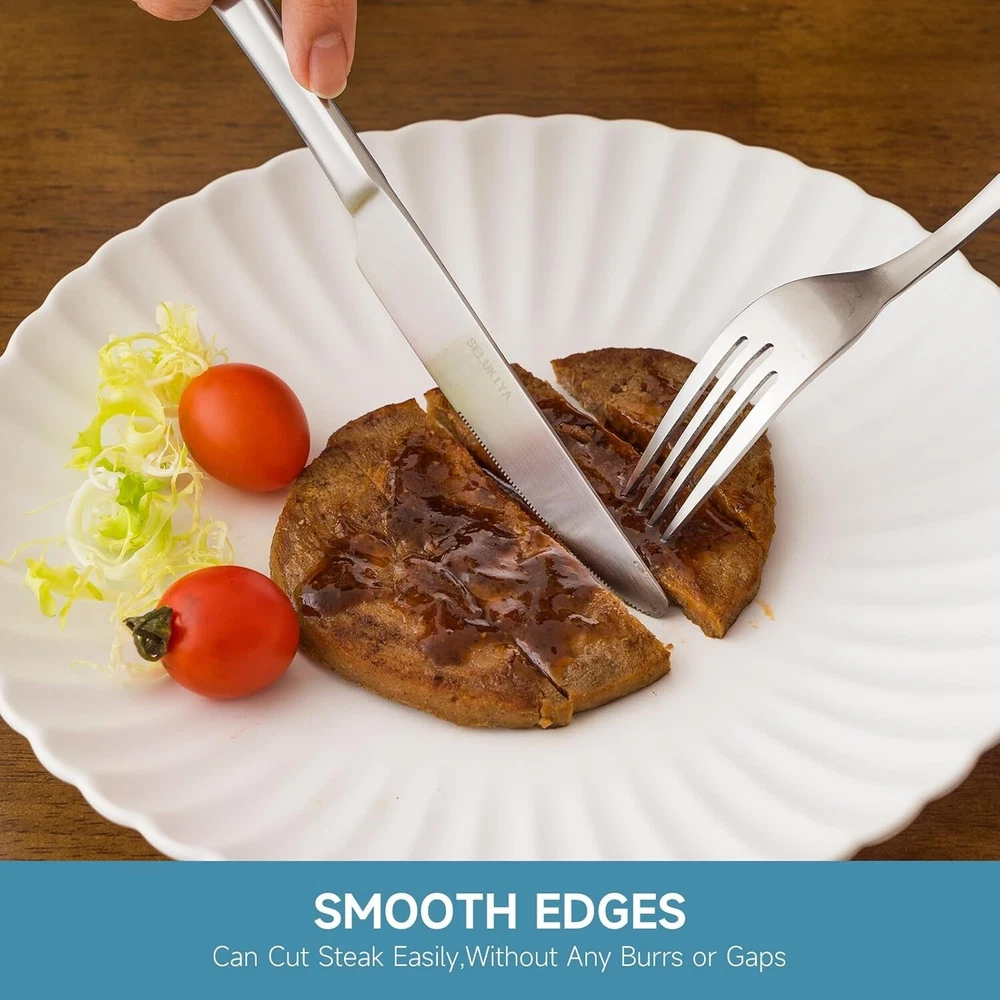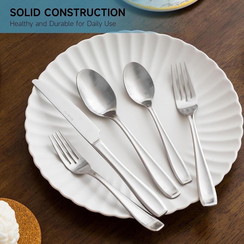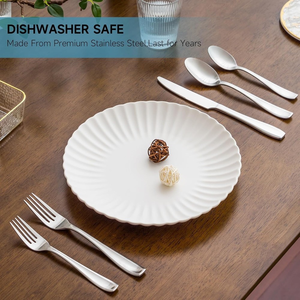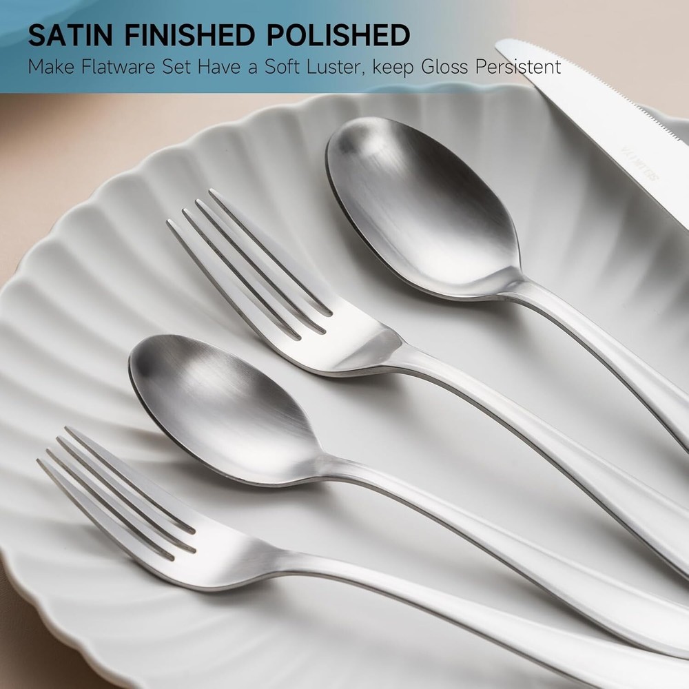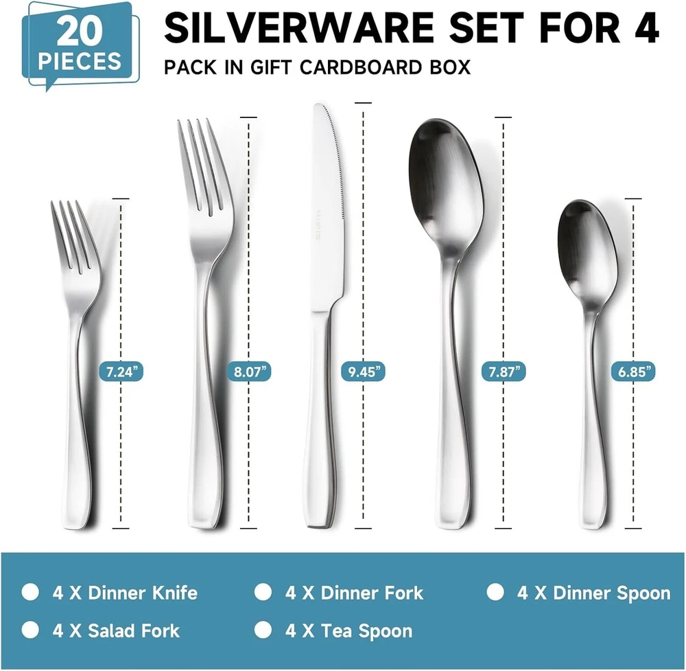 Complete 20-Piece Set : Includes 4 dinner forks, 4 knives, 4 dinner spoons, and 4 teaspoons, plus 4 salad/dessert forks—everything you need for a full table setting. Durable Stainless Steel : Resistant to rust, corrosion, and staining, ensuring long-term durability. Matte Silver Finish : Smooth, modern look with a subtle sheen, perfect for contemporary table settings. Stylish Design : Minimalist yet elegant, enhancing your dining experience without overwhelming the table. Perfectly Balanced : Well-crafted pieces designed for a comfortable grip, providing a pleasant eating experience. Dishwasher Safe : No need to handwash—simply place in the dishwasher for easy cleaning. Fingerprint-Resistant : The matte finish helps to hide smudges, keeping the flatware looking pristine for longer. Rustproof and Non-Tarnishing : High-quality stainless steel that maintains its elegant look without fading. Great for All Occasions : Ideal for daily meals, special gatherings, formal dinners, and holiday celebrations. Multipurpose : Suitable for any type of cuisine—from casual meals to fine dining. Eco-Friendly : Reusable and sustainable, making it a great alternative to disposable plastic cutlery. Sturdy and Resilient : Strong enough to handle both delicate and hearty dishes with ease. Perfect for Gifting : A thoughtful and practical gift for weddings, housewarmings, anniversaries, and more. Timeless Design : Matches a variety of dinnerware and table settings, creating a cohesive look for your home. Elegant Minimalism : Elevates any dinner setting with a clean, sleek aesthetic that suits both formal and informal meals. High-Polish Edges : Smooth and precise edges that ensure a comfortable and safe dining experience.