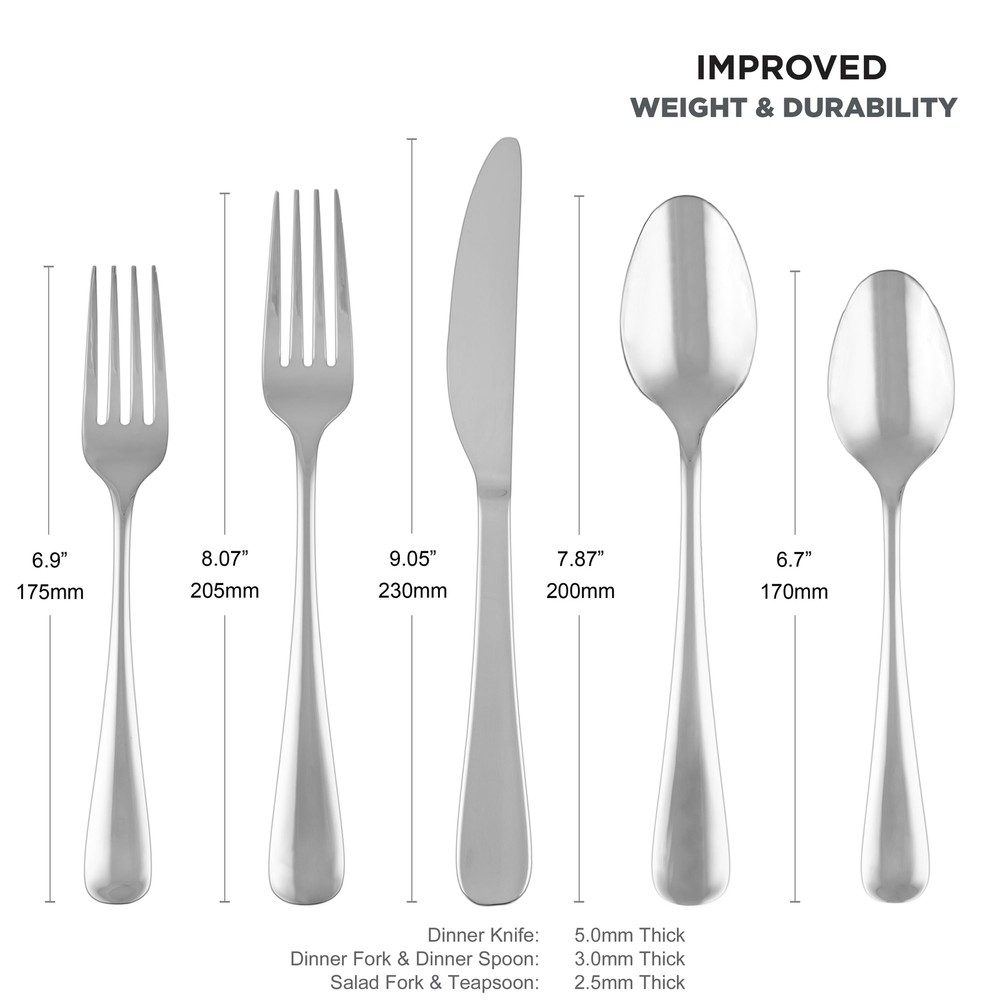The 20-Piece Stainless Steel Flatware Set (Service for 4) is designed to enhance your dining experience with its elegant style and durability. Crafted from high-quality 18/0 stainless steel with a sleek mirror finish, the set includes 4 dinner forks, 4 dinner knives, 4 dinner spoons, 4 teaspoons, and 4 salad forks. Dishwasher-safe for easy cleanup, just be sure to remove food residue before loading and avoid abrasive cleaners like steel wool or citric acid detergent. This set combines both practicality and sophistication, making it a perfect addition to your home. 20 Piece Set includes 4 dinner forks, 4 dinner knives, 4 dinner spoons, 4 teaspoons and 4 salad forks Mirror Finish 18/0 Stainless Steel Dishwasher Safe - remove any food soil prior to loading into the dishwasher. Avoid using abrasive cleaning agents such as steel wool and citric acid detergent. Do not soak, clean after use.