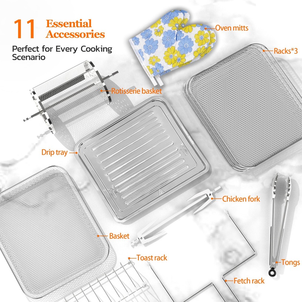 Versatile Functionality: Our spacious air fryer oven offers a wide temperature range, from a gentle 180°F to a searing 400°F. It functions as an air fryer, bake oven, grill, toaster, broiler, dehydrator, pizza grill, and oven toaster. Healthier Cooking: Embrace 'healthy fried food' with our innovative air fryer technology. Using super-hot air instead of oil reduces added fat by an impressive 85-95%, delivering crispiness while sealing in moisture. Effortless Operation: Enjoy culinary convenience with 10 smart cooking presets covering frying, baking, and dehydrating. The LED digital touch screen simplifies mode selection, while the countdown timer prevents overcooking. Safety is ensured with cool-touch casing and handles. Abundant Accessories: Transform your culinary creations effortlessly with interior lighting and a comprehensive accessory kit including a fry net basket, rotating basket, drip tray, fetch rack, dehydrating racks, chicken fork, and two oven mitts. Easy to Clean: Cleaning up is hassle-free with removable drip trays and dishwasher-safe parts. Generous Capacity: Ideal for any occasion, our air fryer boasts a generous 20-quart capacity, perfect for hosting parties or feeding a large family. ★【10-in-1 Versatility】The air fryer oven is your all-in-one kitchen solution, offering 10 preset programs to fry, bake, roast, dehydrate, reheat, and toast. With versatile accessories included, you can effortlessly cook whole chickens, fries, steaks, pizzas, kebabs, and more, all while saving counter space by replacing multiple appliances. ★【Powerful & Precise Cooking】With 1800 watts of power and 360° hot air circulation technology, this airfryer ensures perfectly crispy exteriors and juicy interiors, locking in moisture for deliciously tender results every time. ★【Non-Toxic Design】All accessories are dishwasher-safe and free from harmful coatings, PFAS, PFOA, Teflon, and BPA. You will receive 11 accessories: a rotating basket, deep basket, drip tray, fetch rack, 3 dehydrating racks, chicken fork, toast rack, tongs, and two oven mitts. ★【 Large Family Size】This air fryer measures: W14.6"xD13.4"xH15.4". Whether you're hosting a food party or cooking for a big family, our air fryer has you covered with its generous 20-quart capacity. It's ideal for preparing whole chickens and crafting various dish shapes with ease. ★【Beginners Friendly】The intuitive LED digital touch screen allows for easy, one-touch cooking, while the built-in countdown timer ensures perfectly cooked meals every time. ★【1-Year Warranty Included】Our air fryer comes with a one-year warranty, providing you with added confidence and support.